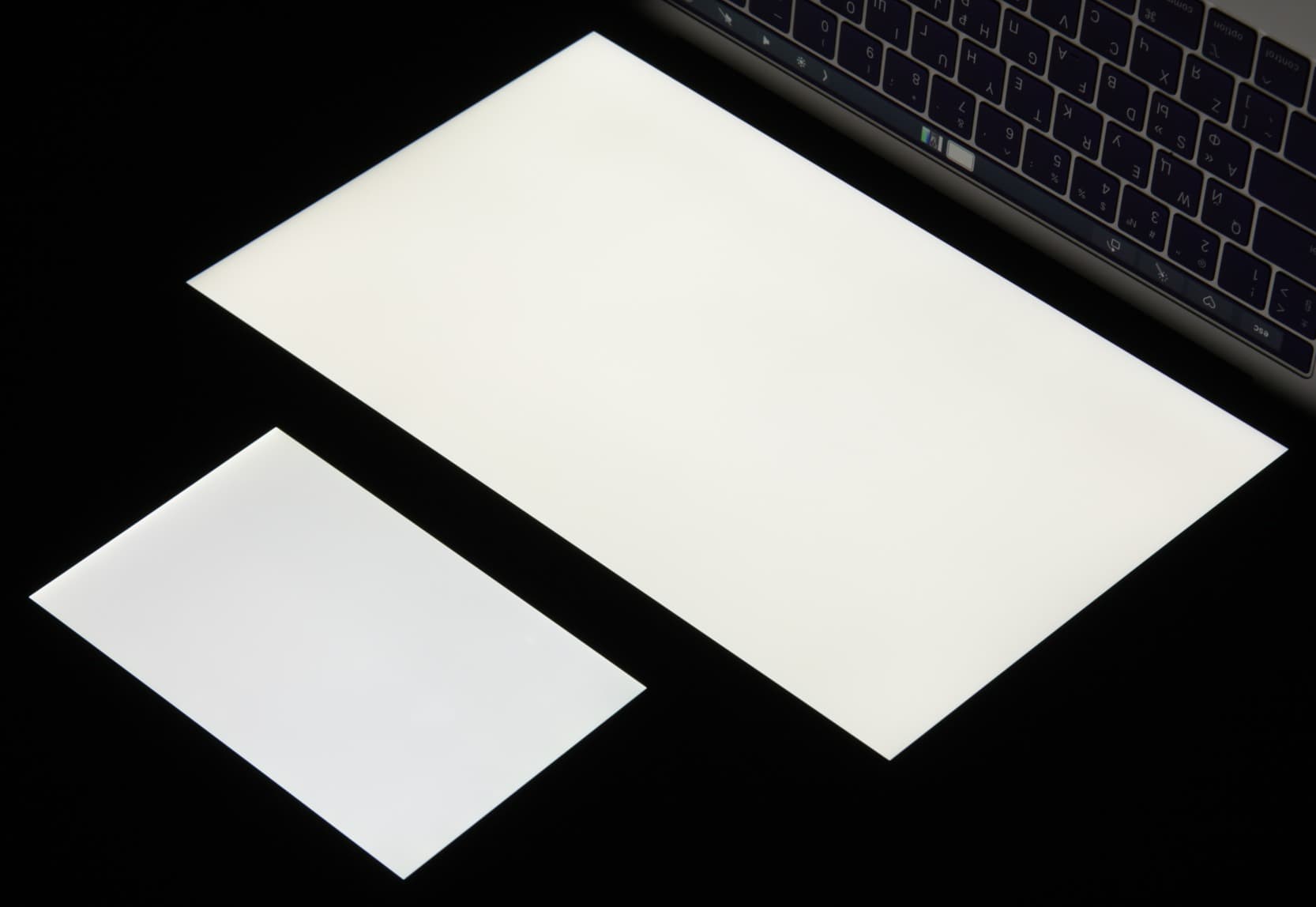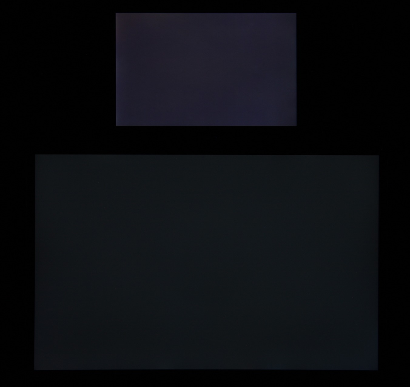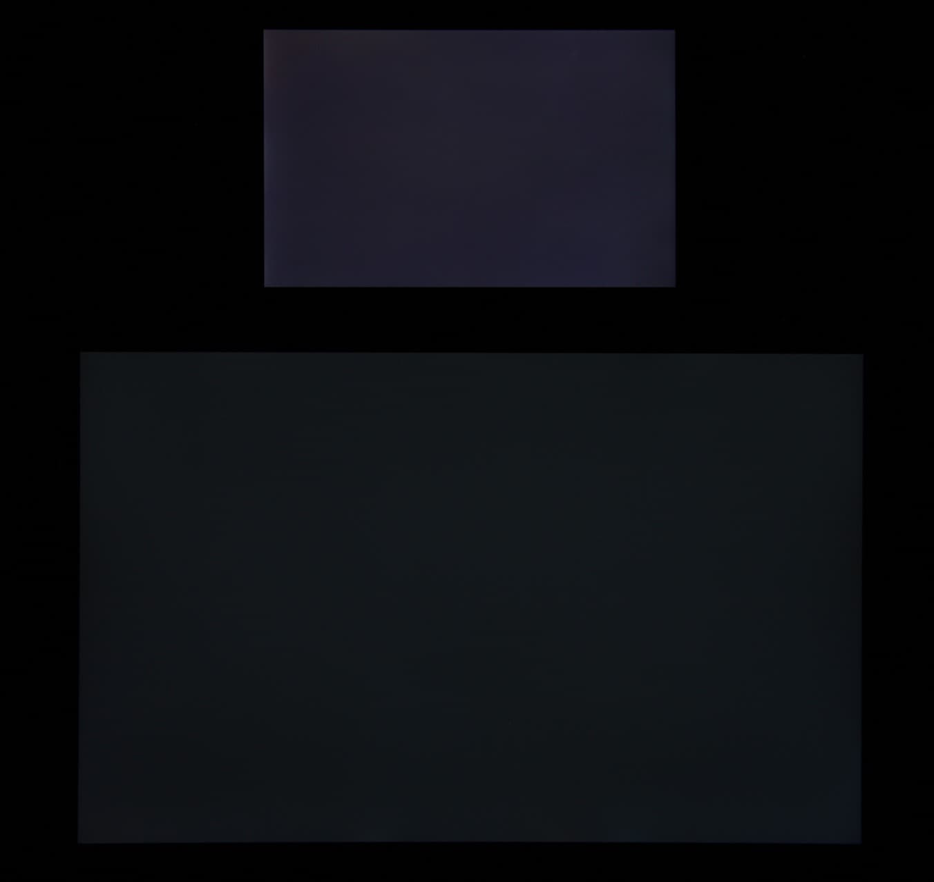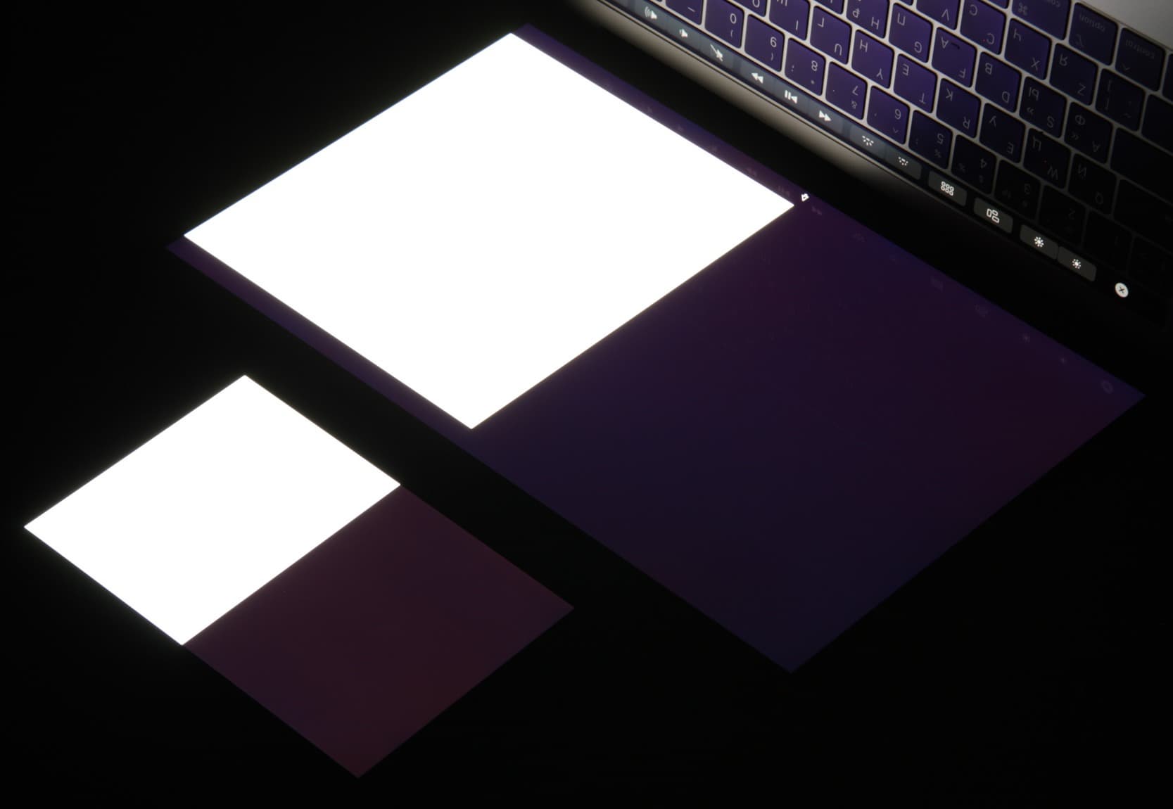 Яркость под этим углом у обоих экранов заметно уменьшилась (выдержка увеличена в 5 раз), но экран MacBook Pro все же светлее. Черное поле при отклонении по диагонали высветляется слабо и приобретает легкий красно-фиолетовый оттенок. Фотография ниже это демонстрирует (яркость белых участков в перпендикулярном плоскости экранов направлении примерно одинаковая!):