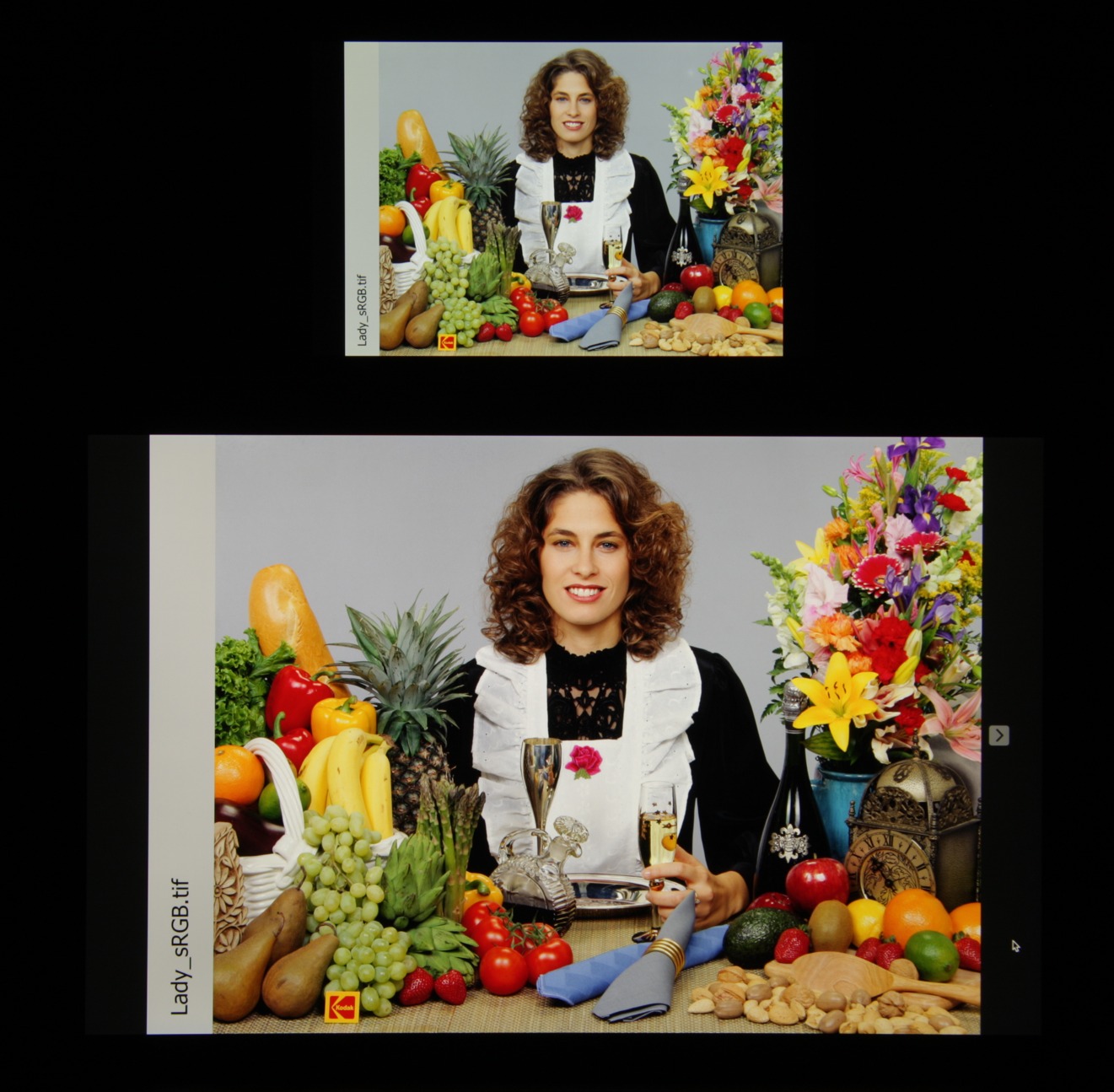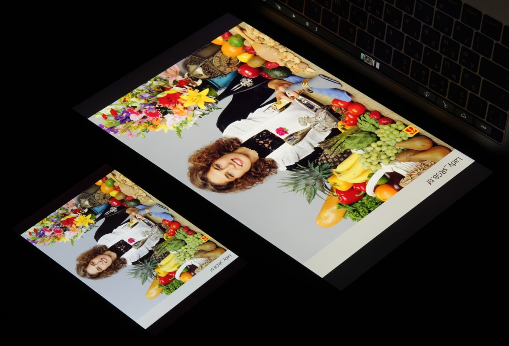 Заметим, что такие спектры встречаются в мобильных и не очень мобильных устройствах Apple и других производителей. По всей видимости, в подобных экранах используются светодиоды с синим излучателем и зеленым и красным люминофором (обычно — синий излучатель и желтый люминофор), что в сочетании со специальными светофильтрами матрицы и позволяет получить широкий цветовой охват. Да, и в красном люминофоре, видимо, используются так называемые квантовые точки. Для потребительского устройства, не поддерживающего управление цветом, широкий цветовой охват является никак не достоинством, а существенным недостатком, поскольку в итоге цвета изображений — рисунков, фотографий и фильмов, — ориентированных на пространство sRGB (а таких подавляющее большинство), имеют неестественную насыщенность. Особенно это заметно на узнаваемых оттенках, например на оттенках кожи. В данном случае управление цветом присутствует, поэтому вывод изображений, в которых прописан профиль sRGB или не прописано вообще никакого профиля, выполняется с коррекцией охвата до sRGB. В итоге визуально цвета имеют естественную насыщенность.