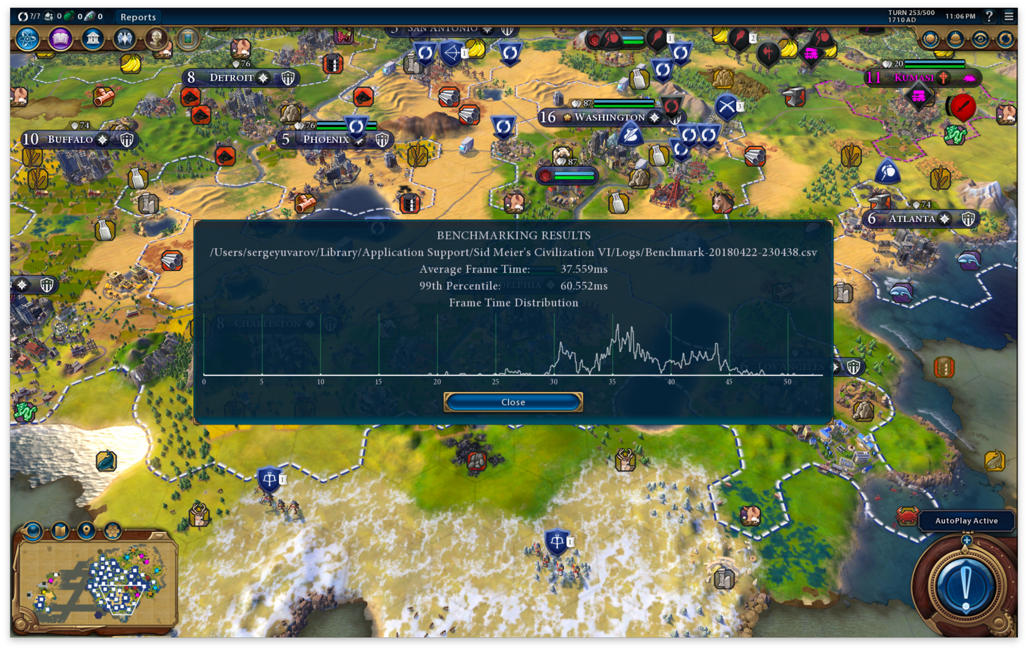 Для тестирования производительности в играх мы в новой версии методики используем встроенный бенчмарк Civilization VI. Он выводит два показателя: Average Frame Time и 99th Percentile.