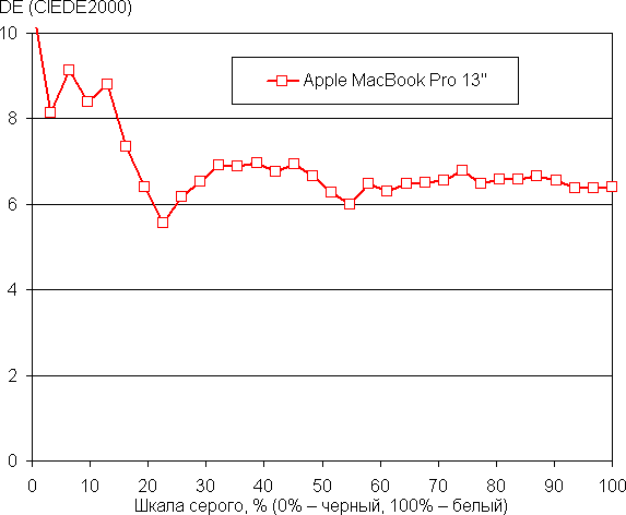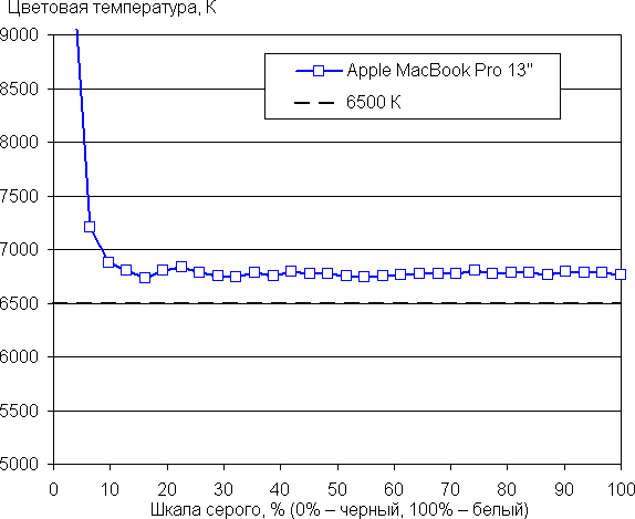 Баланс оттенков на шкале серого хороший, так как цветовая температура близка к стандартным 6500 К, а отклонение от спектра абсолютно черного тела (ΔE) меньше 10, что для потребительского устройства считается приемлемым показателем. При этом цветовая температура и ΔE мало изменяются от оттенка к оттенку — это положительно сказывается на визуальной оценке цветового баланса. (Самые темные области шкалы серого можно не учитывать, так как там баланс цветов не имеет большого значения, да и погрешность измерений цветовых характеристик на низкой яркости большая.)