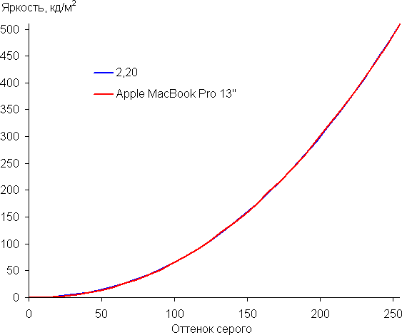 Контрастность (примерно в центре экрана) высокая — 1400:1. Время отклика при переходе черный-белый-черный равно 28 мс (14 мс вкл. + 14 мс выкл.), переход между полутонами серого 25% и 75% (по численному значению цвета) и обратно в сумме занимает 43 мс. Построенная по 32 точкам с равным интервалом по численному значению оттенка серого гамма-кривая не выявила завала ни в светах, ни в тенях. Показатель аппроксимирующей степенной функции равен 2,20, что в точности равно стандартному значению 2,2. При этом реальная гамма-кривая очень мало отклоняется от степенной зависимости: