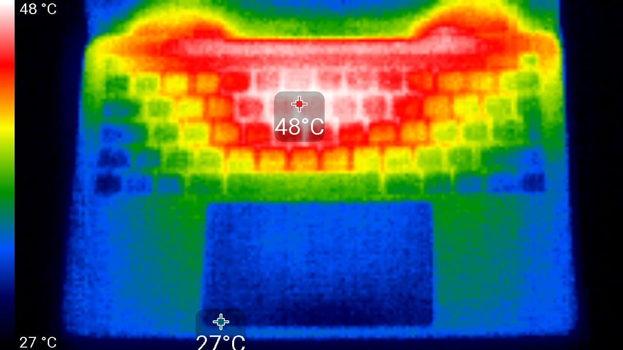 Максимальный нагрев — это область условно в центре клавиатуры. Там, где обычно находятся запястья пользователя, нагрев незначительный, что повышает комфорт от работы за ноутбуком.