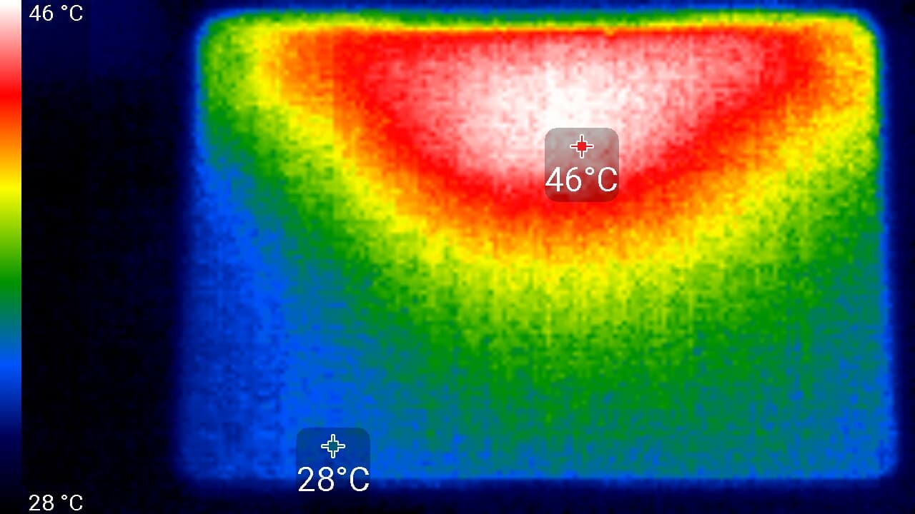 Ниже приведены теплоснимки, полученные после 15 минут работы теста аккумулятора в программе GFXBench Metal. Температура окружающей среды составляла 24 градуса.