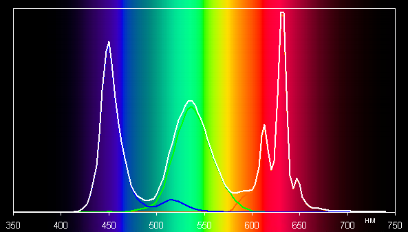 Спектры показывают, что программная коррекция в нужной степени подмешивает основные цвета друг к другу: