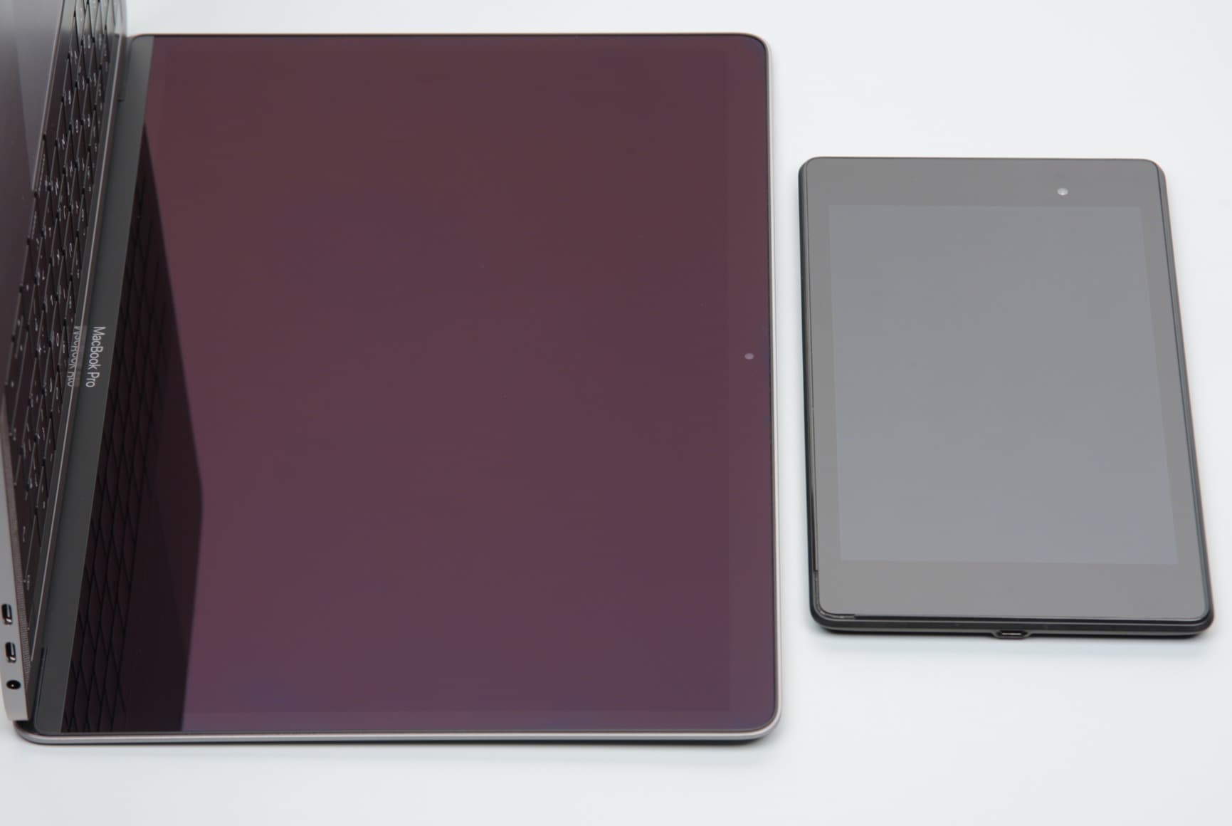 Экран имеет хорошие углы обзора без значительного сдвига цветов даже при больших отклонениях взгляда от перпендикуляра к экрану и без инвертирования оттенков. Для сравнения приведем фотографии, на которых на экраны MacBook Pro и Nexus 7 выведены одинаковые изображения, при этом яркость экранов изначально установлена примерно на 200 кд/м² (по белому полю во весь экран), а цветовой баланс на фотоаппарате принудительно переключен на 6500 К. Перпендикулярно к экранам белое поле: