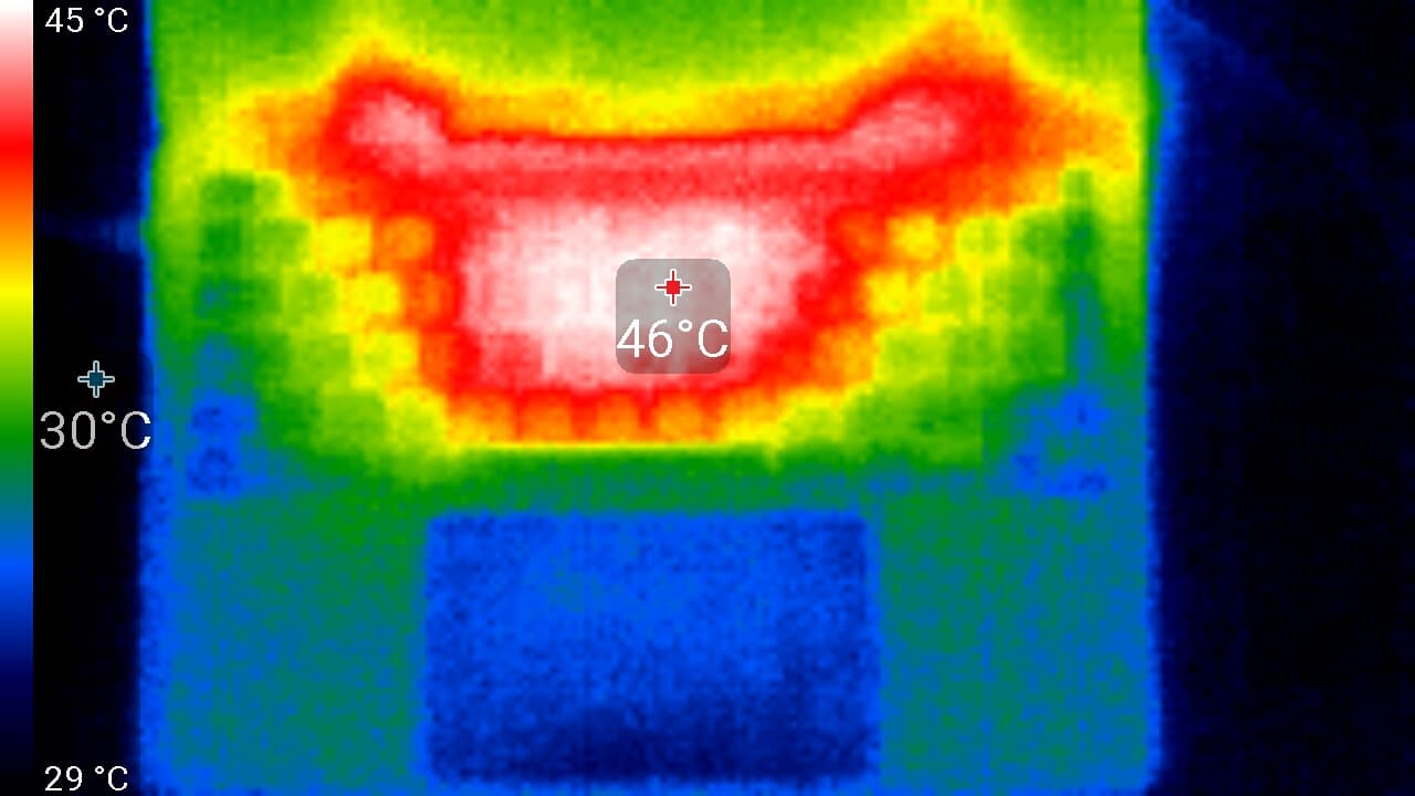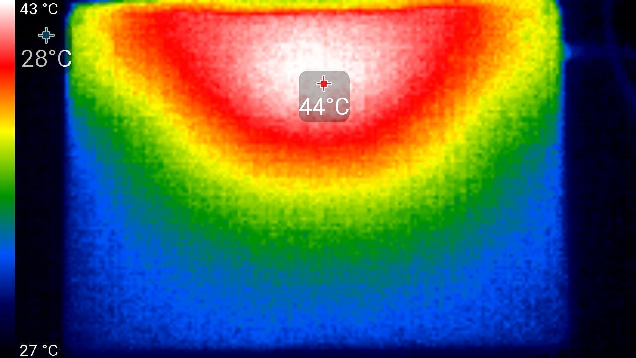 Максимальный нагрев — это три области: условно в центре клавиатуры и выше правее и левее, где выходит горячий воздух. Там, где обычно находятся запястья пользователя, нагрев незначительный, что повышает комфорт от работы за ноутбуком.