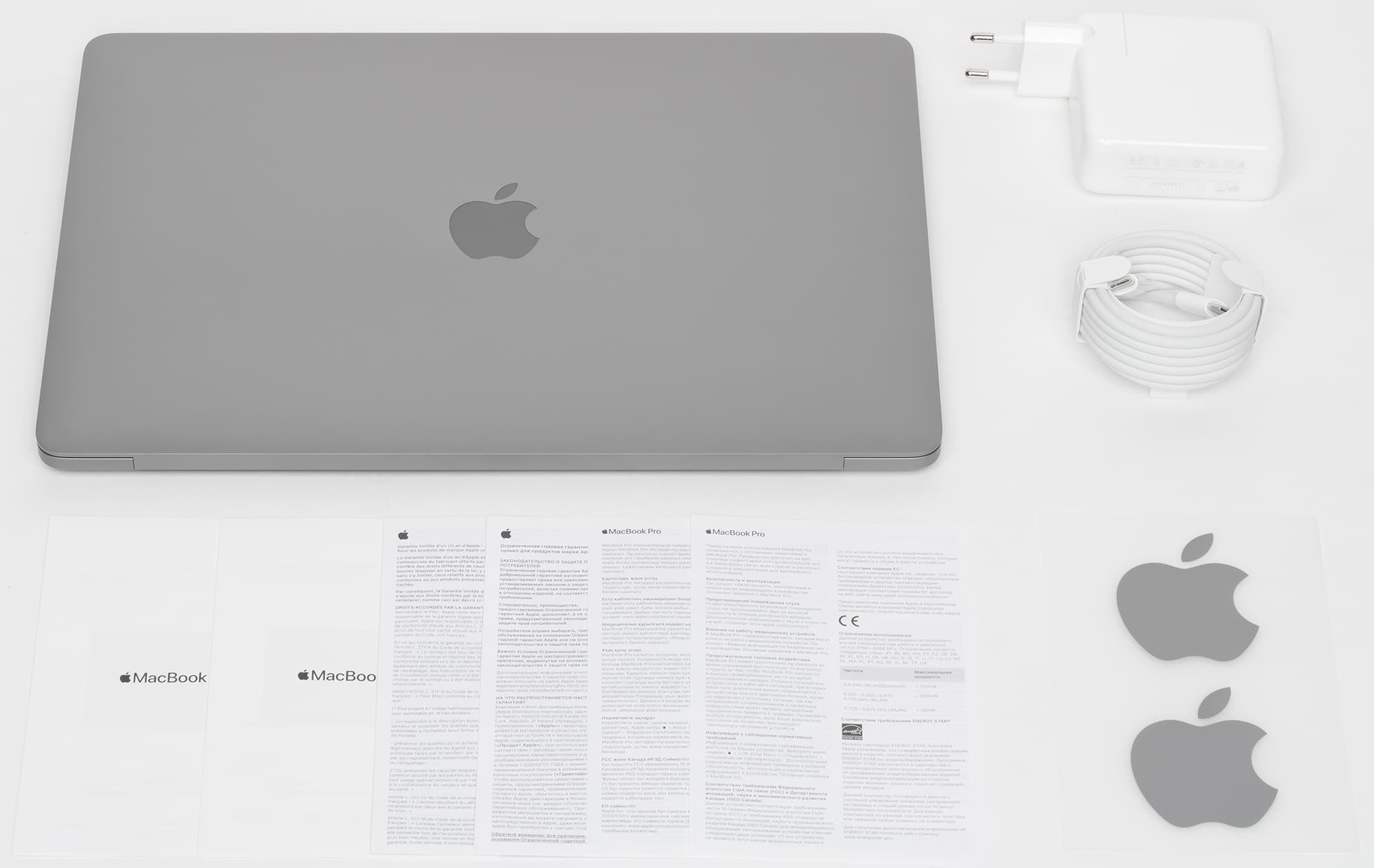 Внутри тоже никаких сюрпризов. Кабель с разъемами USB-C на обоих концах, зарядное устройство средней мощности 60 Вт с разъемом USB-C, листовки и наклейки-яблочки.