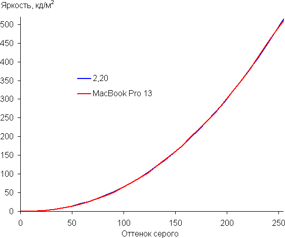 Видно, что в этом случае никакого программного перекрестного подмешивания компонент не происходит, то есть это цветовое пространство является родным для экрана MacBook Pro.