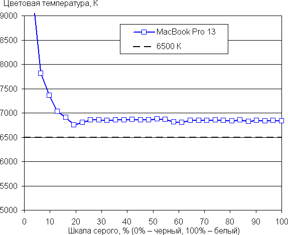 Баланс оттенков на шкале серого хороший, так как цветовая температура близка к стандартным 6500 К, а отклонение от спектра абсолютно черного тела (ΔE) меньше 10, что для потребительского устройства считается приемлемым показателем. При этом цветовая температура и ΔE мало изменяются от оттенка к оттенку — это положительно сказывается на визуальной оценке цветового баланса. (Самые темные области шкалы серого можно не учитывать, так как там баланс цветов не имеет большого значения, да и погрешность измерений цветовых характеристик на низкой яркости большая.)
