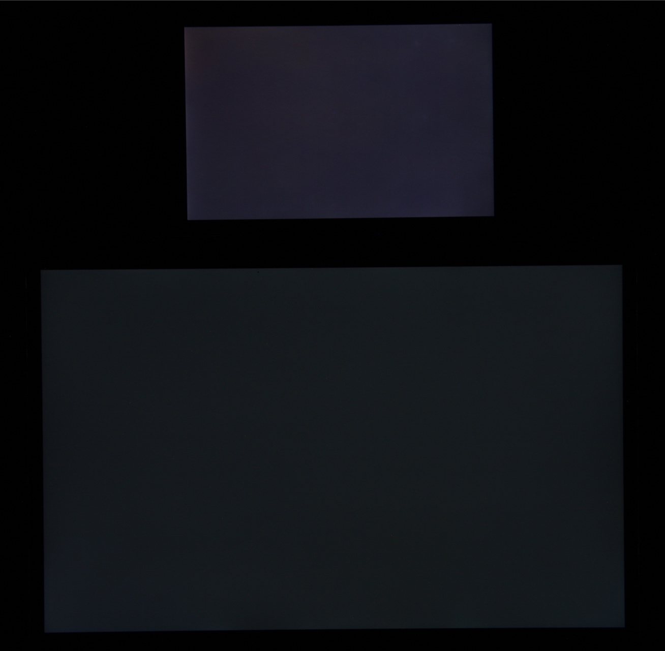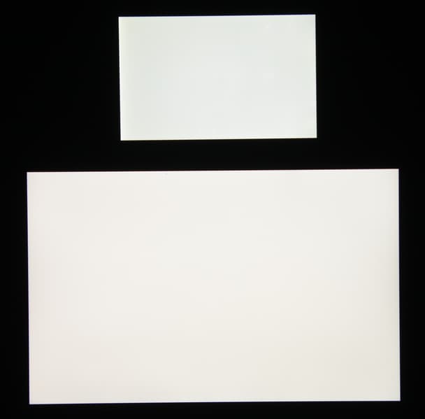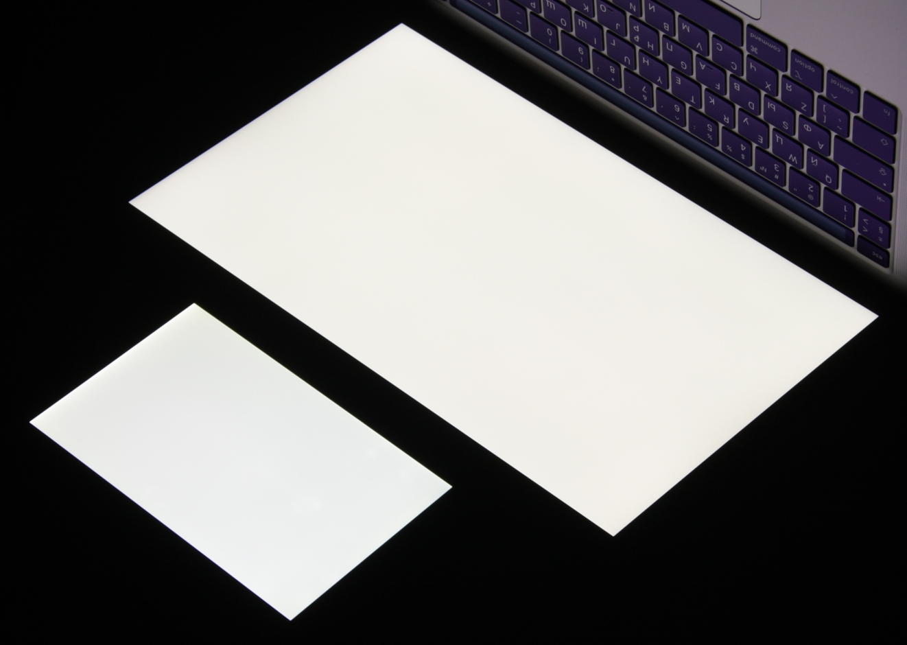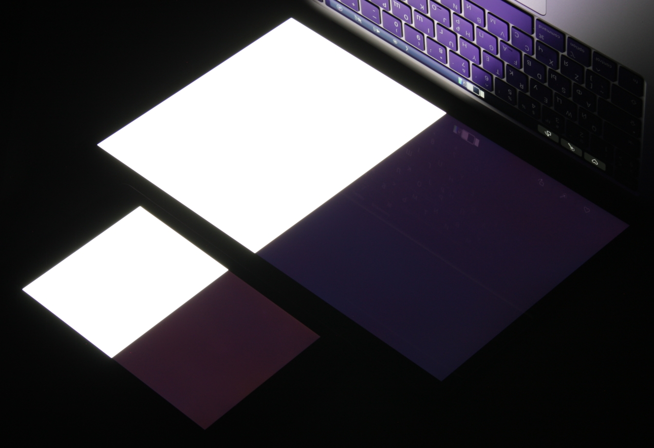 Яркость под этим углом у обоих экранов заметно уменьшилась (выдержка увеличена в 5 раз), но экран MacBook Pro все же немного светлее. Черное поле при отклонении по диагонали высветляется слабо и приобретает легкий красно-фиолетовый оттенок. Фотография ниже это демонстрирует (яркость белых участков в перпендикулярном плоскости экранов направлении примерно одинаковая!):