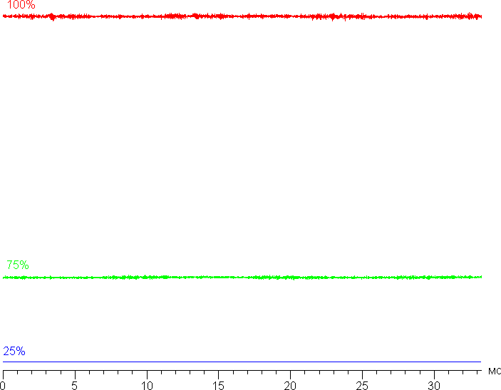Контрастность (примерно в центре экрана) высокая — 1300:1. Время отклика при переходе черный-белый-черный равно 34 мс (18 мс вкл. + 16 мс выкл.), переход между полутонами серого 25% и 75% (по численному значению цвета) и обратно в сумме занимает 51 мс. Построенная по 32 точкам с равным интервалом по численному значению оттенка серого гамма-кривая не выявила завала ни в светах, ни в тенях. Показатель аппроксимирующей степенной функции равен 2,20, что в точности равно стандартному значению 2,2. При этом реальная гамма-кривая мало отклоняется от степенной зависимости: