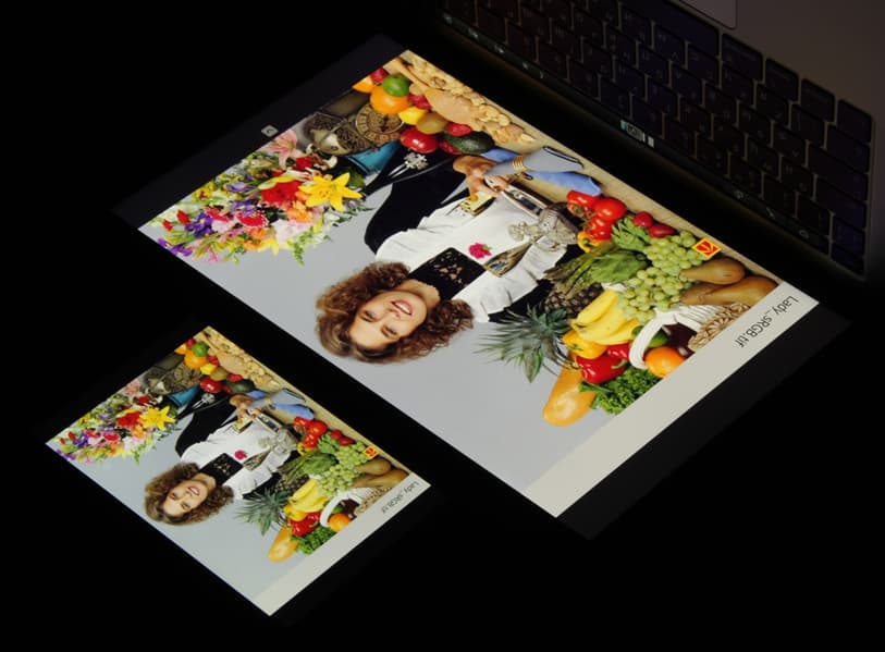 Заметим, что такие спектры встречаются в мобильных и не очень мобильных устройствах Apple и других производителей. По всей видимости, в подобных экранах используются светодиоды с синим излучателем и зеленым и красным люминофором (обычно — синий излучатель и желтый люминофор), что в сочетании со специальными светофильтрами матрицы и позволяет получить широкий цветовой охват. Да, и в красном люминофоре, видимо, используются так называемые квантовые точки. Для потребительского устройства, не поддерживающего управление цветом, широкий цветовой охват является никак не достоинством, а существенным недостатком, поскольку в итоге цвета изображений — рисунков, фотографий и фильмов, — ориентированных на пространство sRGB (а таких подавляющее большинство), имеют неестественную насыщенность. Особенно это заметно на узнаваемых оттенках, например на оттенках кожи. В данном случае управление цветом присутствует, поэтому вывод изображений, в которых прописан профиль sRGB или не прописано вообще никакого профиля, выполняется с коррекцией охвата до sRGB. В итоге визуально цвета имеют естественную насыщенность.