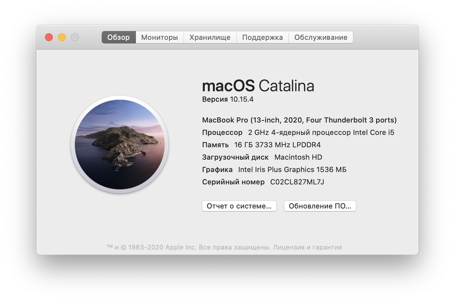Итак, основа ноутбука, попавшего к нам на тест, — четырехъядерный процессор Intel Core i5-1038NG7 (10-го поколения, прежнее кодовое название Ice Lake), выполненный по техпроцессу 10 нм. Базовая частота — 2 ГГц, в режиме Turbo Boost она может повышаться до 3,8 ГГц. Размер кэша L3 этого процессора составляет 6 МБ, а расчетная максимальная мощность — 28 Вт. В процессор интегрировано графическое ядро Intel Iris Plus Graphics, дискретной графики в 13-дюймовых MacBook Pro не бывает.