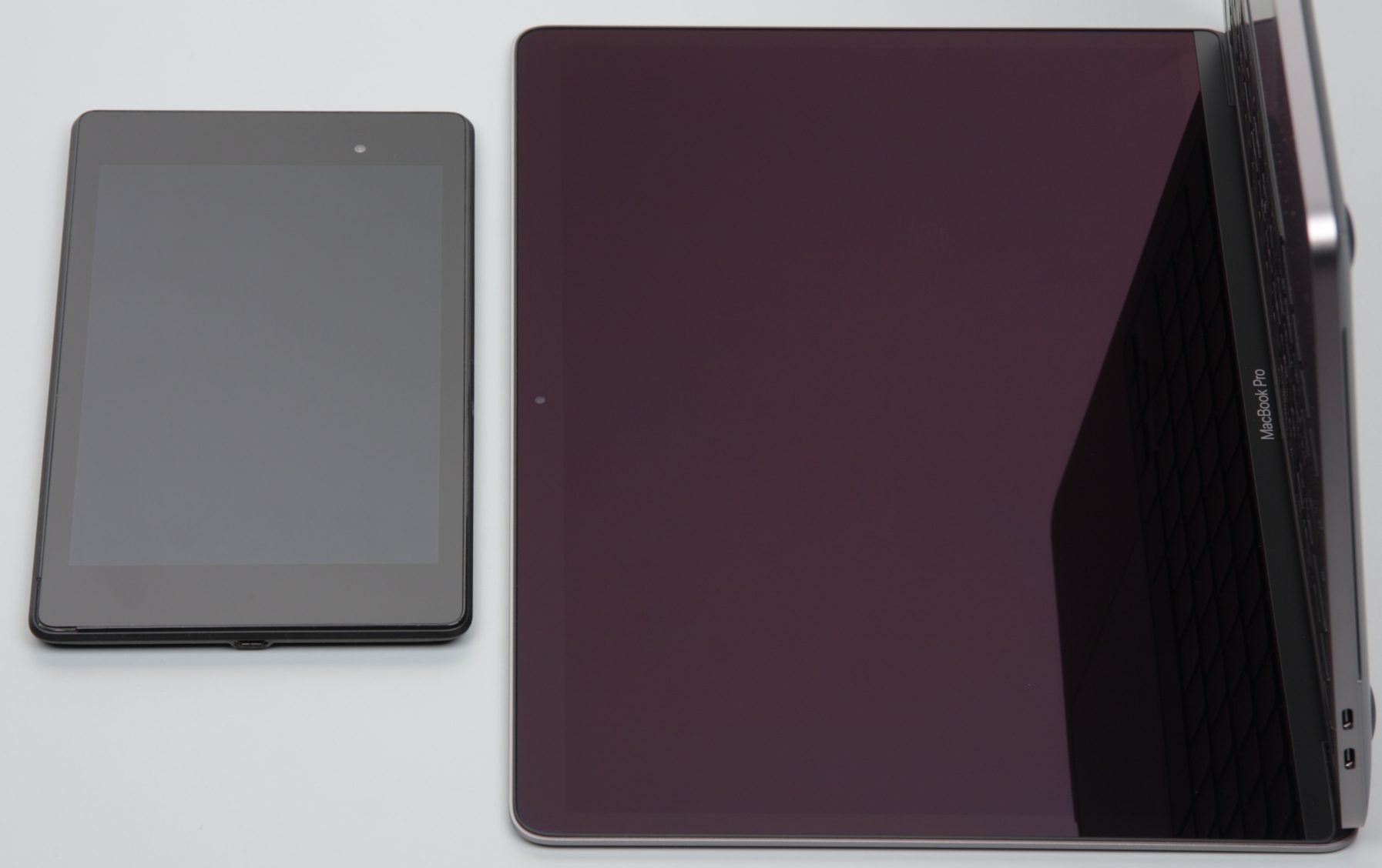 Экран имеет хорошие углы обзора без значительного сдвига цветов даже при больших отклонениях взгляда от перпендикуляра к экрану и без инвертирования оттенков. Для сравнения приведем фотографии, на которых на экраны MacBook Pro и Nexus 7 выведены одинаковые изображения, при этом яркость экранов изначально установлена примерно на 200 кд/м² (по белому полю во весь экран), а цветовой баланс на фотоаппарате принудительно переключен на 6500 К. Перпендикулярно к экранам белое поле: