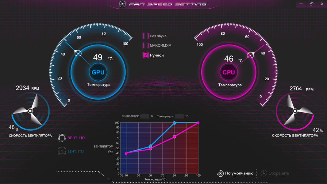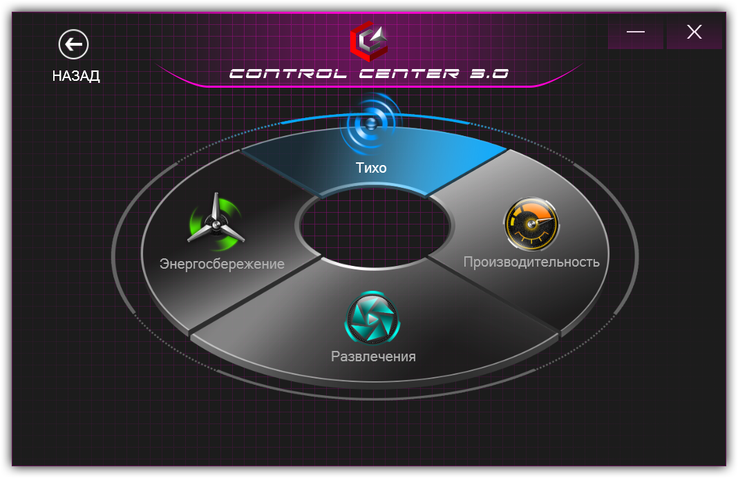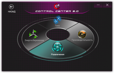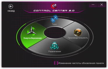 В установочном наборе обнаруживается фирменная утилита Control Center. Она запускается при старте Windows и остается резидентной, обеспечивая возможности управления некоторыми параметрами. На русский язык утилита переведена не полностью, и кое-где заметны огрехи из-за несоответствия перевода оригиналу. Первая и наиболее важная часть для наших испытаний — раздел Power Modes, дающий возможность выбирать сценарий (профиль) потребления. Профили представлены четырьмя комплектами пресетов.