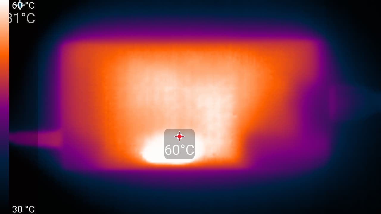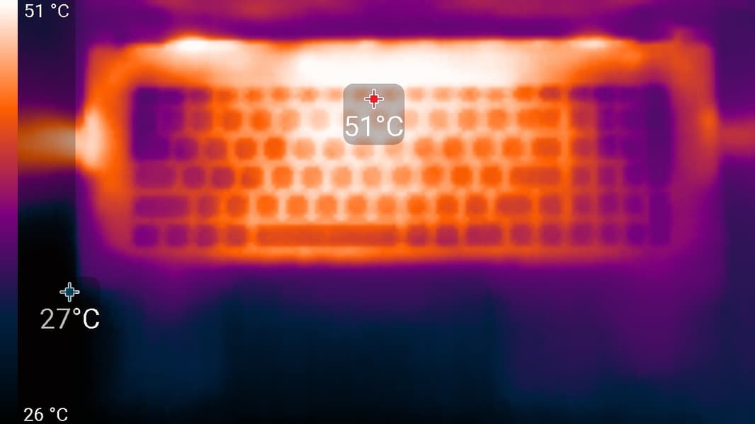 Внутренний объем ноутбука использован для целей охлаждения с максимальной эффективностью, и движение воздушных масс в трактах происходит одновременно в шести направлениях: относительно холодный забортный воздух поступает двумя потоками через отверстия в днище, а выброс горячего производится вентиляторами через четыре радиатора и их решетки (две назад, направо и налево).