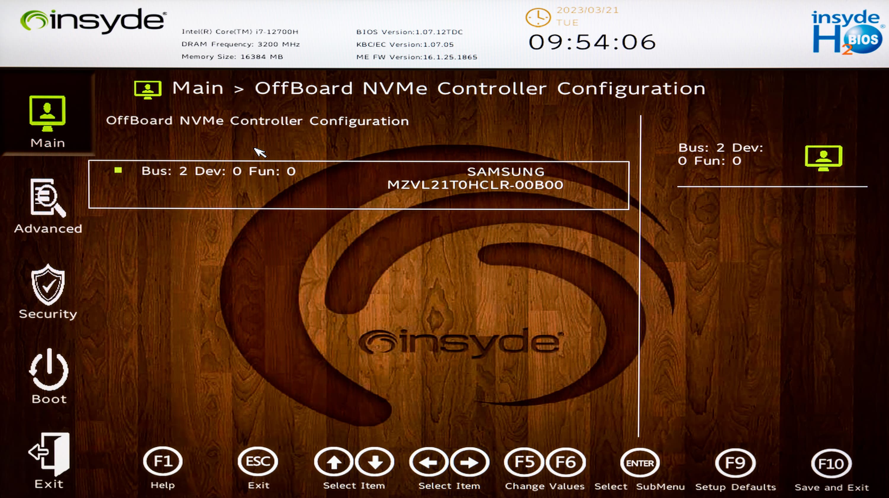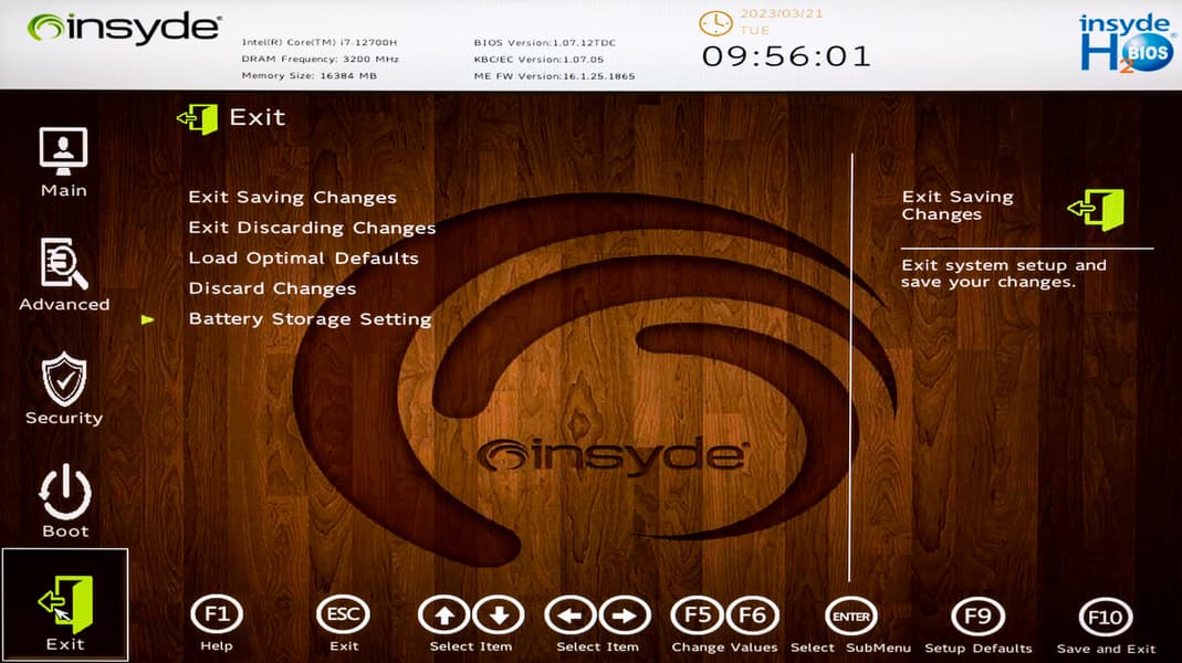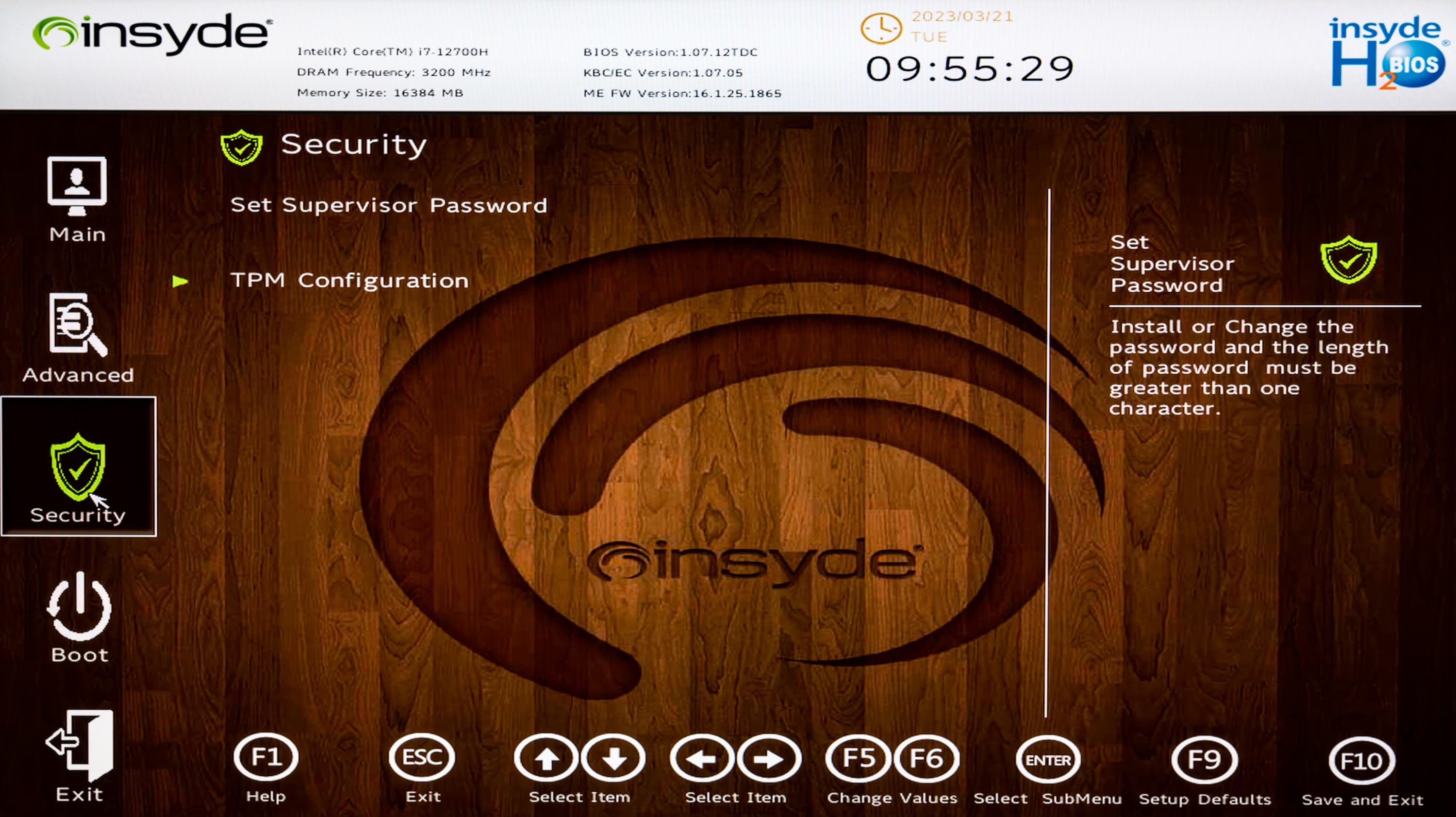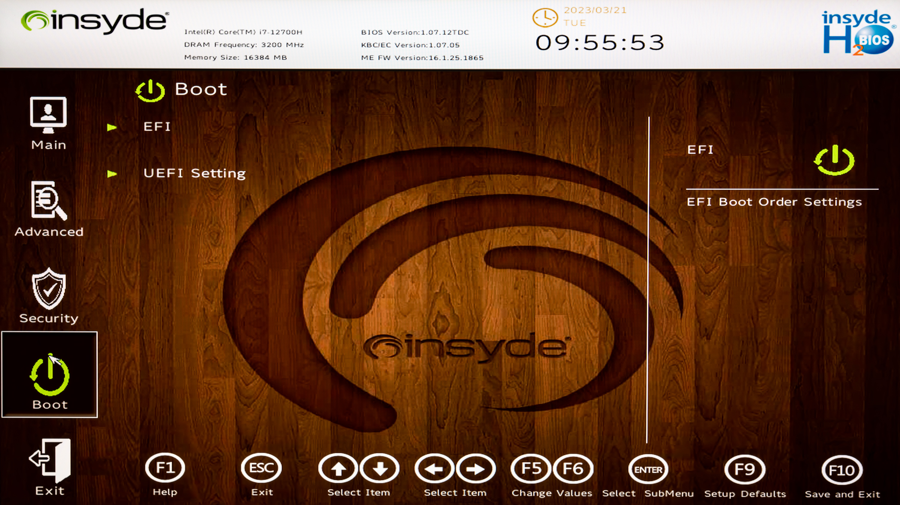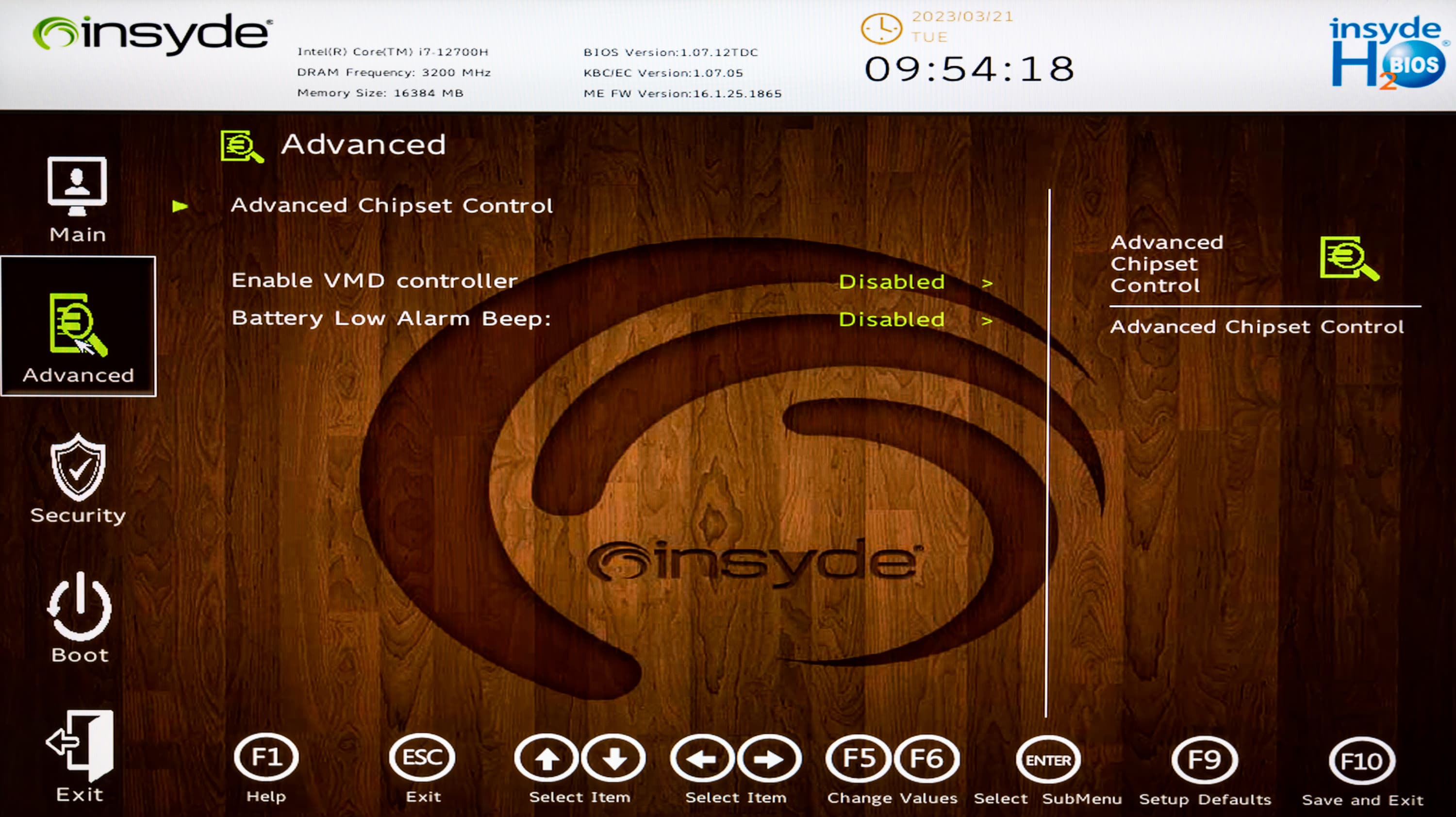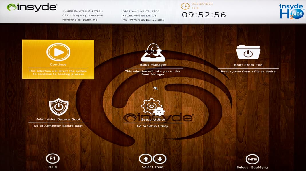 Управление начальными установками инициализации системы реализовано компанией Insyde. Утилита вызывается нажатием F2 в ходе перезапуска системы. Возможности функционально объединены в виде четырех разделов: