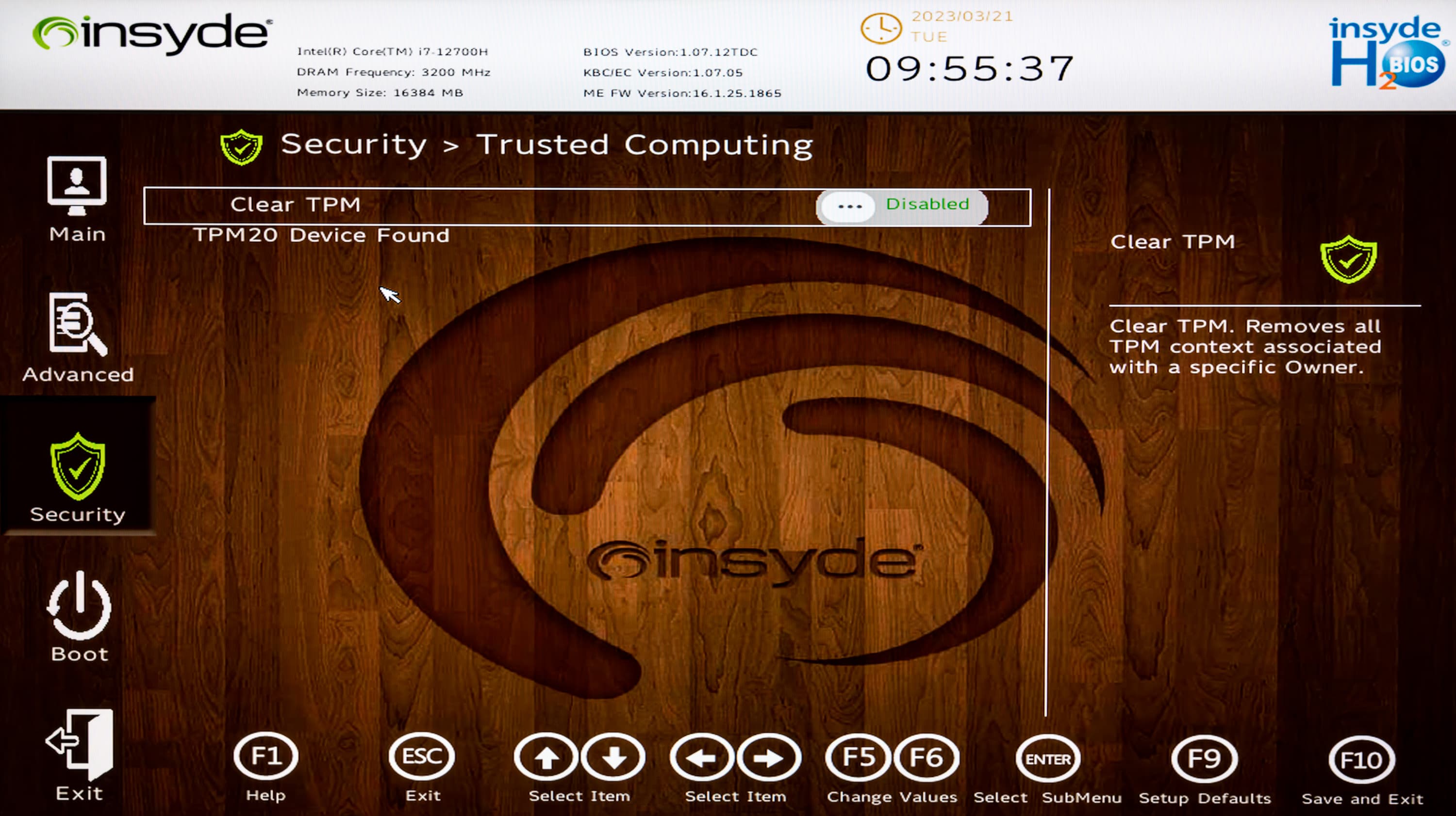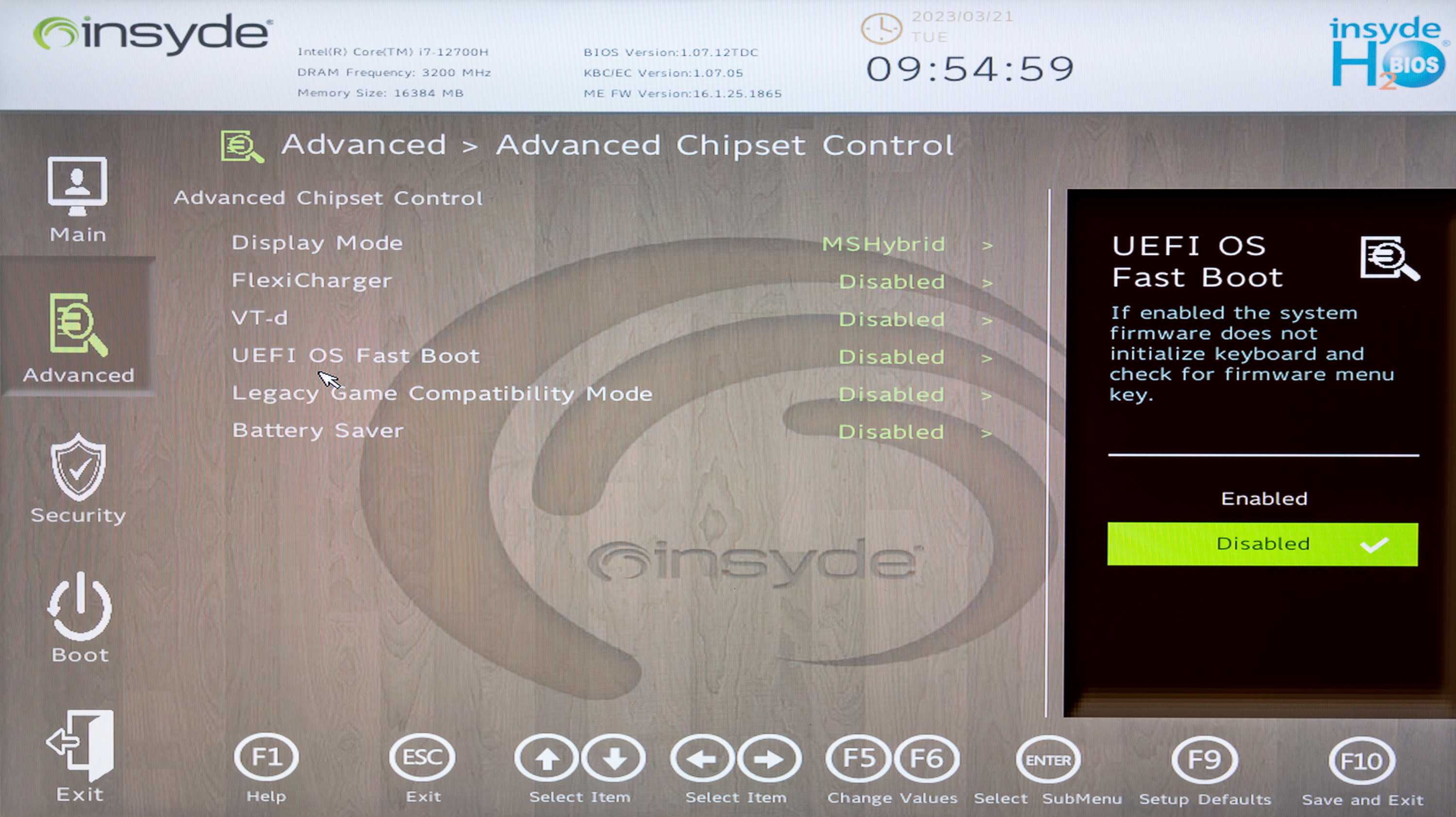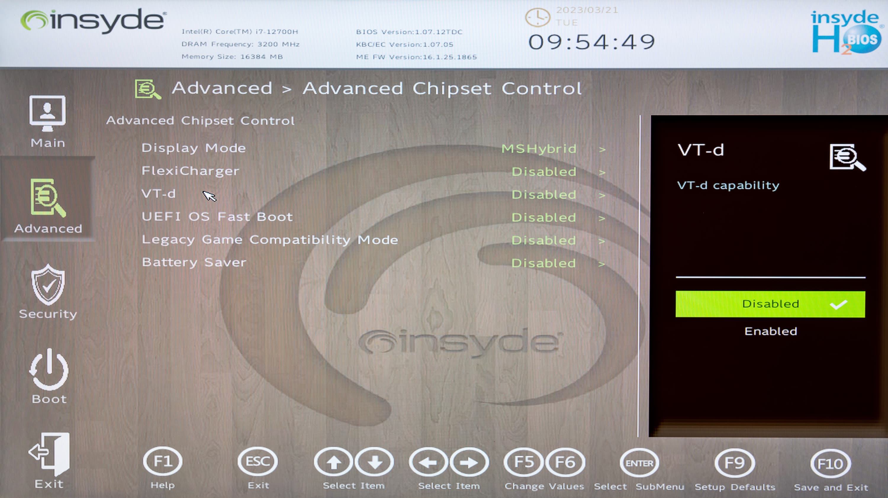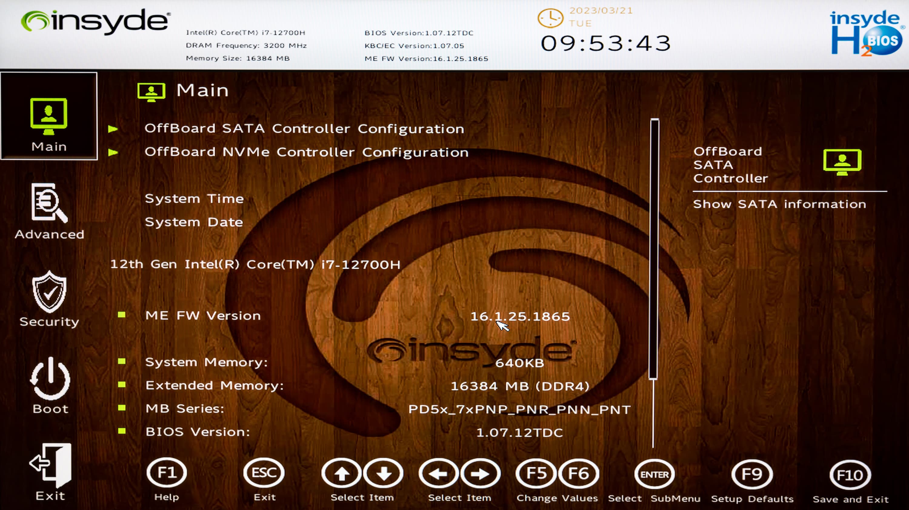 Управление начальными установками инициализации системы реализовано компанией Insyde. Утилита вызывается нажатием F2 в ходе перезапуска системы. Возможности функционально объединены в виде четырех разделов: