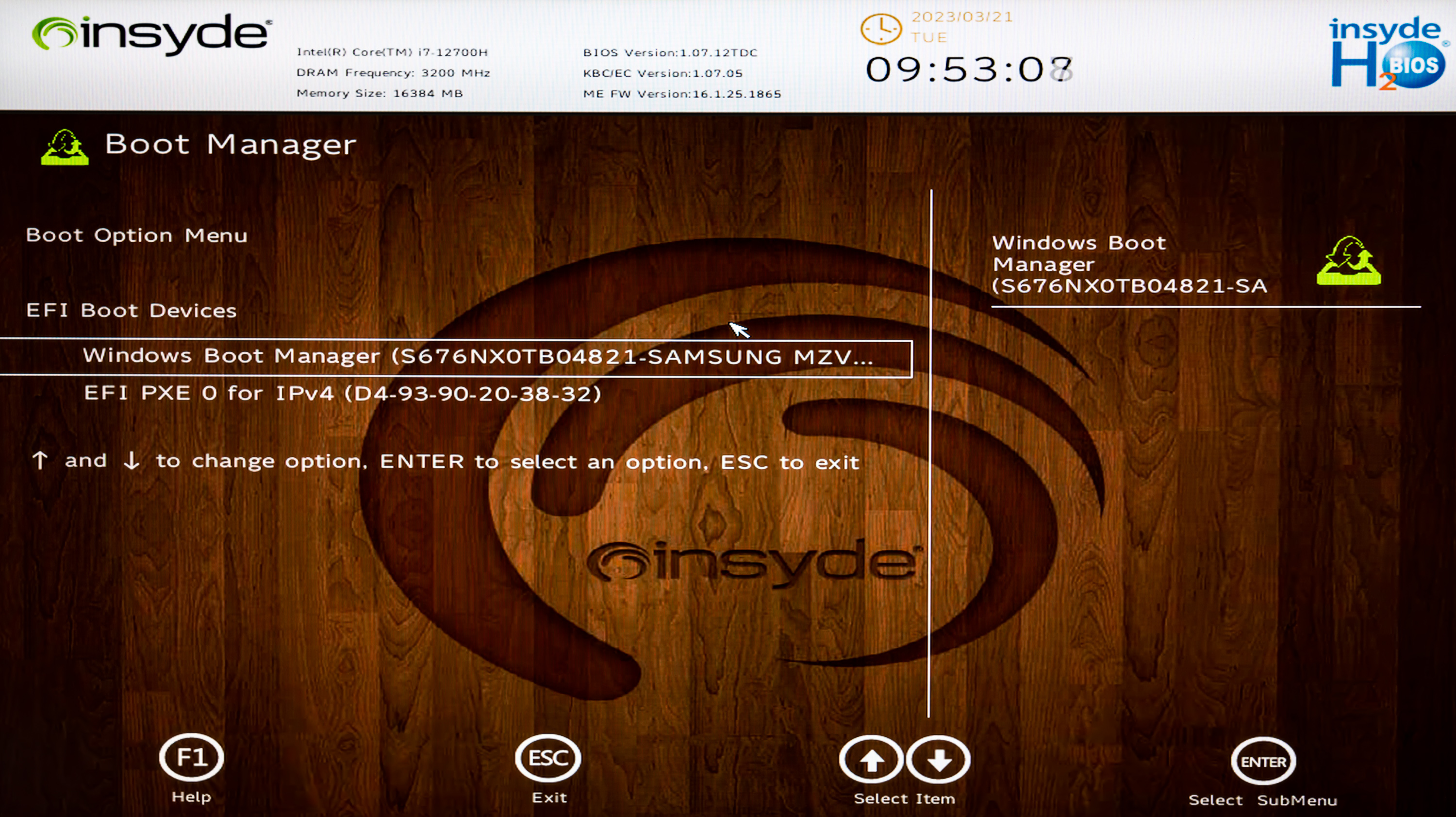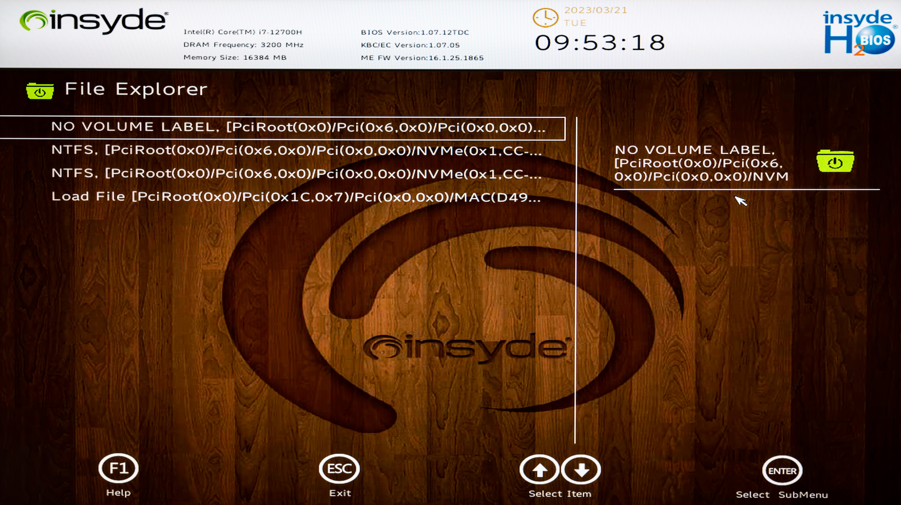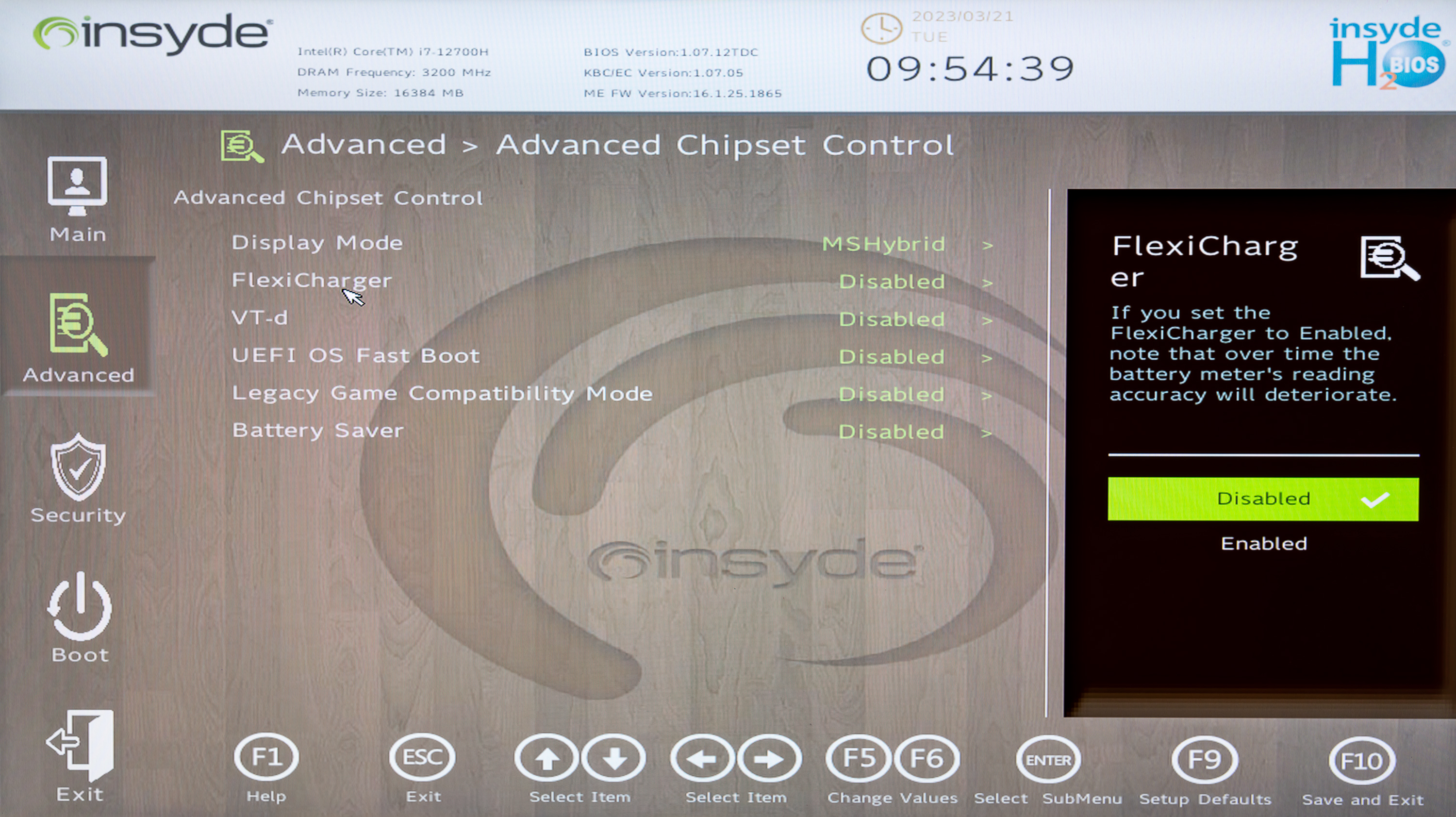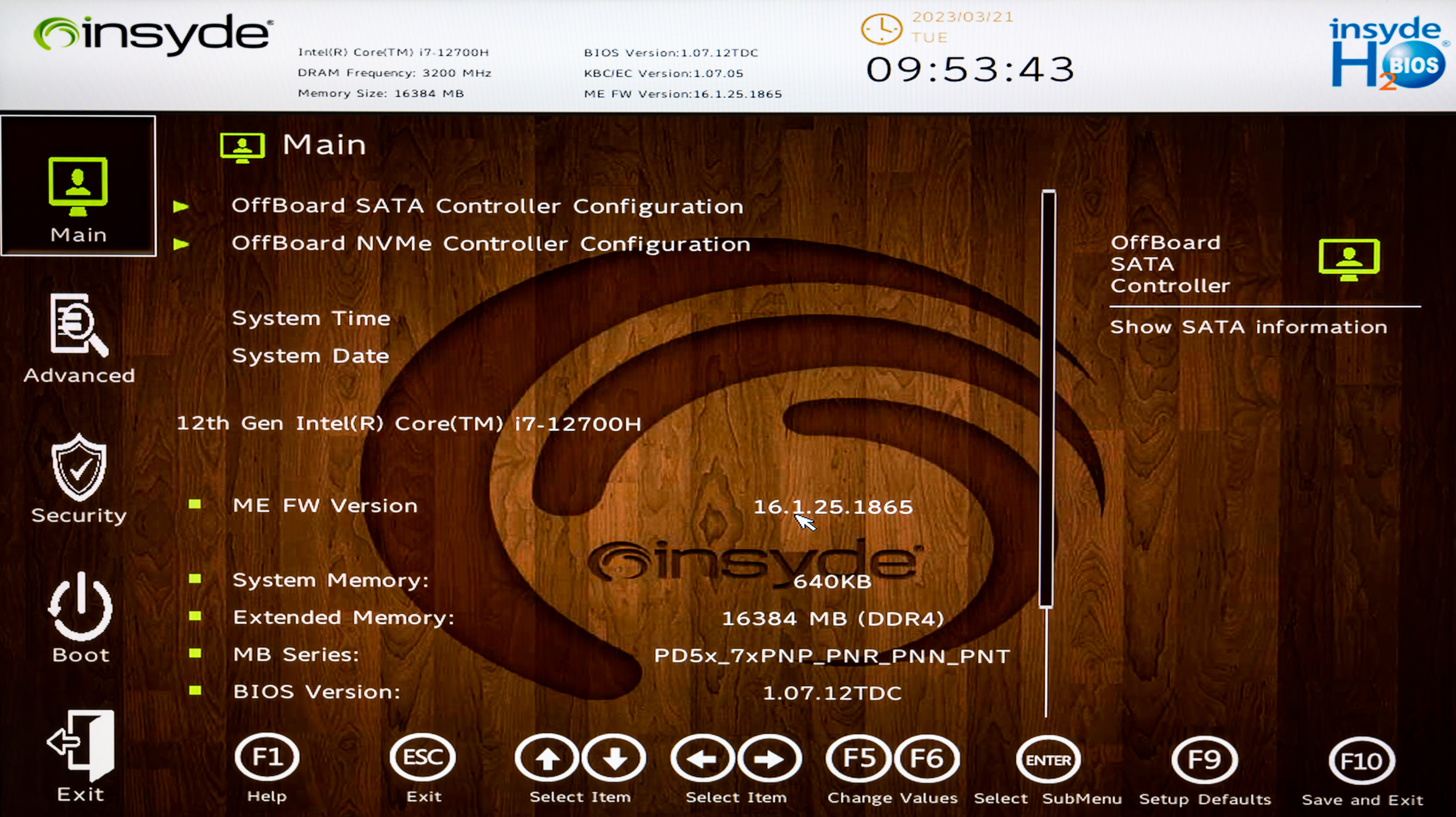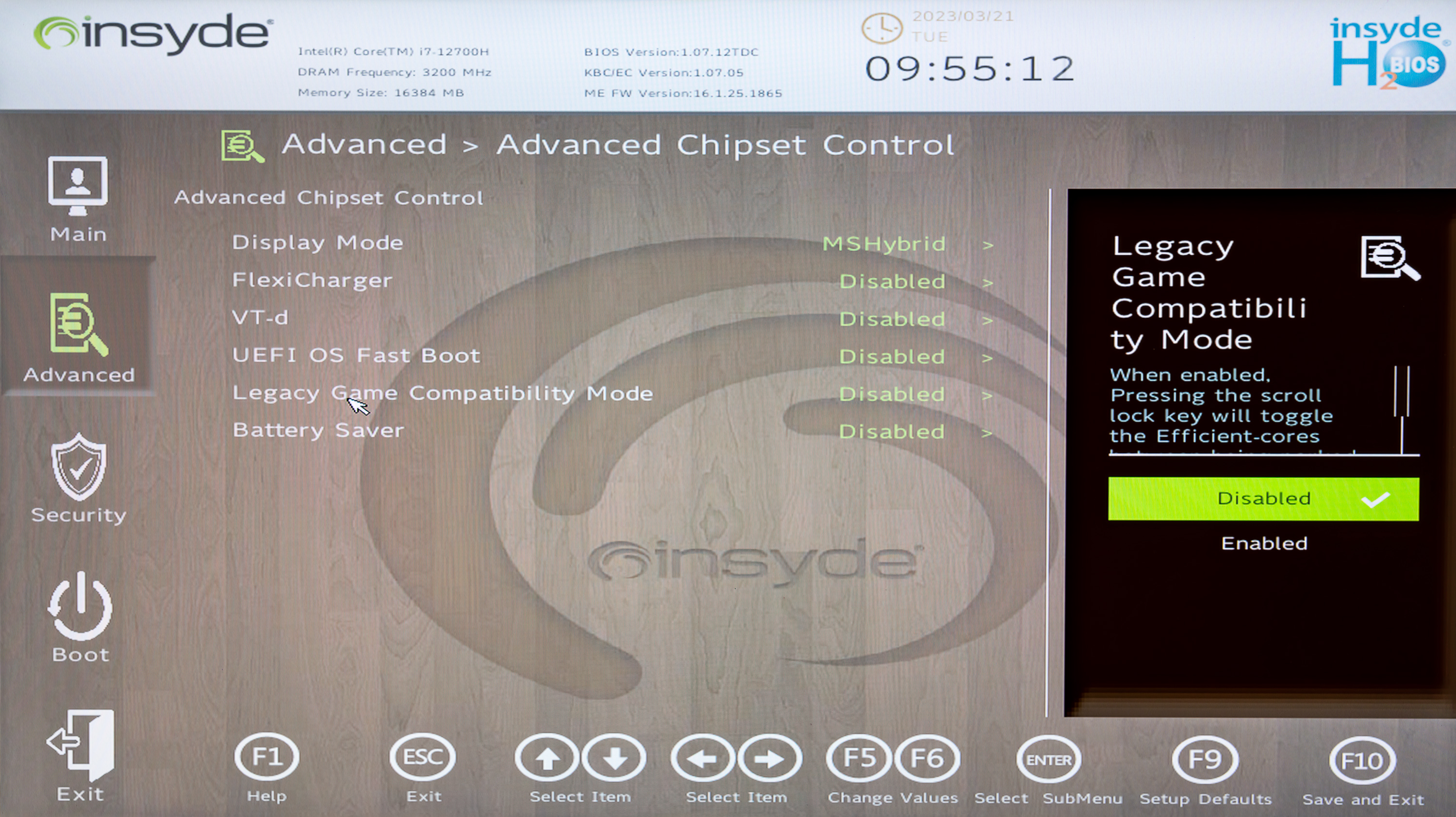 Управление начальными установками инициализации системы реализовано компанией Insyde. Утилита вызывается нажатием F2 в ходе перезапуска системы. Возможности функционально объединены в виде четырех разделов: