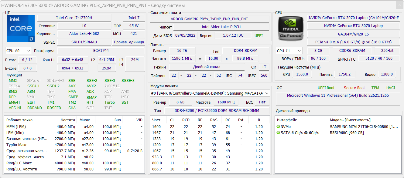 | Процессор | Intel Core i7-12700H ( (6+8 ядер/20 потоков, 3,5/4,7 ГГц, TDP 45/115 Вт) | |
