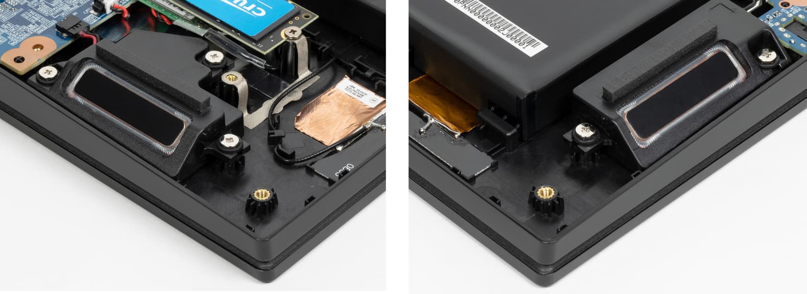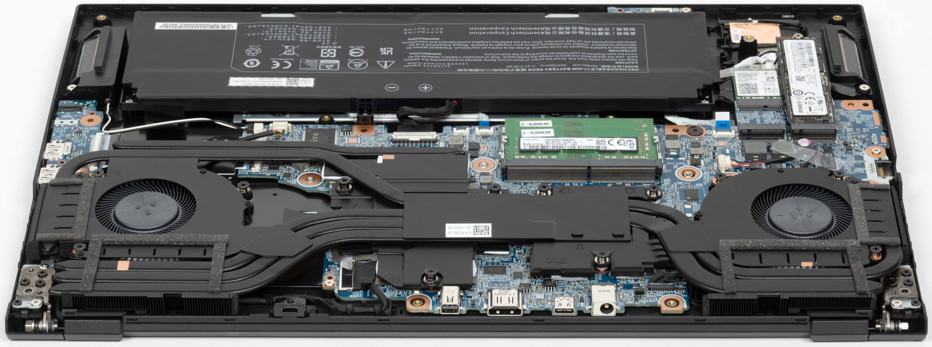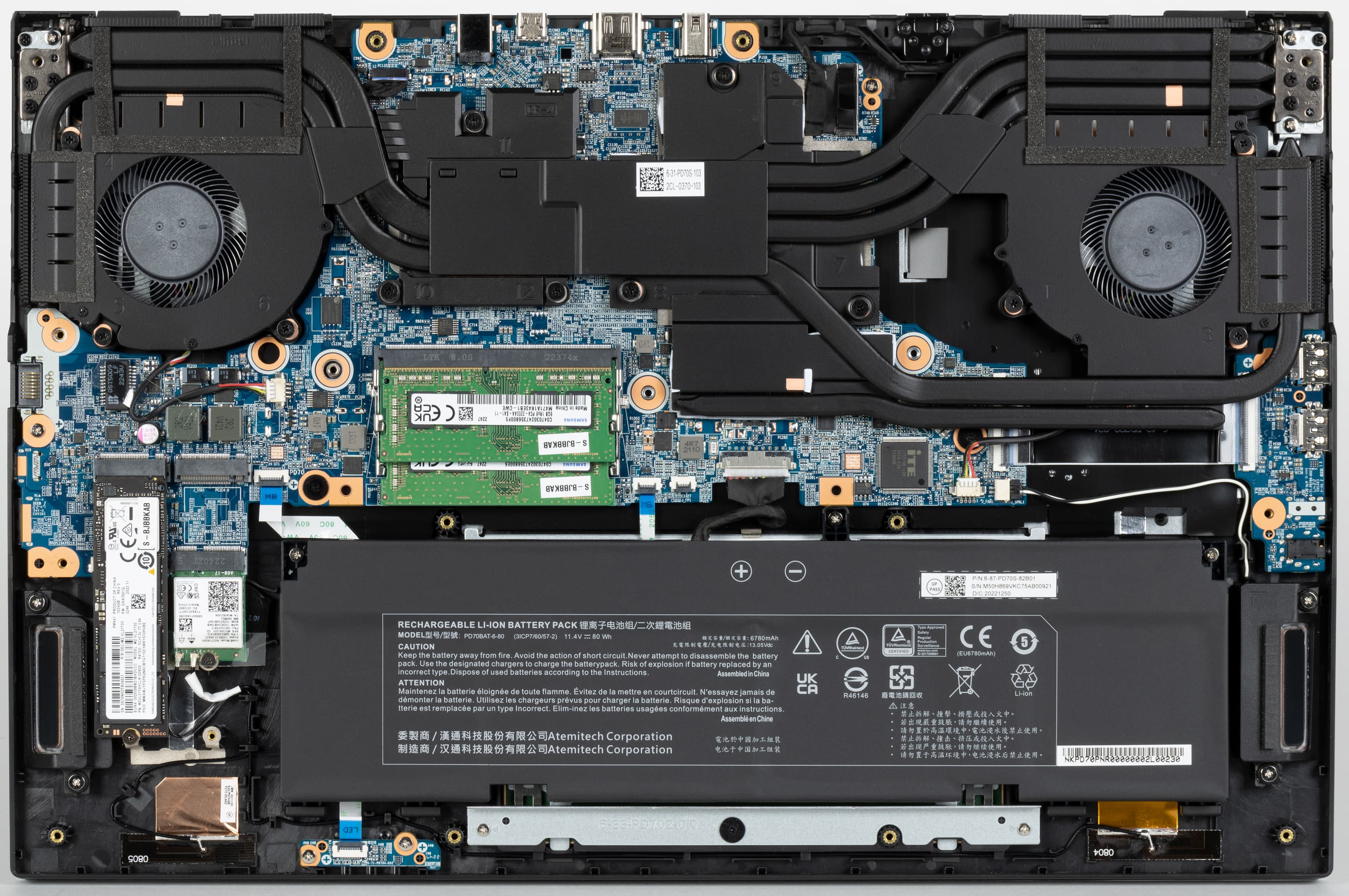 Теперь поинтересуемся возможностями апгрейда системы. Потенциал здесь хороший: пользователь может изменить качественное и количественное наполнение обоих слотов оперативной памяти, доведя ее объем до максимума 64 ГБ, установить дополнительный SSD во второй свободный слот M.2, а также заменить системный накопитель, адаптер Wi-Fi и питающую батарею.