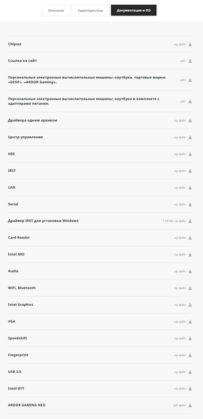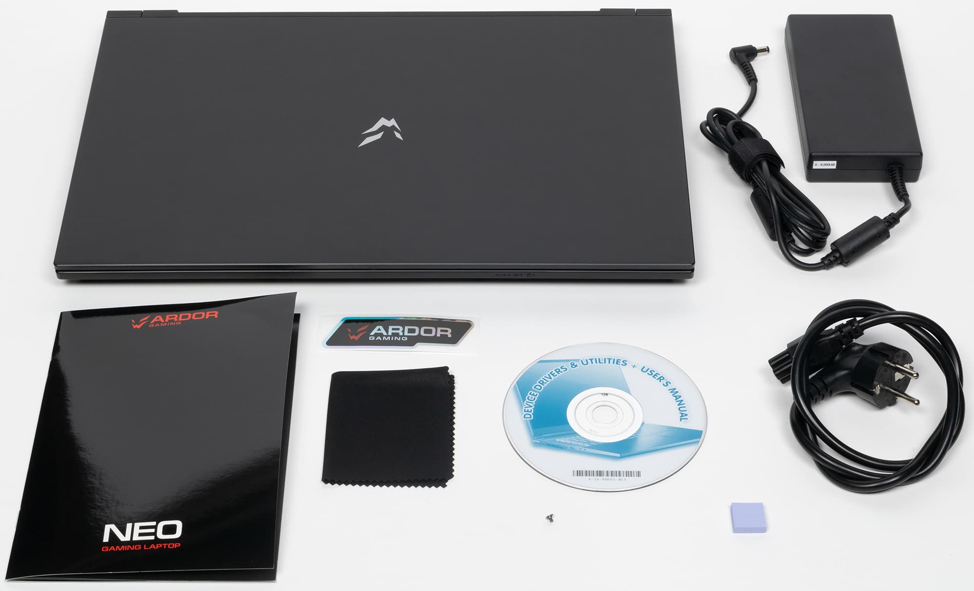 В комплекте поставляются: 230-ваттный адаптер питания (100—240 В, 50/60 Гц на входе, 20 В на выходе), руководство пользователя, салфетка для очистки поверхностей,компакт-диск с драйверами и утилитами, (для чтения которого в Ardor Gaming Neo G17 нет привода), а также фирменная наклейка, прокладка и винт для установки дополнительного накопителя M.2.