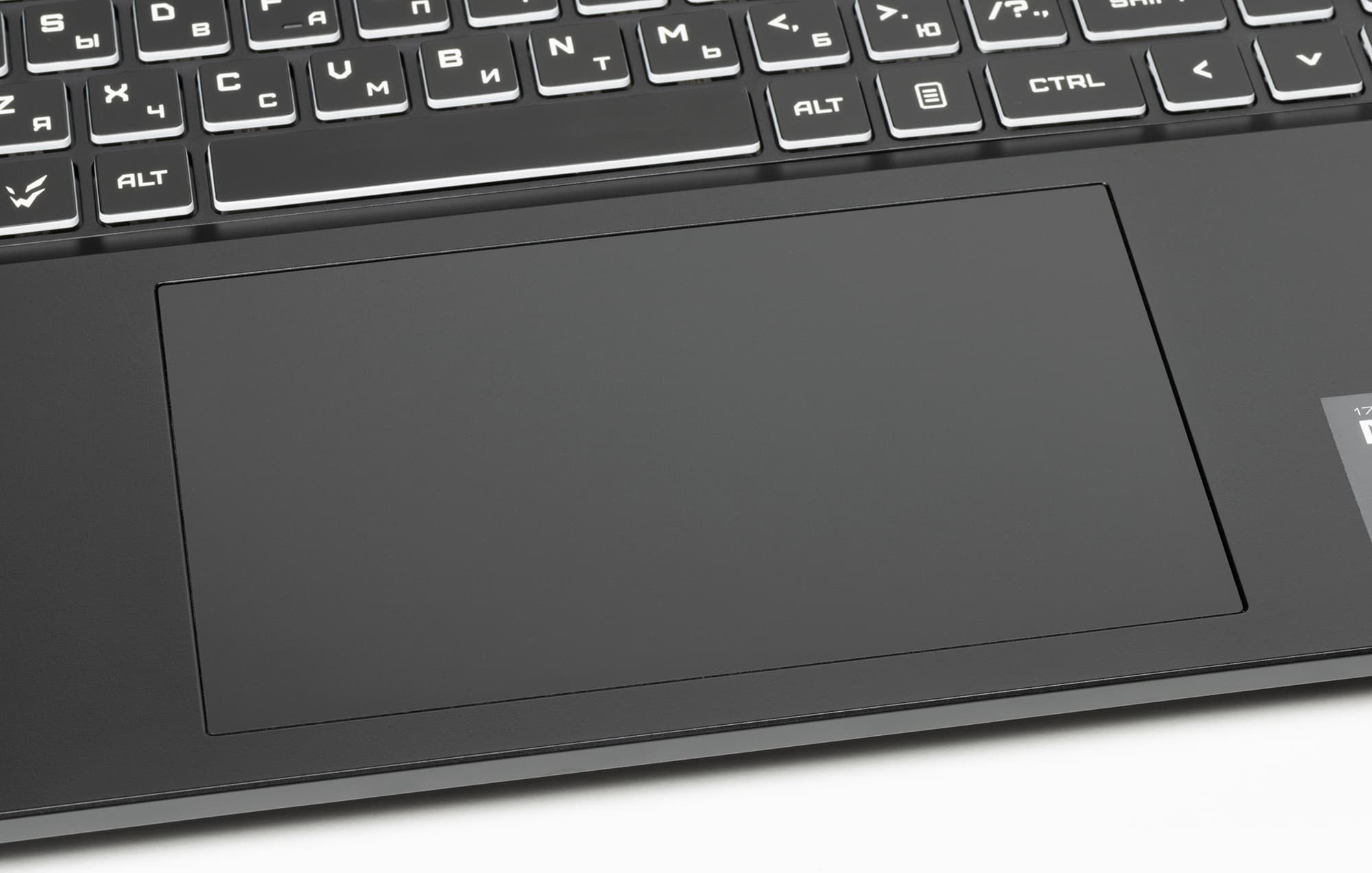 Рамка справа и слева имеет ширину 6 мм и возвышается над поверхностью дисплея на 2 мм. Экран полуматовый, 17,3 дюйма по диагонали, представлен матрицей IPS (разрешение 1920×1080) с частотой развертки 144 Гц и откликом 11 мс (измерено в iXBT.com) — это вполне достойно игровых приложений.