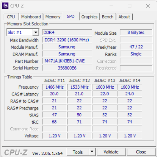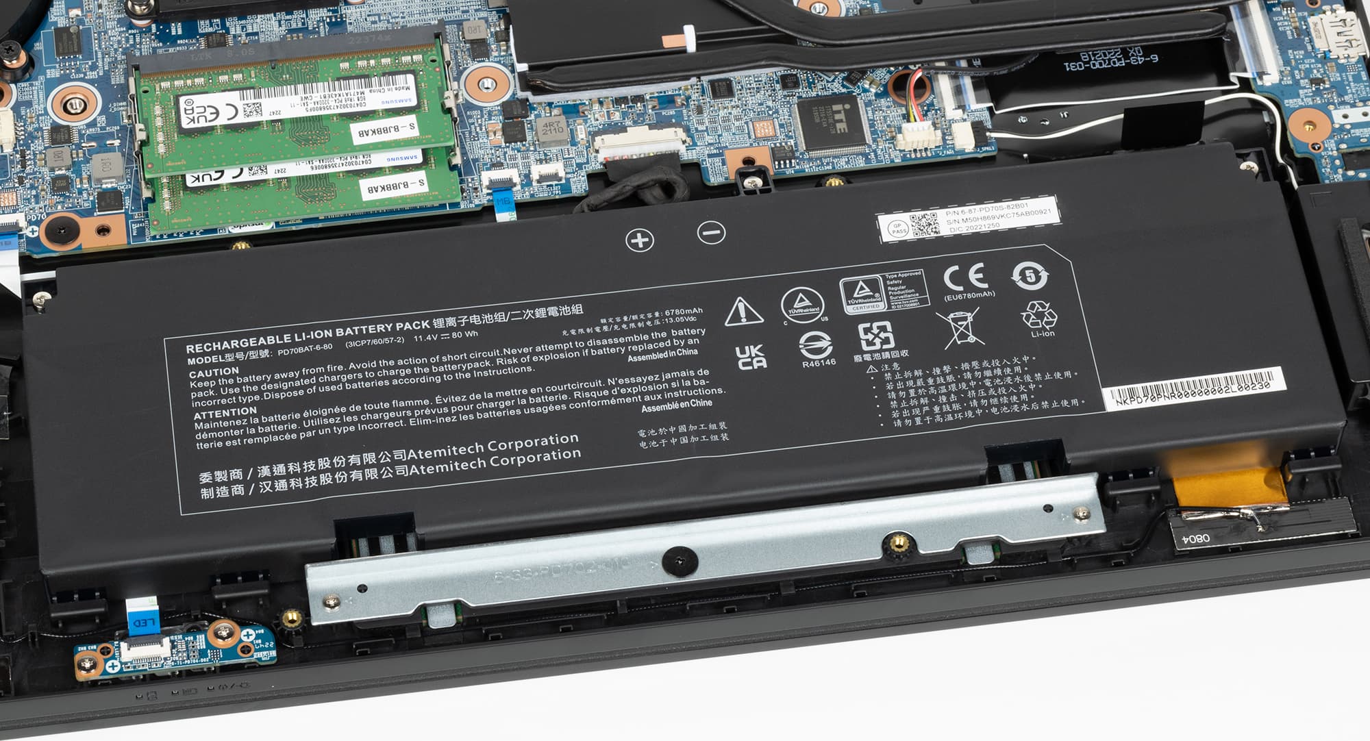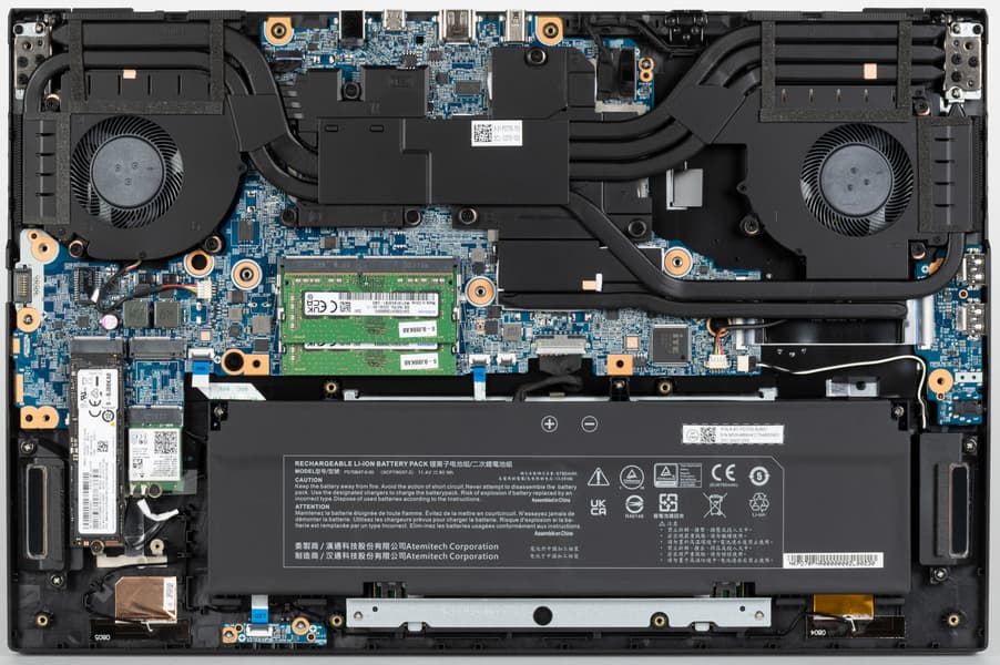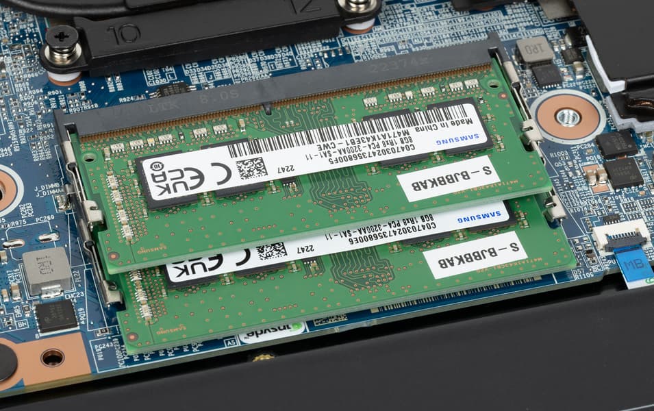 Ноутбук оснащен процессором, который умеет работать с оперативной памятью DDR5-4200, но в слотах установлены два модуля SO-DIMM по 8 ГБ Samsung M471A1K43EB1-CWE предыдущего поколения (DDR4-3200).