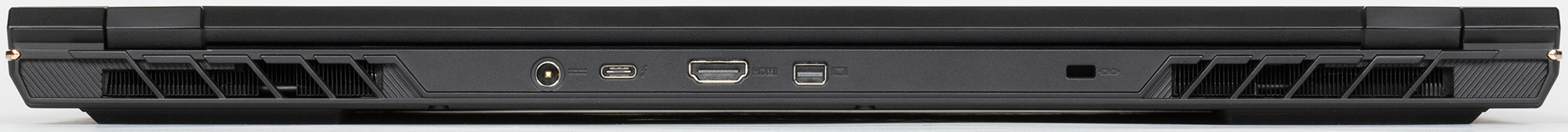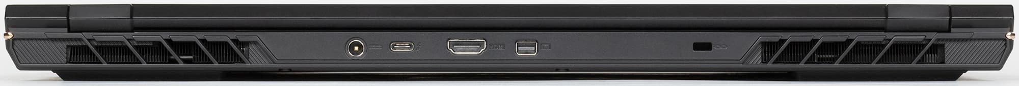 Справа и слева на задней панели видны решетки отверстий, через которые наружу выбрасывается горячий воздух. Между ними помещаются коннектор адаптера питания, разъем USB Type С, видеовыход HDMI, интерфейс Mini-DisplayPort, а чуть поодаль, правее, отверстие для кенсингтонского замка.