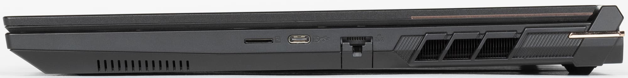 Справа расположены картовод для microSD, порт USB Type C, коннектор RJ-45 для подключения кабеля Ethernet (UTP) и боковая решетка выходного тракта системы охлаждения.