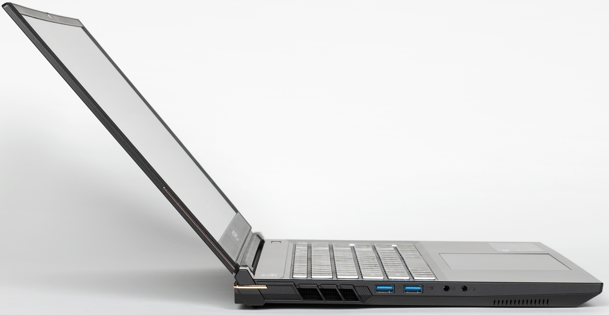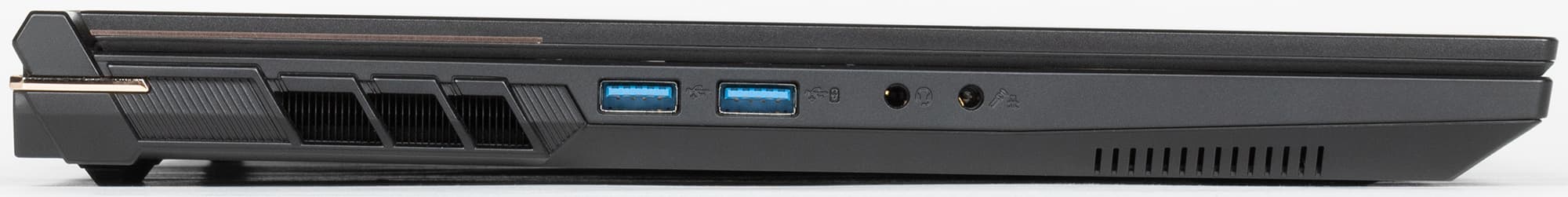 На левой боковой панели обнаруживаются решетка выходного отверстия системы охлаждения, два разъема USB Type A, аудиовыход на наушники и входной разъем для микрофона (миниджеки 3,5 мм).