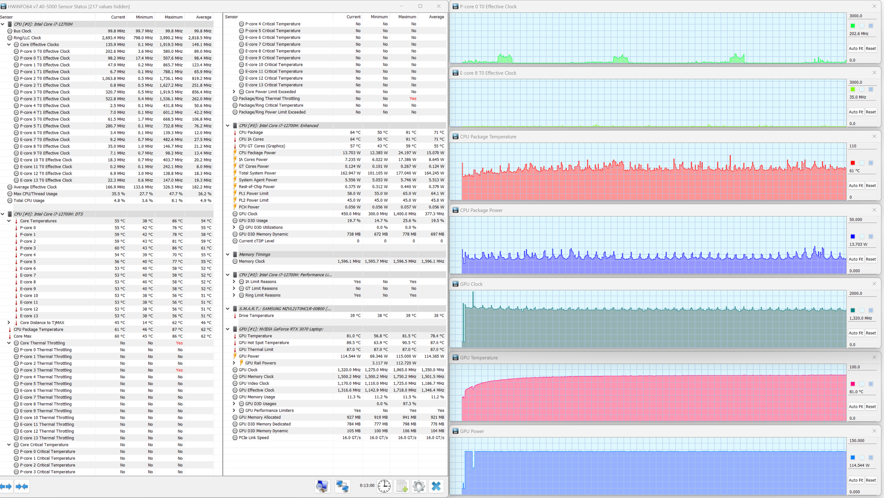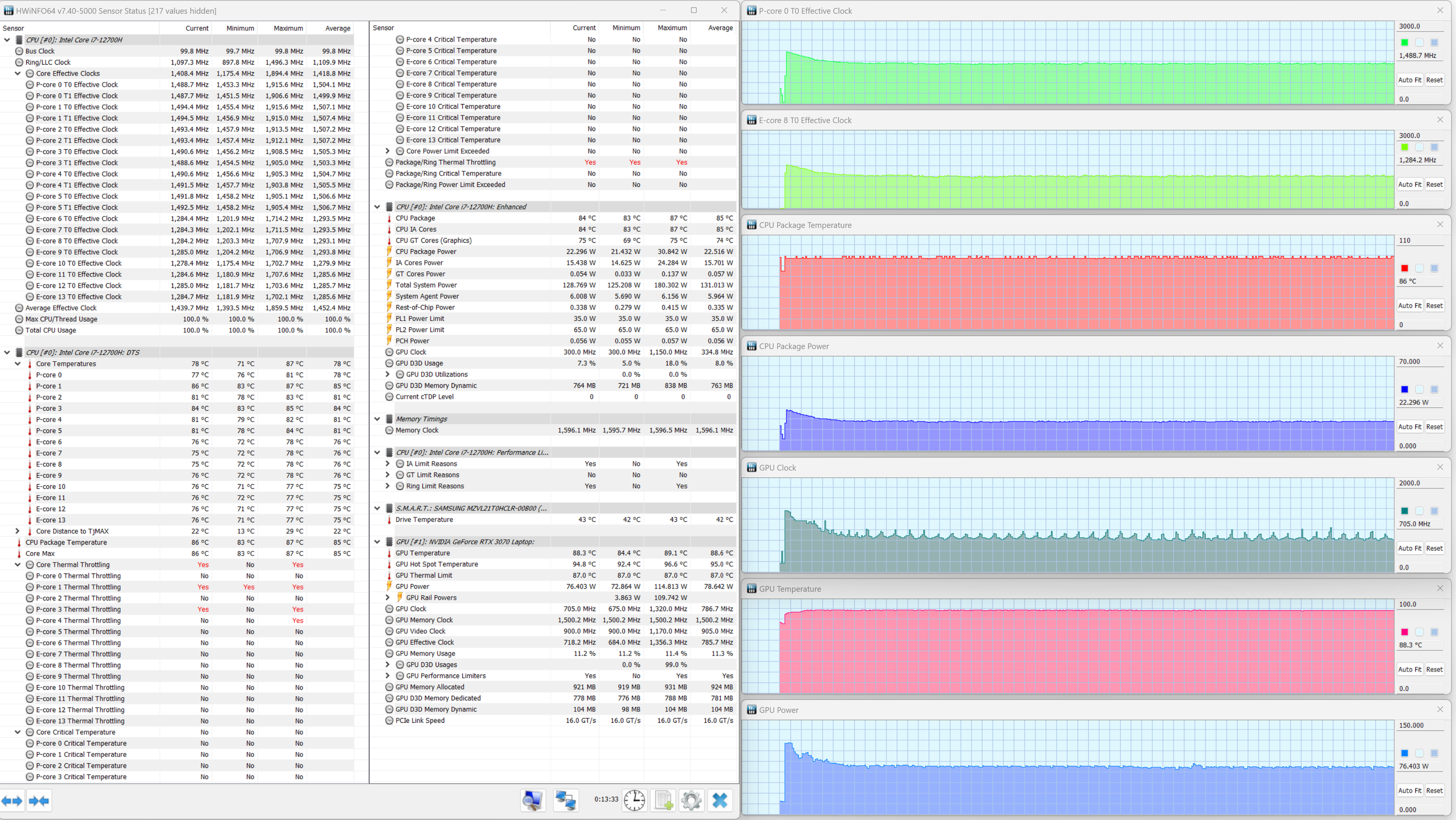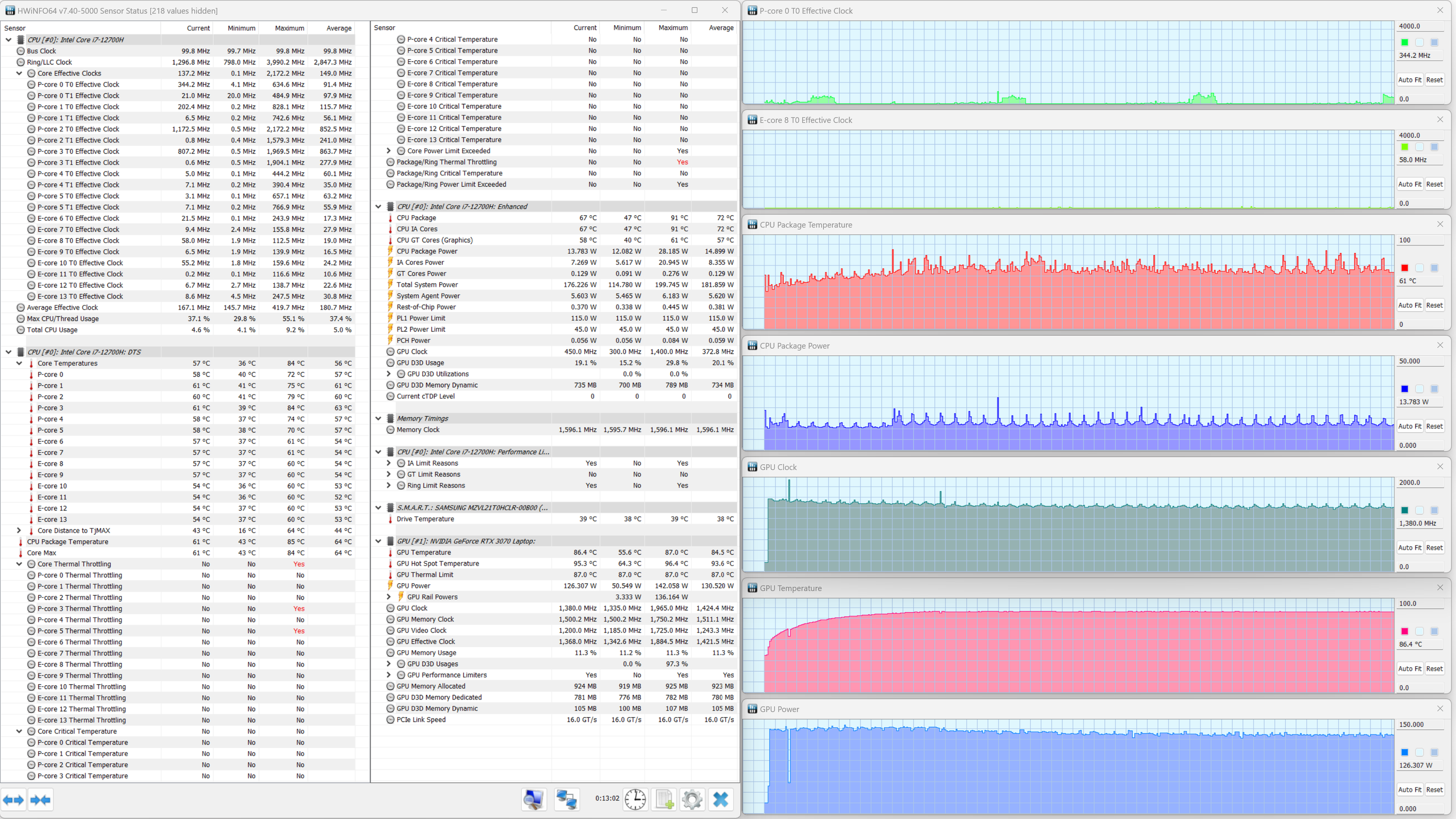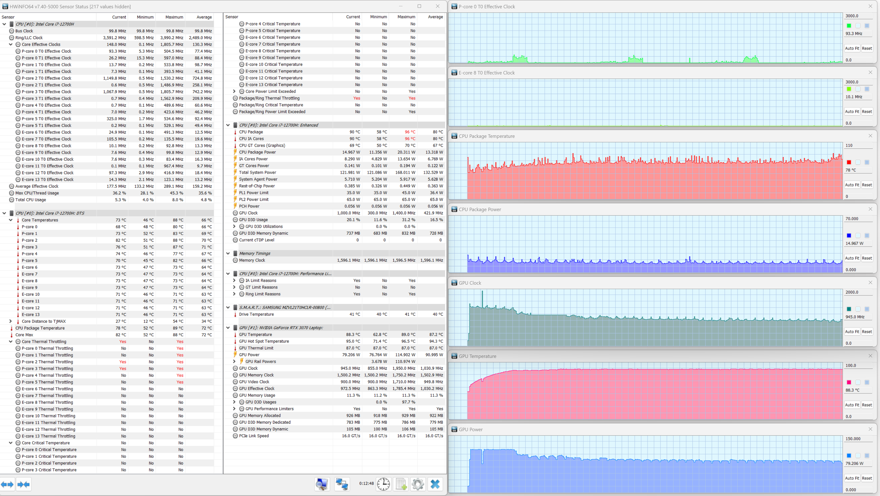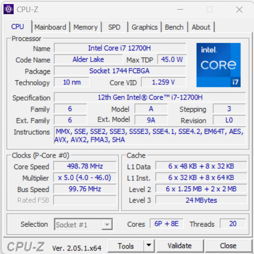 Процессор Intel Core i7-12700H в составе героя нашего обзора — не самое топовое решение, но всё же отличающееся высокой производительностью. По соотношению быстродействия и цены выбор этого вычислителя для игрового ноутбука объясним и закономерен. Низкоуровневые параметры CPU представлены ниже на скриншоте утилиты HWInfo.