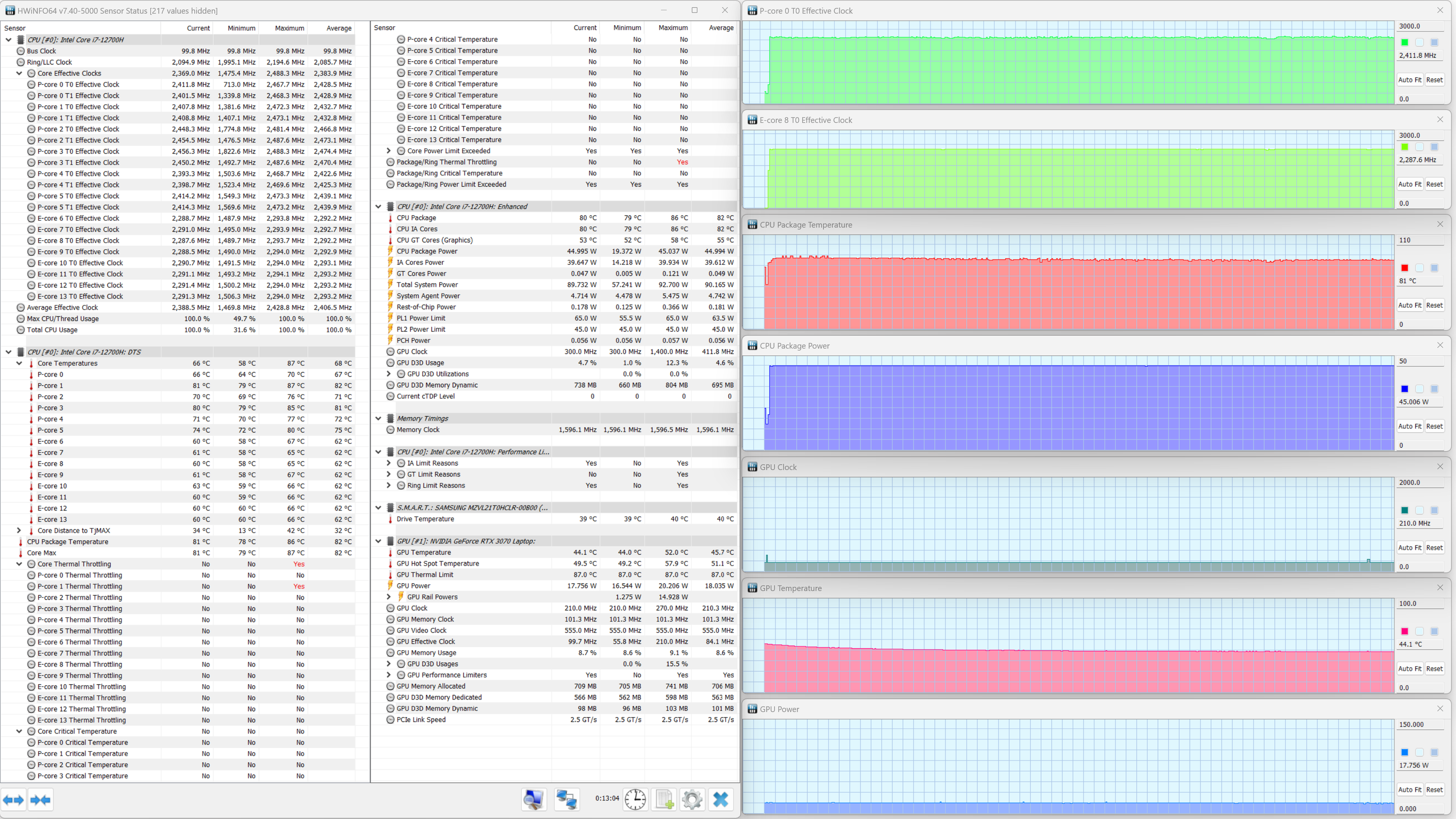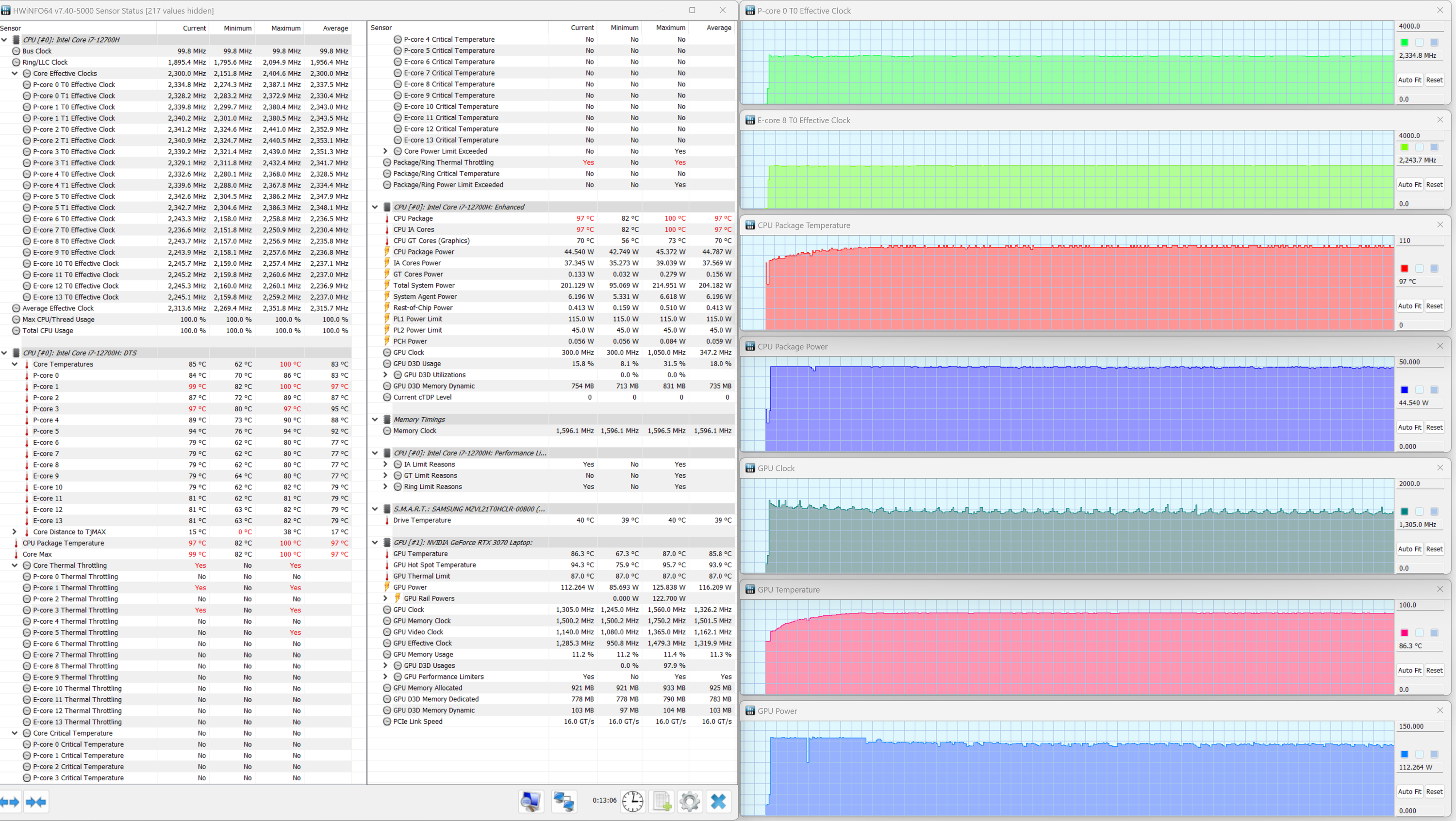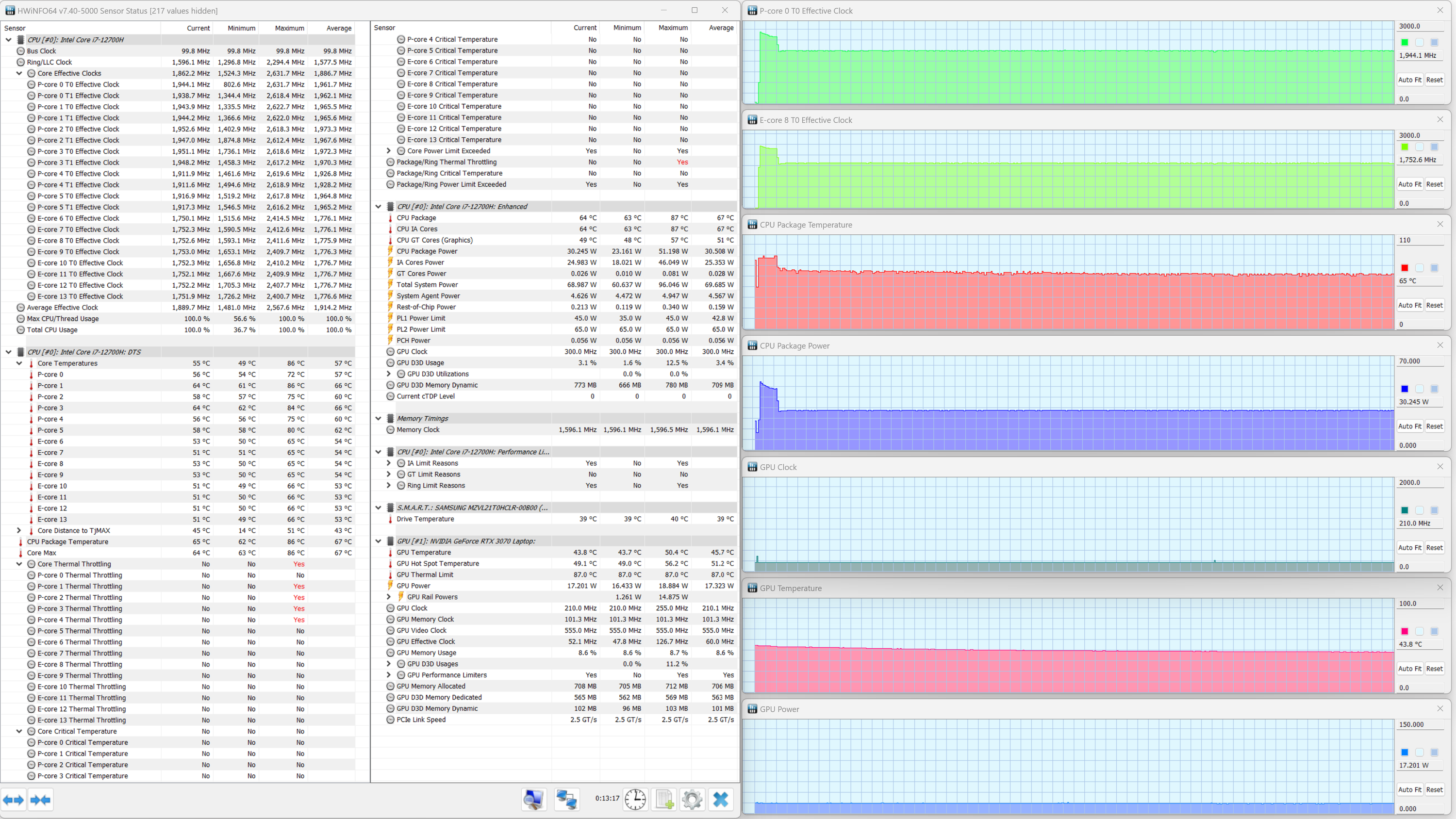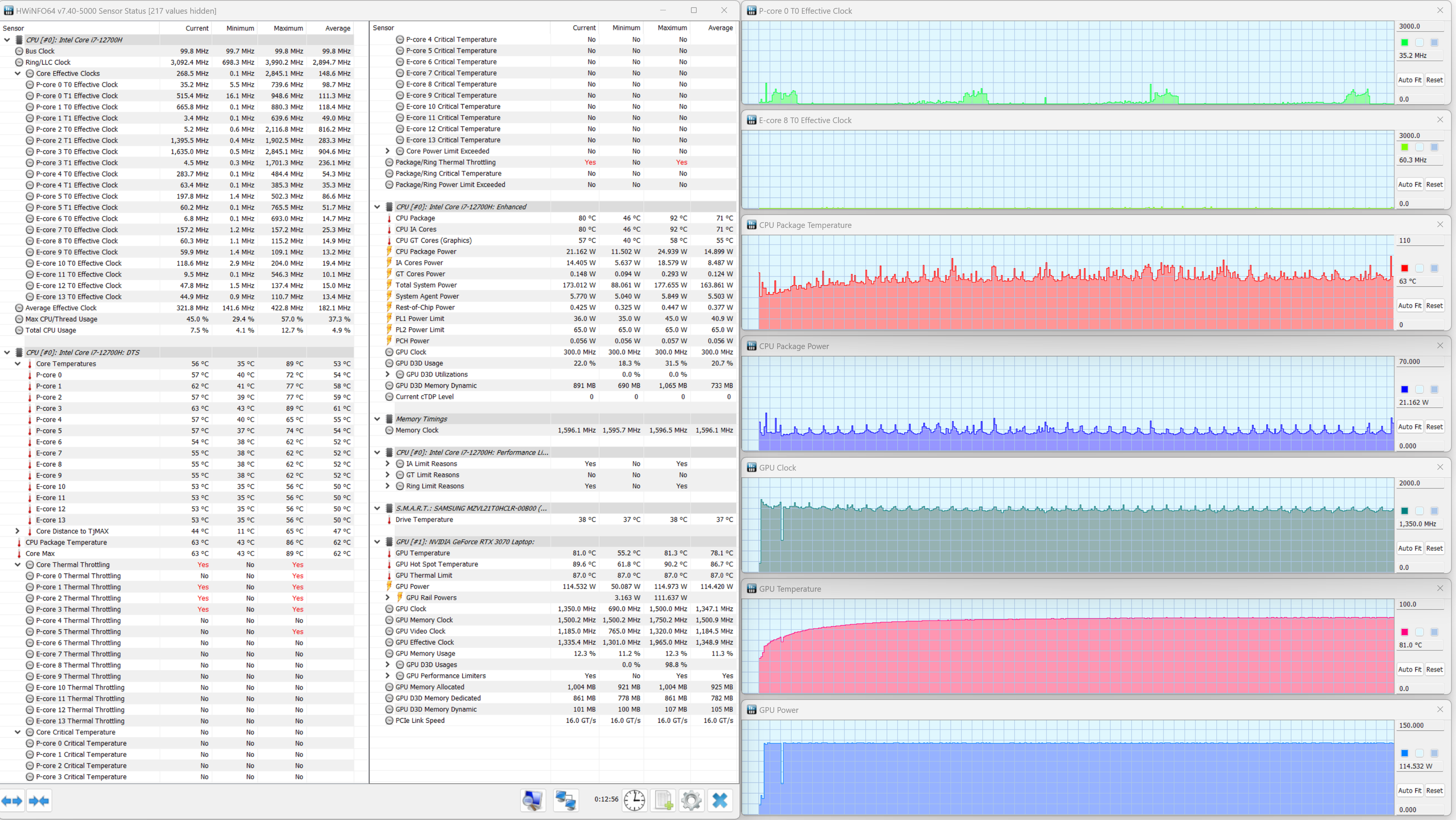 Процессор Intel Core i7-12700H в составе героя нашего обзора — не самое топовое решение, но всё же отличающееся высокой производительностью. По соотношению быстродействия и цены выбор этого вычислителя для игрового ноутбука объясним и закономерен. Низкоуровневые параметры CPU представлены ниже на скриншоте утилиты HWInfo.