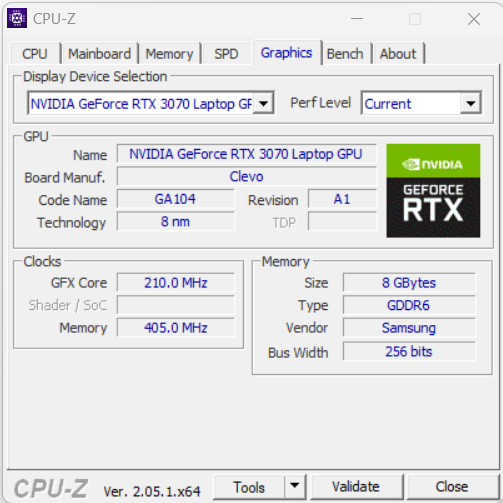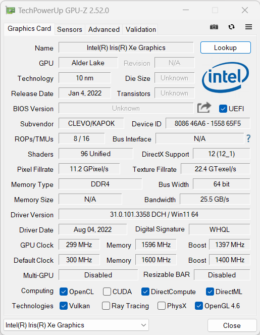Процессор Intel Core i7-12700H в составе нашего героя обладает интегрированным графическим решением Intel Iris Xe Graphics, но оно не представляет решительно никакого интереса для геймера. Всерьез можно рассматривать лишь дискретную графику, а она у Ardor Gaming Neo G17 вполне адекватная, хотя и не топовая. Параметры экипировки машины графическими решениями можно получить в отчете приложения GPU-Z.