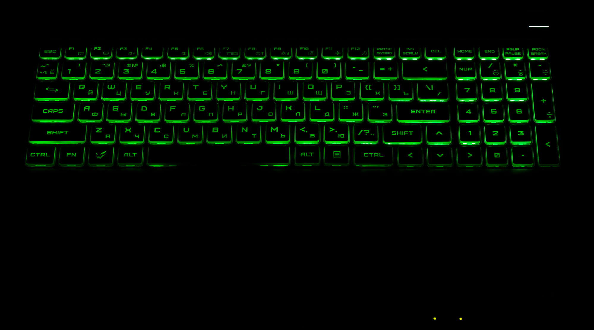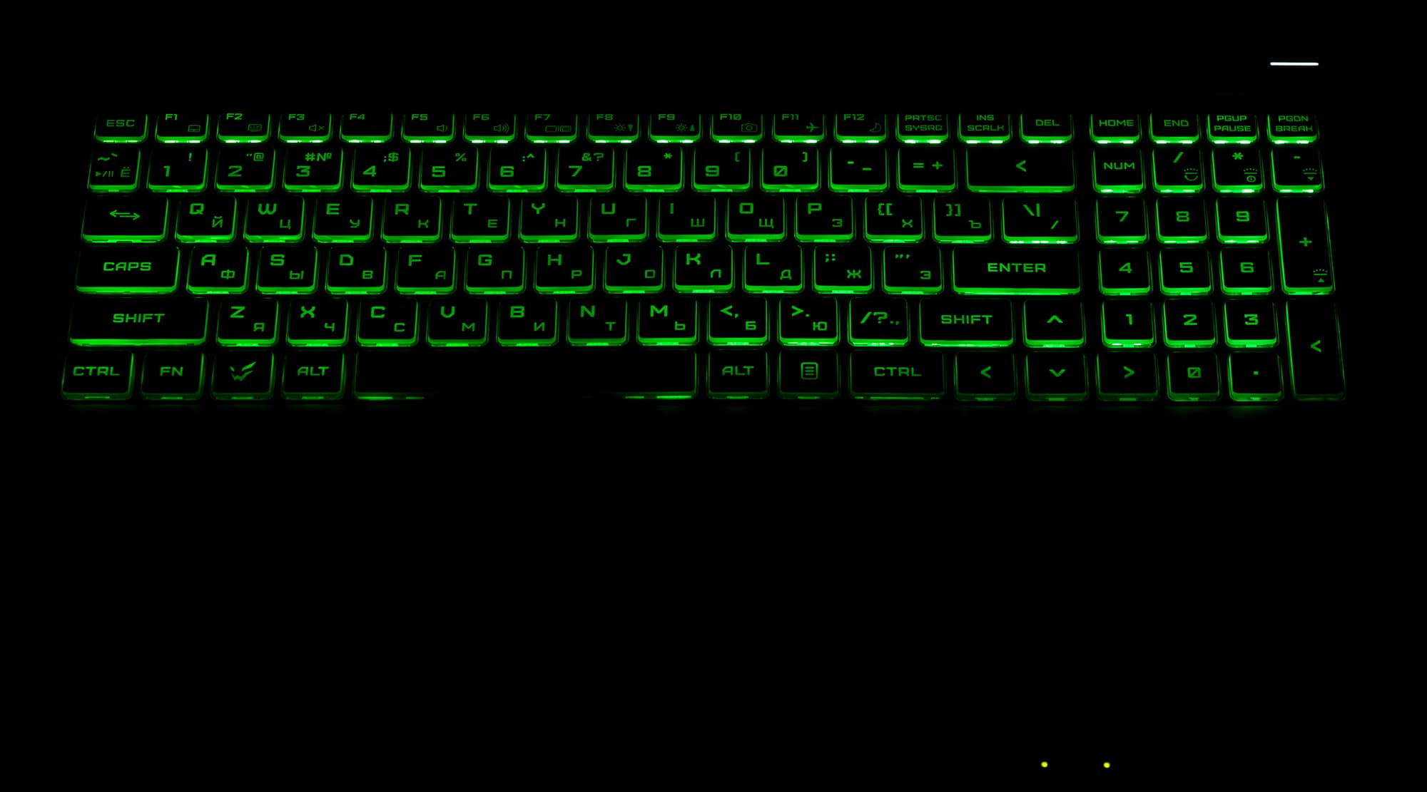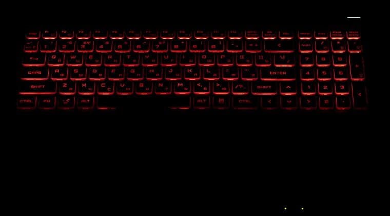 Клавиатура снабжена RGB-подсветкой, но цвета меняются для всех клавиш одновременно. Нет реализации динамических режимов с переливами и переходами, а равно и возможности назначения отдельным кнопкам других цветов. Доступно четыре уровнями по яркости (пятое состояние — подсветка выключена). Переключение производится повторными нажатиями аккордов Fn и +/− на цифровом блоке. Подсвечиваются сами символы на клавишах и их контуры. Зона подсветки под каждой клавишей видна при отклонении от клавиатуры, но светится мягко и не раздражает. Распределение света позволяет видеть символы русской раскладки.