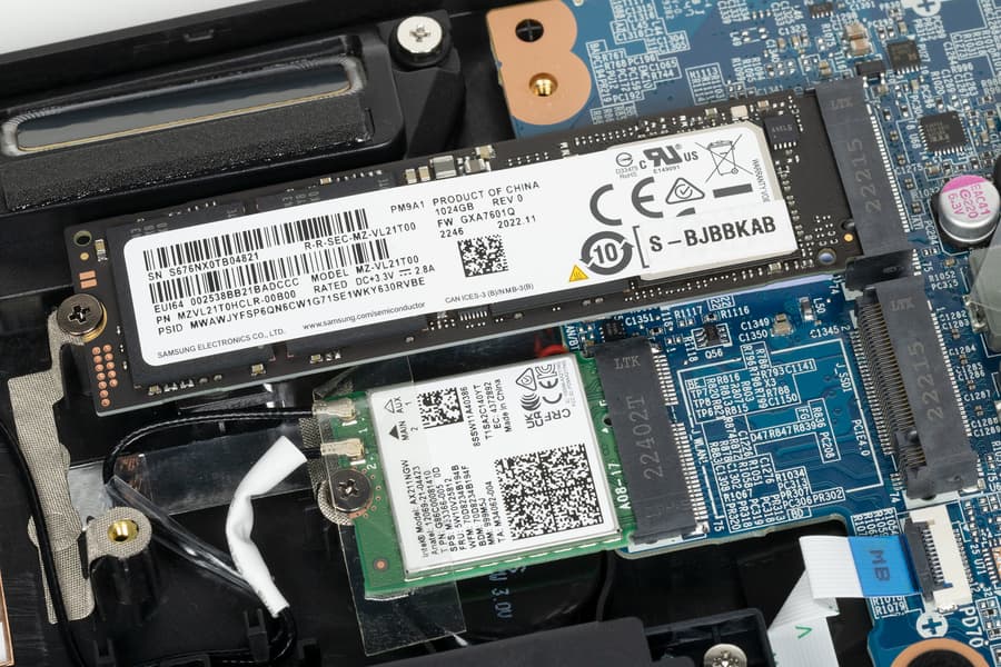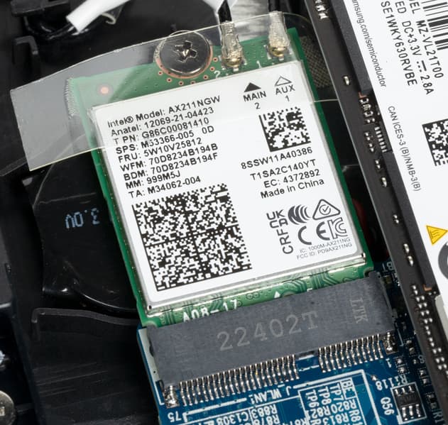 Под посадочным местом первого (отсутствующего в нашей конфигурации) SSD помещается вполне современный высокоскоростной трехдиапазонный (2,4/5/6 ГГц) адаптер беспроводной связи Intel AX211NGW (Garfield Peak) стандарта IEEE 802.11ax (Wi-Fi 6E) с поддержкой одновременного приема и передачи данных при помощи двух антенн (2T2R MU-MIMO). Он же реализует связь по Bluetooth 5.2 Dual Band. На сегодняшний день это одно из топовых устройств радиосвязи для мобильных ПК.