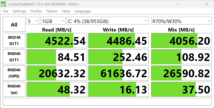 Для SSD-накопителей предусмотрено два слота M.2. Первый пустует, а во втором обнаруживается NVMe-хранилище Samsung PM9A1 (MZVL21T0HCLR) с интерфейсом PCI Gen 4 x4. Неформатированная емкость устройства составляет 1 ТБ, в рабочей конфигурации со служебными разделами доступное пользователю пространство уменьшается до 930 ГБ, а после установки Windows 11 сокращается еще на 40 ГБ. Второй разъем M.2 расположен левее первого и равноценен ему по интерфейсу, скоростям обмена данными и конструктивным особенностям. Благодаря этому в оба слота можно установить одинаковые устройства и создать массивы с организацией одного логического устройства из двух физических: RAID0 с двухкратным выигрышем в емкости и скоростях чтения/записи либо RAID1 с дублированием данных для повышения надежности их хранения.