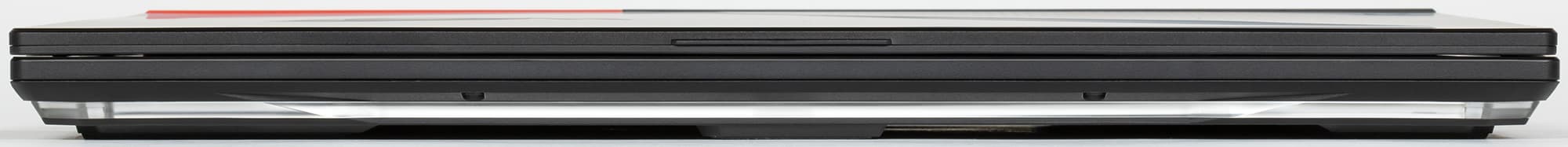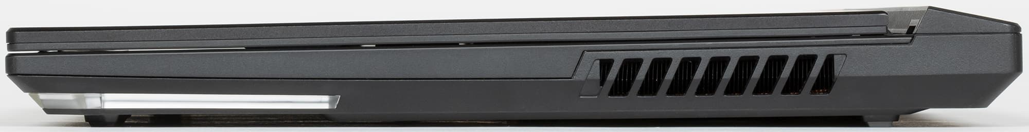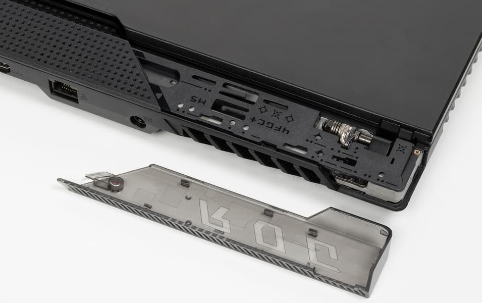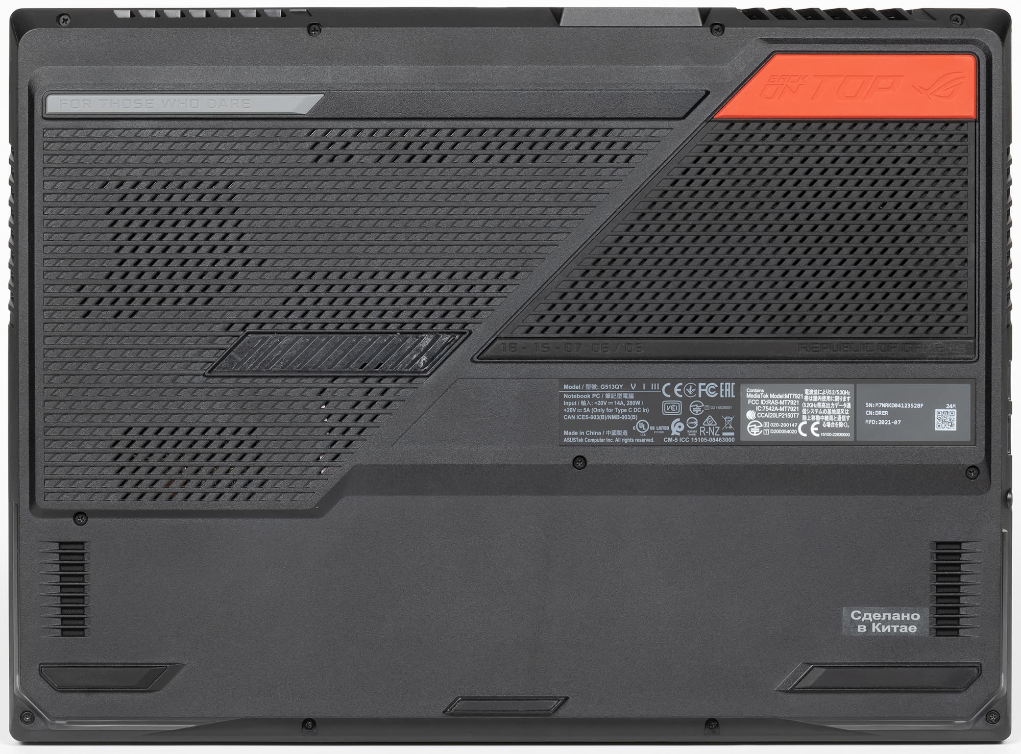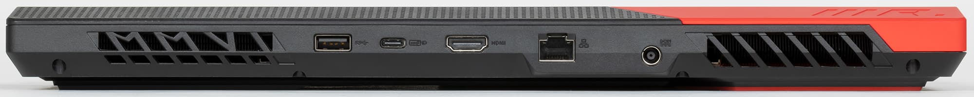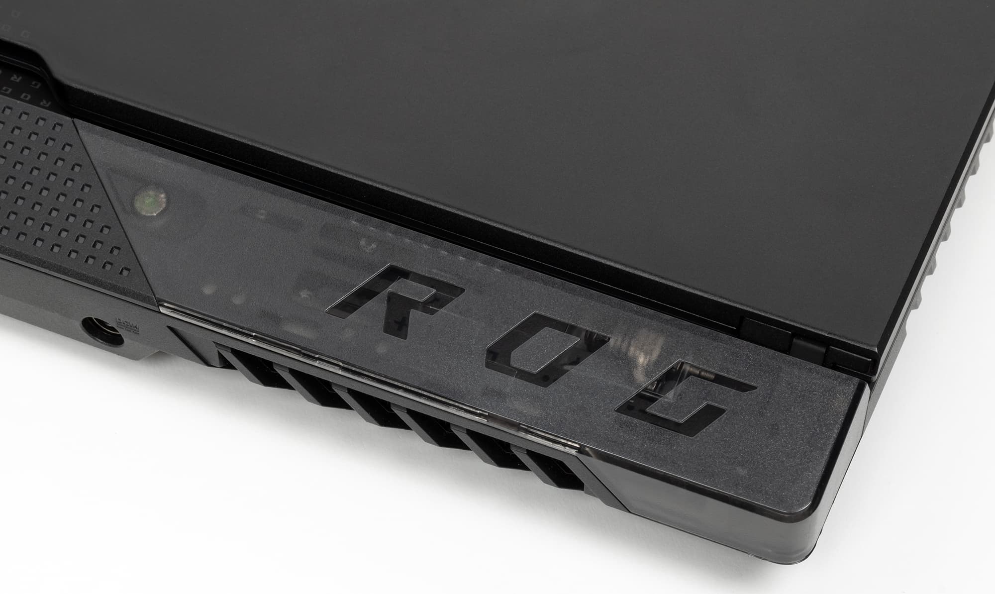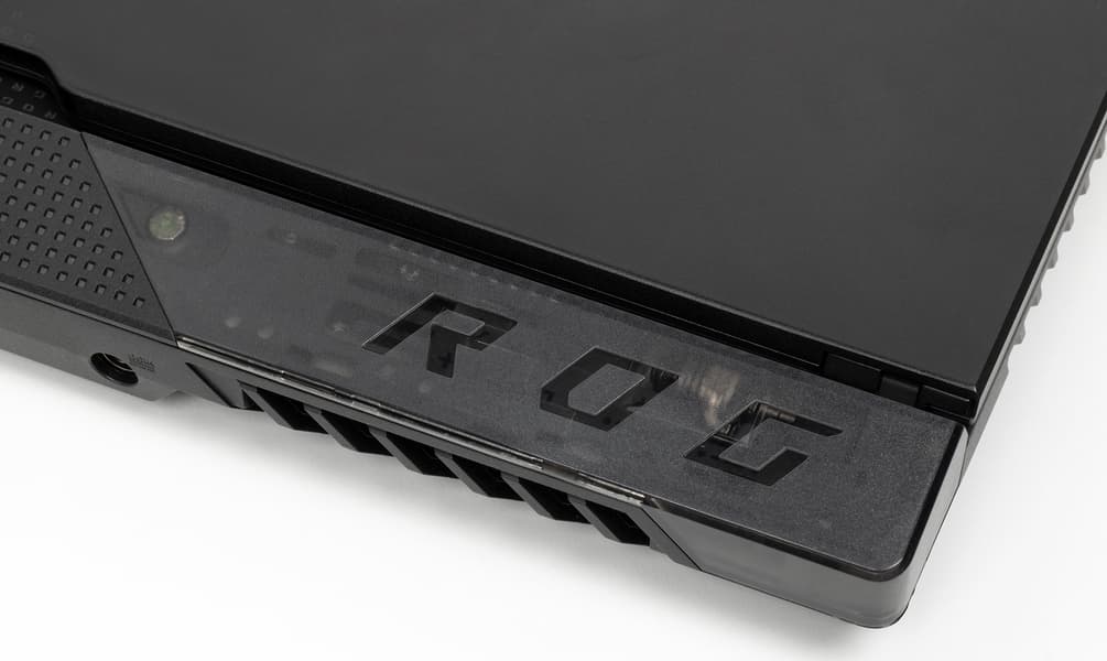 На задней панели заметны решетки отверстий, через которые наружу выбрасывается горячий воздух. Как заведено у производителя, левая решетка образована римскими цифрами MMVI (то есть 2006) — это год рождения серии Asus ROG. Далее помещаются разъемы USB Type A, USB Type С, HDMI, коннектор гигабитного сетевого интерфейса RJ-45 и гнездо для подключения адаптера питания.
