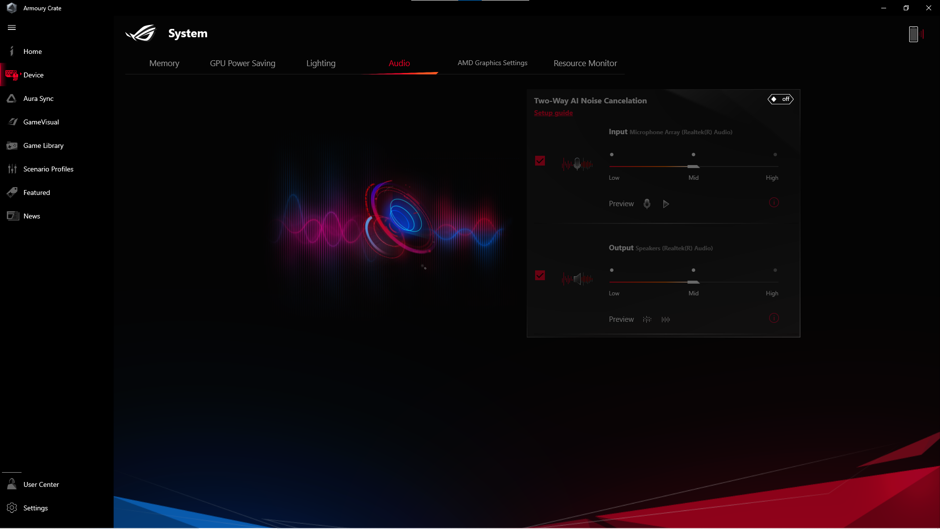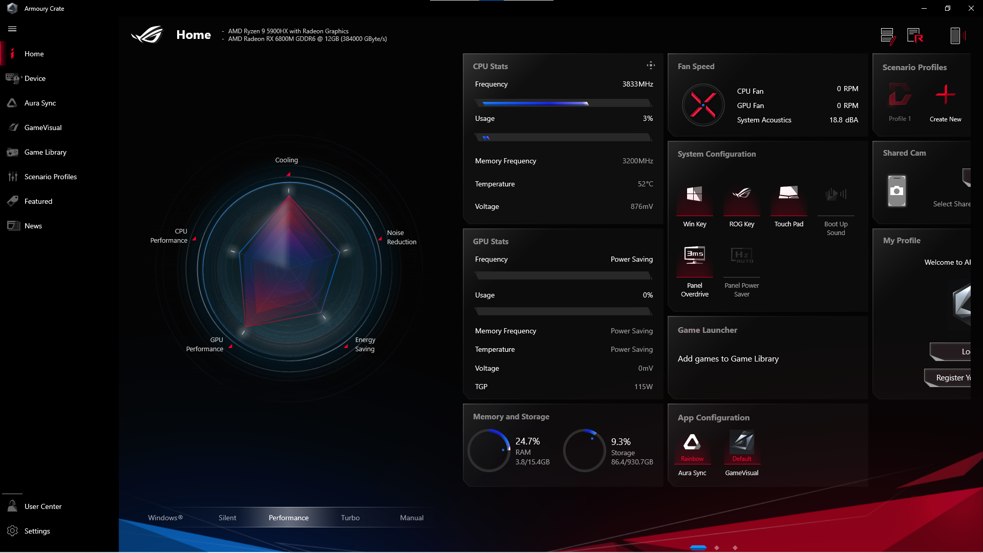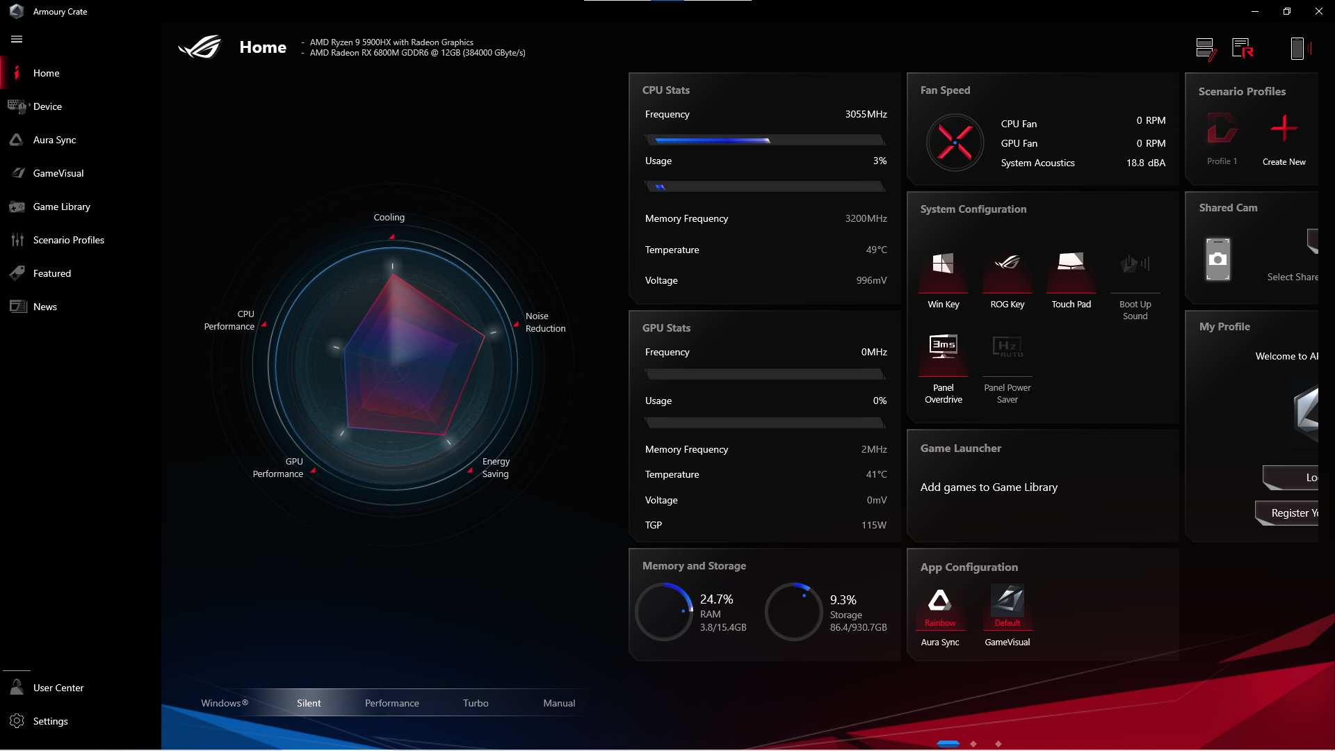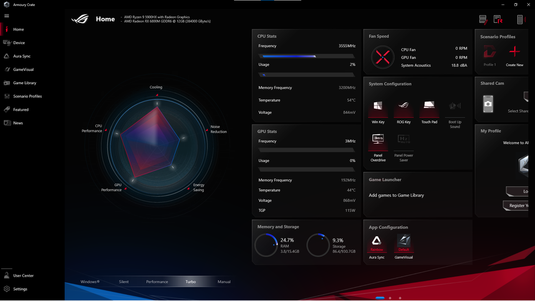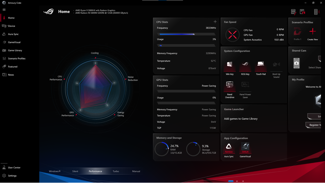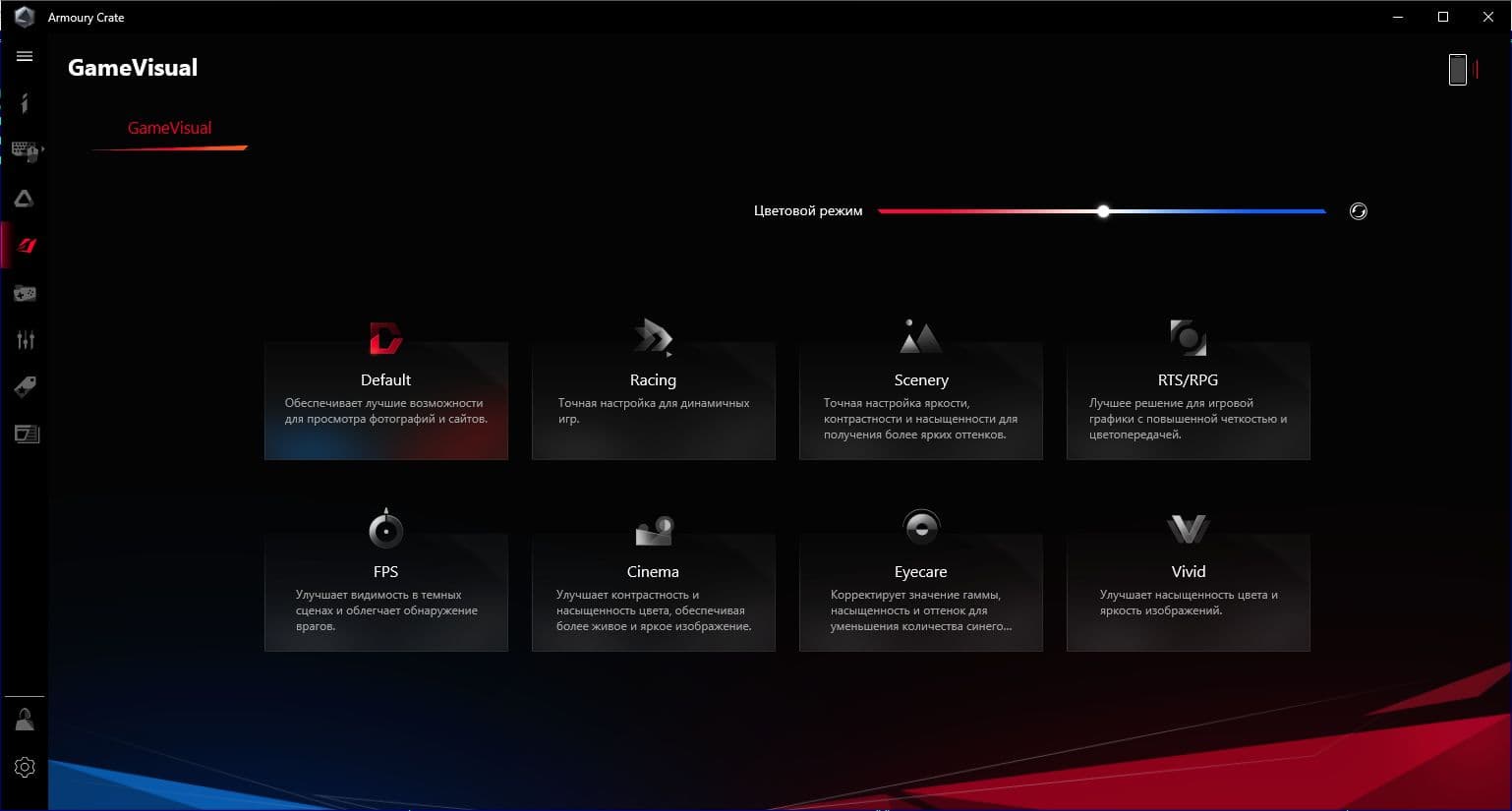 Приложение Armoury Crate отвечает за настройки аппаратных компонентов. Эту утилиту можно запустить нажатием пятой кнопки слева в самом верхнем ряду клавиатуры. Наиболее важная и полезная функция Armoury Crate — выбор пресетов (профилей) работы, определяющих производительность ноутбука и интенсивность работы кулеров.
