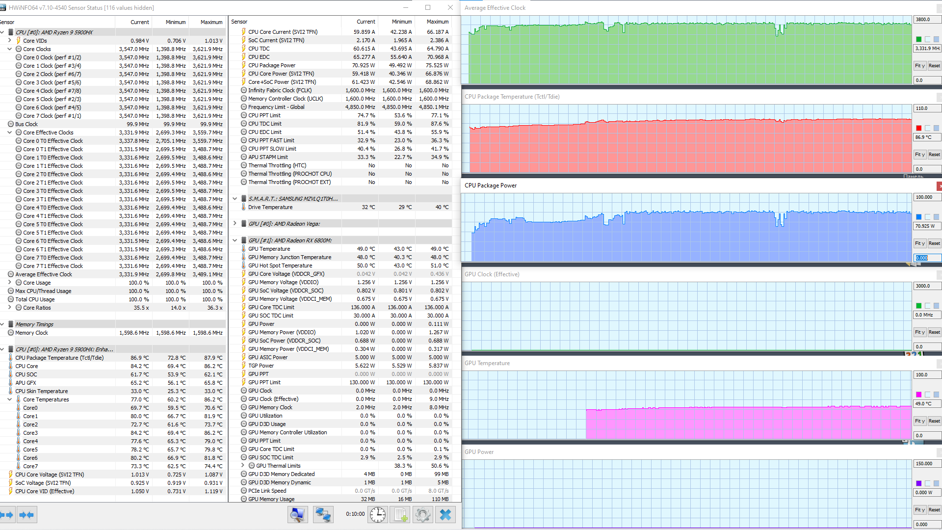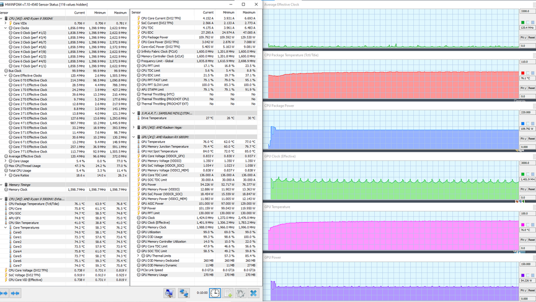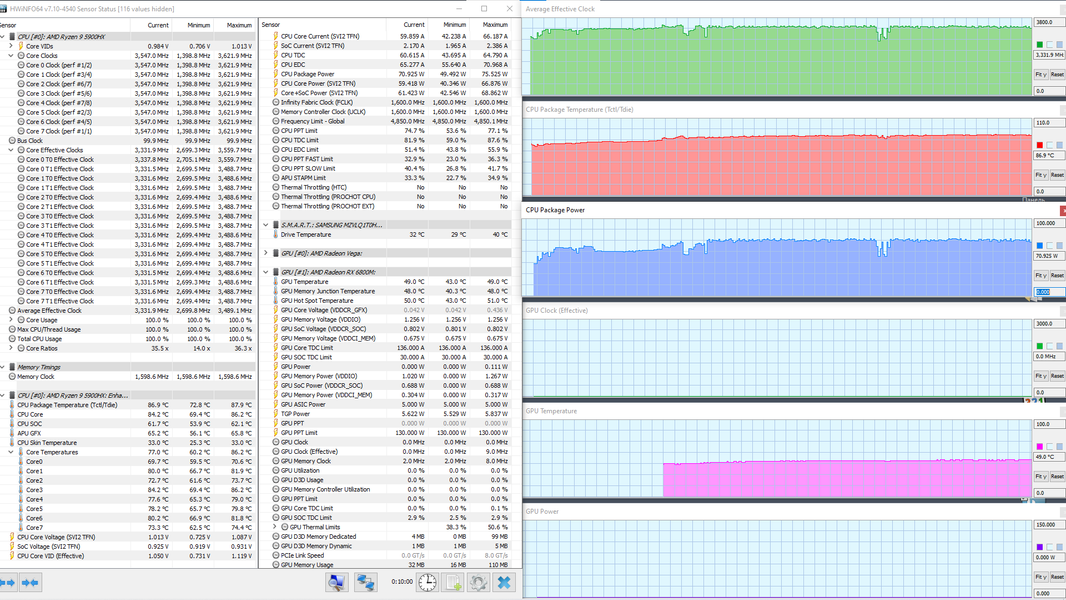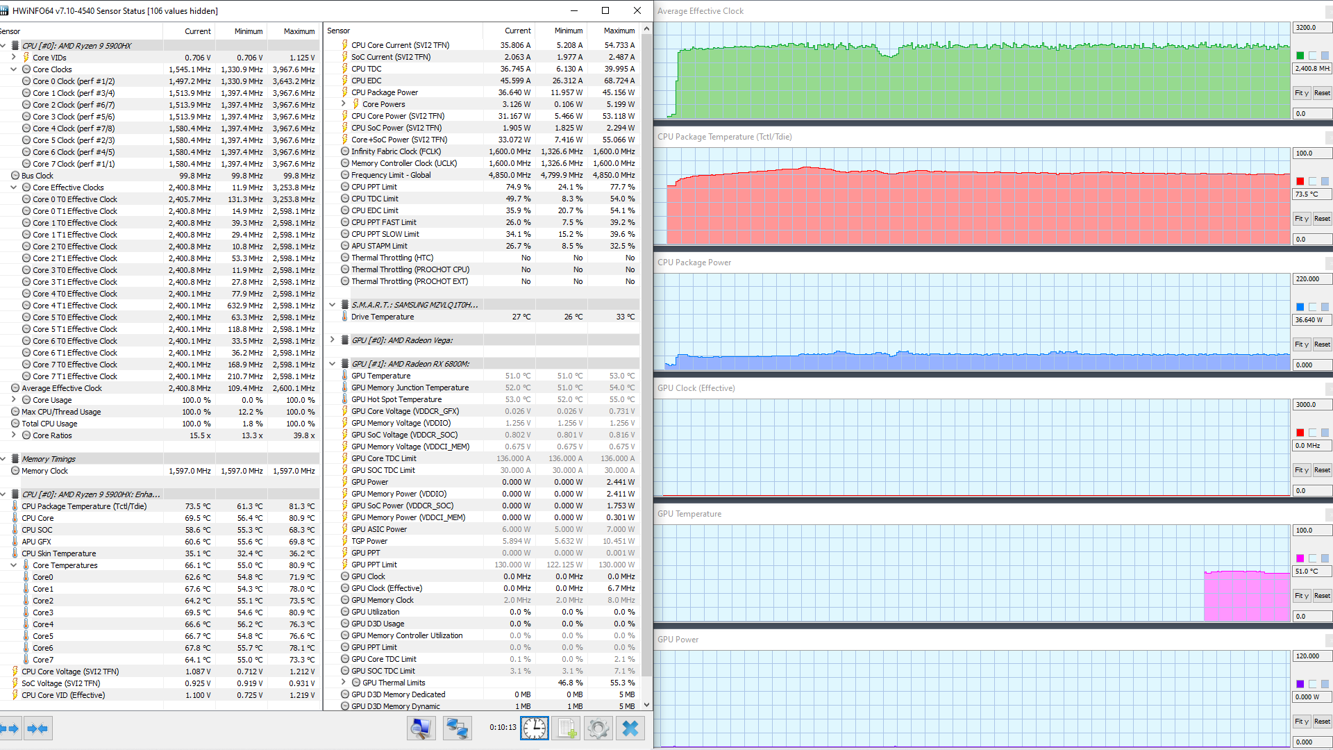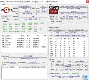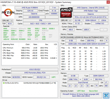 В ноутбуке используется мобильный CPU AMD Ryzen 9 5900HX на микроархитектуре Zen3 (8 ядер, 16 потоков). Официальные частоты составляют 3,3/4,6 ГГц, тепловыделение — 45+ Вт (предусмотрена настройка потребления в диапазоне 35—54 Вт). В наших тестах под нагрузкой центральному процессору удавалось отбирать 70-75 Вт мощности, то есть в случае профиля Turbo наблюдается традиционный для этого режима разгон процессора.