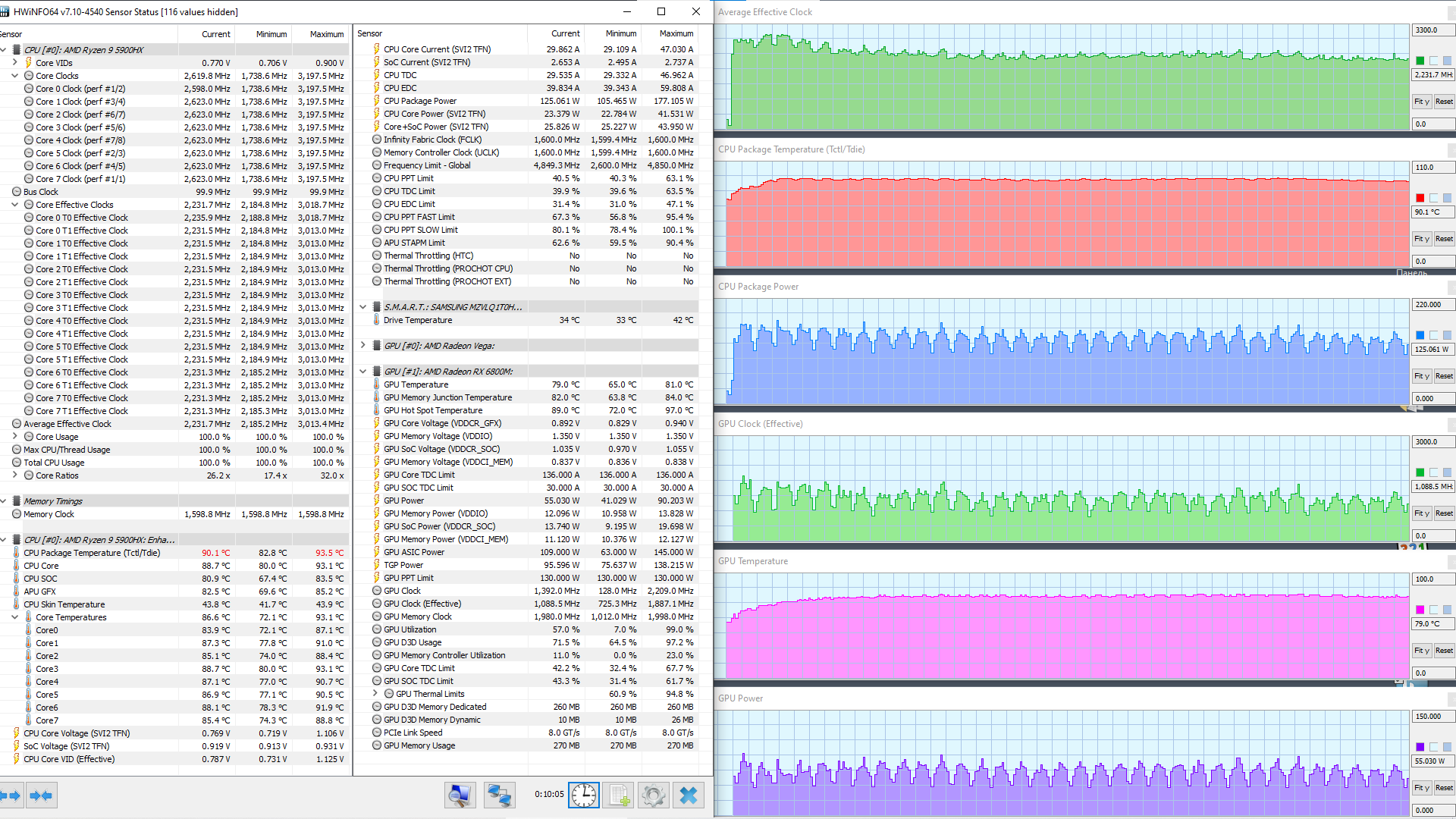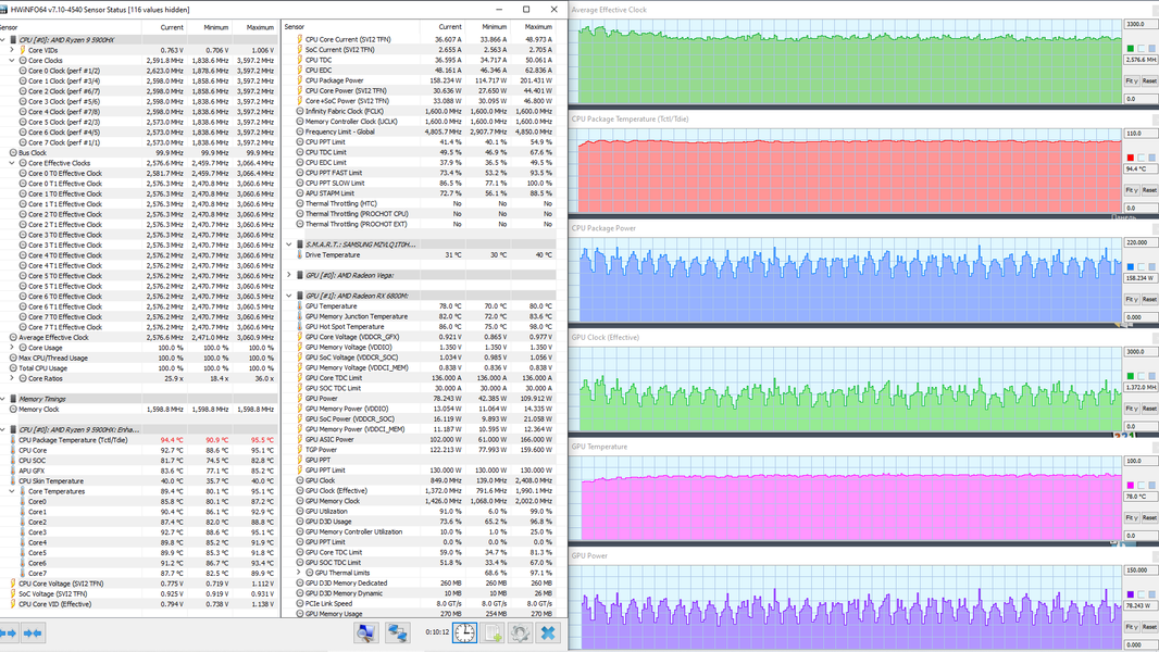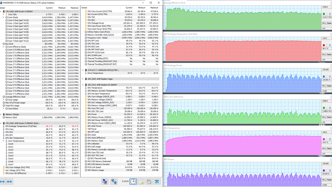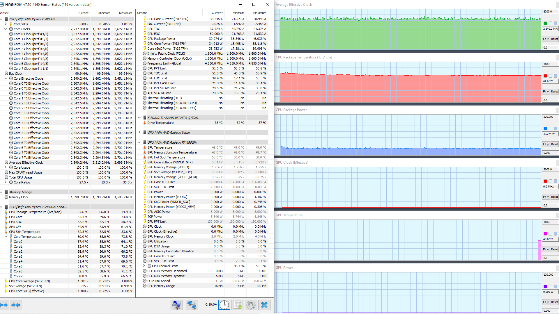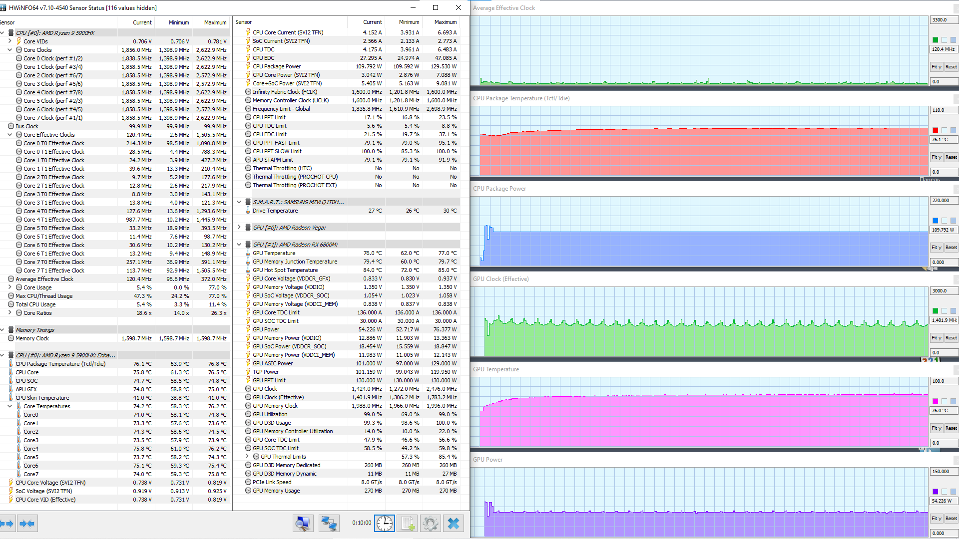 В ноутбуке используется мобильный CPU AMD Ryzen 9 5900HX на микроархитектуре Zen3 (8 ядер, 16 потоков). Официальные частоты составляют 3,3/4,6 ГГц, тепловыделение — 45+ Вт (предусмотрена настройка потребления в диапазоне 35—54 Вт). В наших тестах под нагрузкой центральному процессору удавалось отбирать 70-75 Вт мощности, то есть в случае профиля Turbo наблюдается традиционный для этого режима разгон процессора.