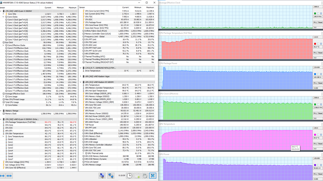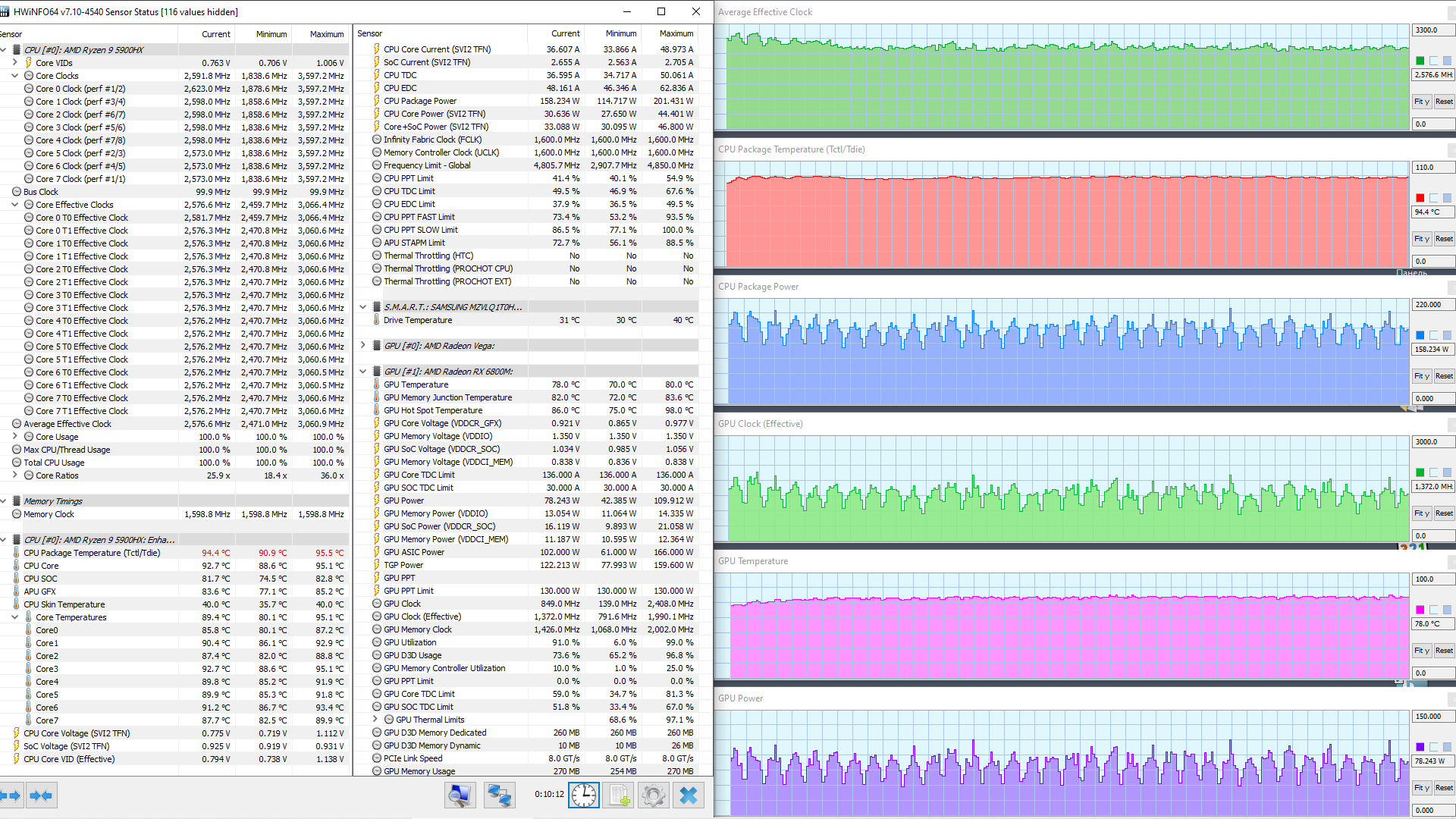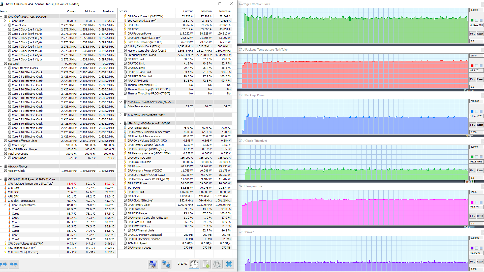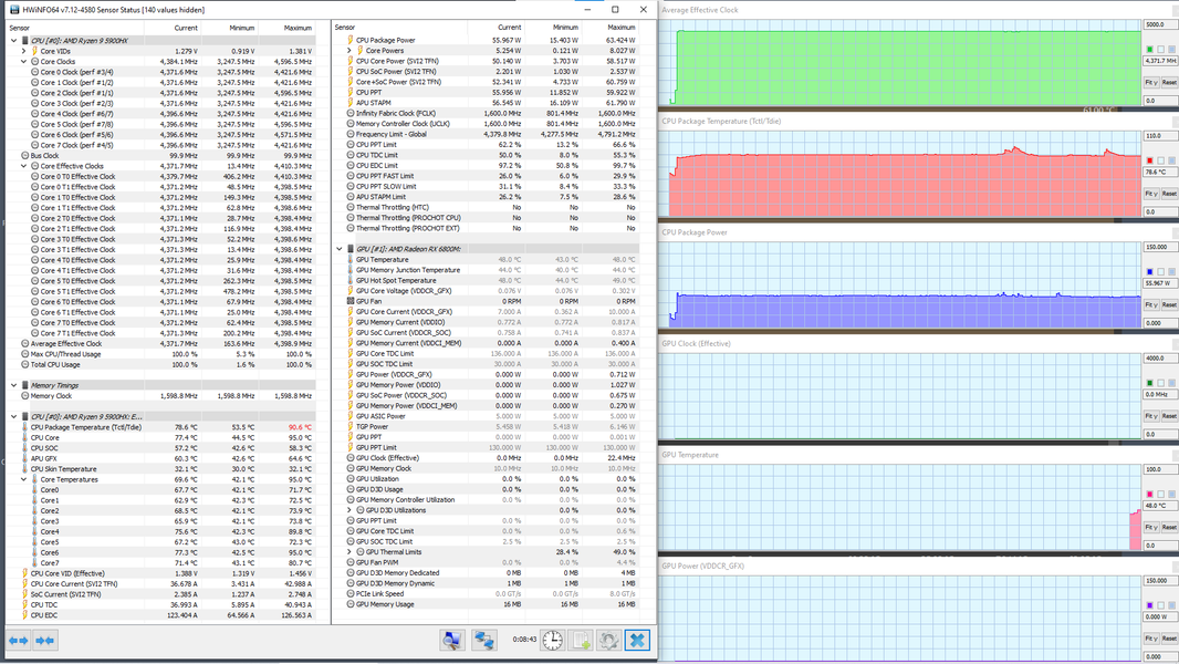 В ноутбуке используется мобильный CPU AMD Ryzen 9 5900HX на микроархитектуре Zen3 (8 ядер, 16 потоков). Официальные частоты составляют 3,3/4,6 ГГц, тепловыделение — 45+ Вт (предусмотрена настройка потребления в диапазоне 35—54 Вт). В наших тестах под нагрузкой центральному процессору удавалось отбирать 70-75 Вт мощности, то есть в случае профиля Turbo наблюдается традиционный для этого режима разгон процессора.