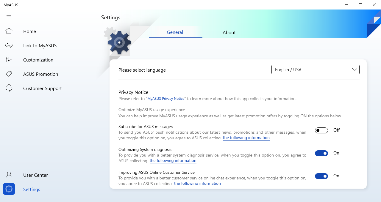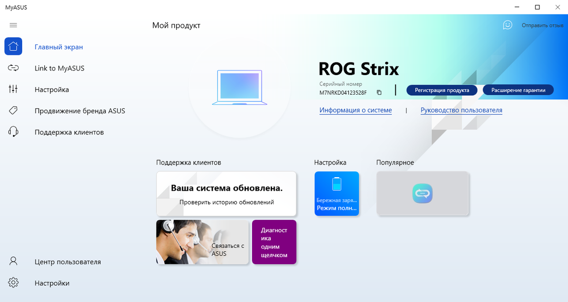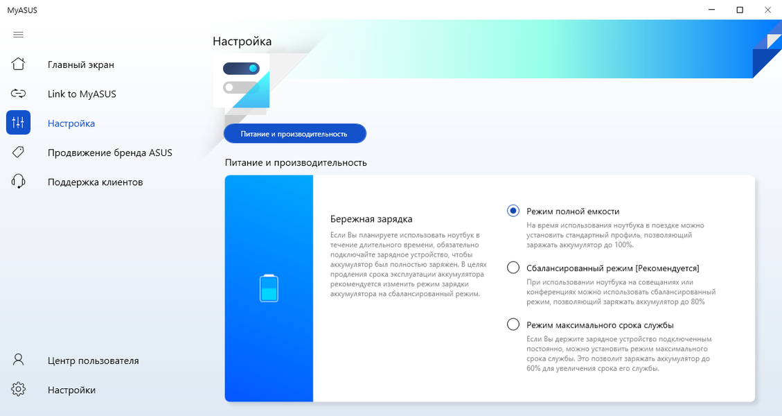 Первая из утилит — MyAsus — это справочник по системе, комплект средств диагностики, собрание контактов техподдержки и часто задаваемых вопросов. Помимо этого, приложение позволяет выявлять наличие обновлений драйверов и фирменного ПО. В плане аппаратных настроек здесь предусмотрена возможность включить режим продления службы батареи, заряжая ее не полностью (подробнее см. ниже).