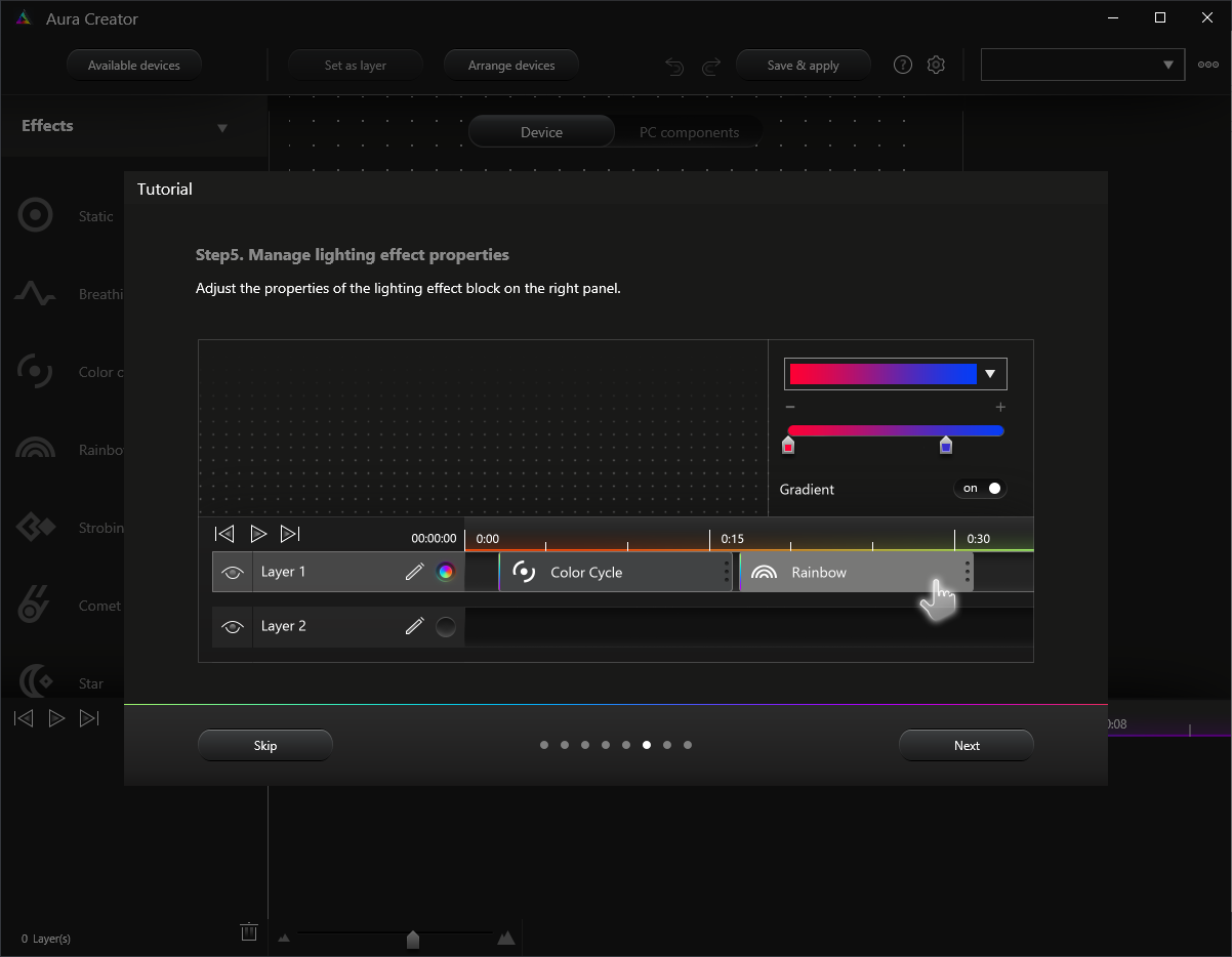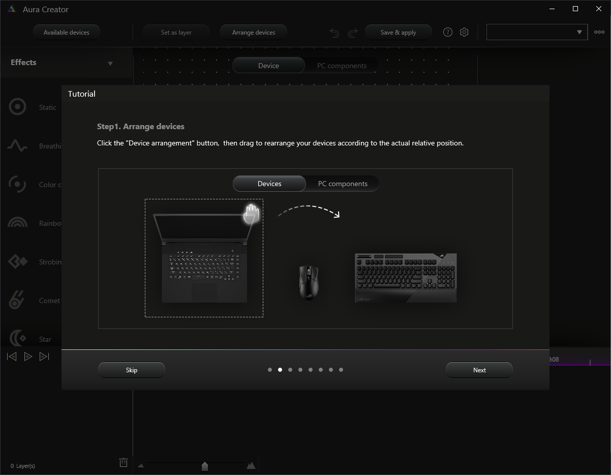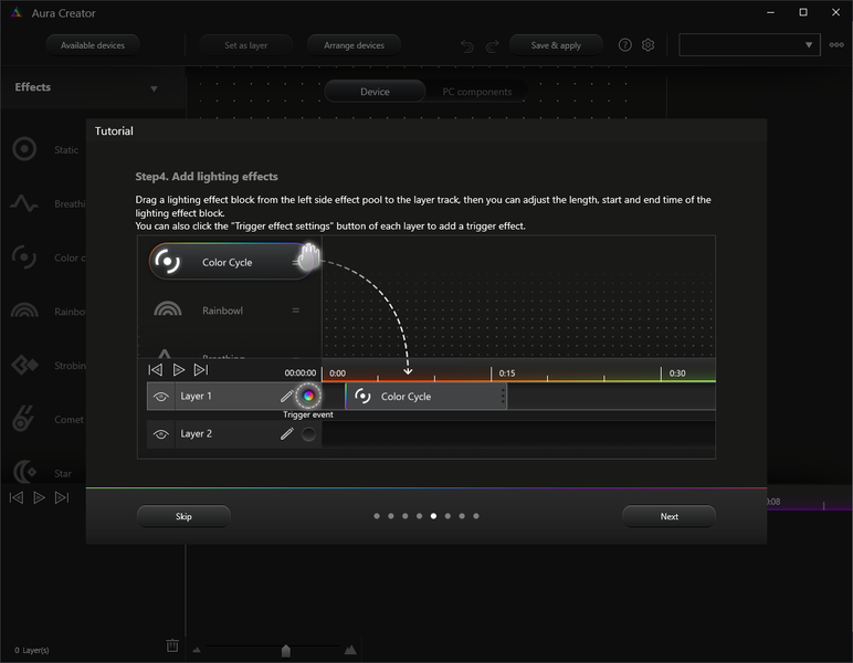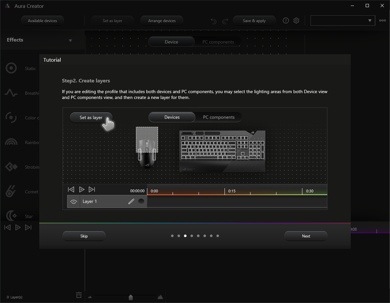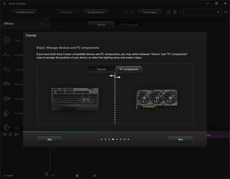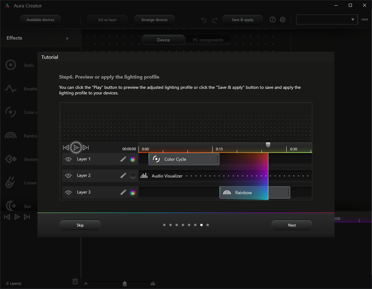 Для поклонников моддинга в комплекте стандартных приложений имеется утилита Aura Creator, где создание своих сценариев работы подсветки выведено на еще более высокий уровень. Имеется встроенная «училка» функциональным возможностям приложения.