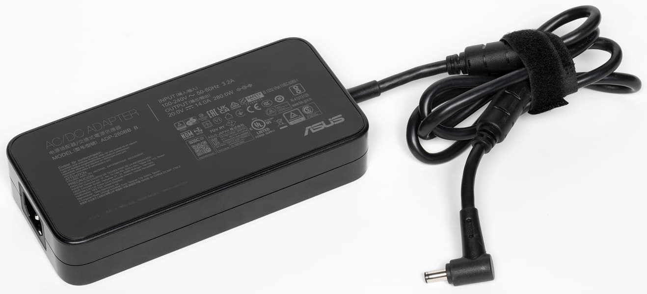 Помимо самой машины в комплекте поставки обнаруживается большой и тяжелый (854 г) адаптер питания, который подходит для работы от сети переменного тока 50/60 Гц под напряжением 100—240 В и обеспечивает на выходе 20 В при силе тока 14 А (мощность 280 Вт).