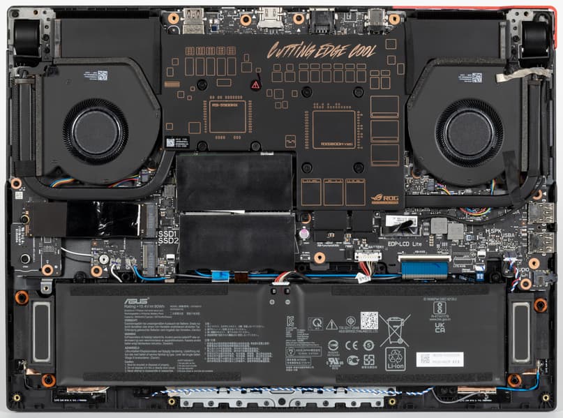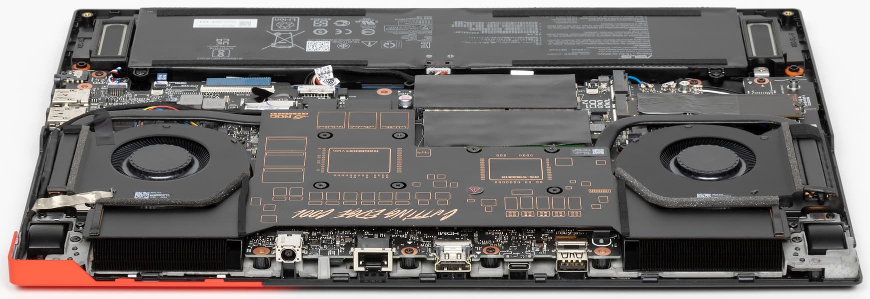Система охлаждения у Asus ROG Strix G15 Advantage Edition G513QY совершенно новая. Во всяком случае, мы ничего подобного еще не видели ни в портативных компьютерах Asus, ни в ноутбуках вообще. Отведение тепла, как обычно, производится тепловыми трубками, две из которых видны без демонтажа системы: они идут от CPU и GPU к левому и правому боковым радиаторам. Всё остальное (по-видимому, это «всё» — уже не трубки) закрыто сверху широкой пластиной с надписью «Cutting Edge Cool» и схематическим изображением электронных компонентов, которые находятся под ней. Снять пластину нельзя (на одном из винтов имеется заводская пломба), поэтому выяснить доподлинно, что именно под ней скрывается, решительно невозможно.