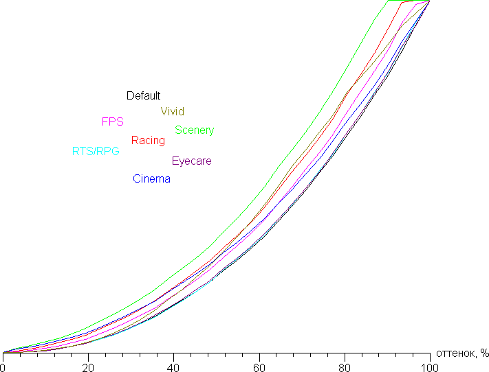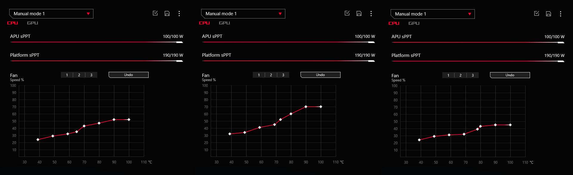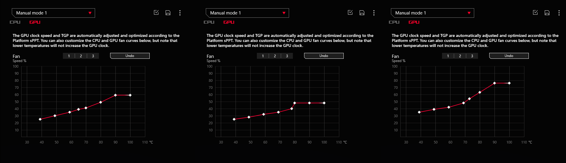 Доступны три главных профиля настроек: Silent, Performance и Turbo. В дополнение к ним имеются также Windows (управление передается операционной системе) и Manual (ручные установки). Особенности работы ноутбука в соответствии с тремя главными профилями мы рассмотрим в разделе тестирования ноутбука под нагрузкой. Профиль Manual дает возможность вручную построить кривую реакции кулеров на нагрев CPU и GPU.