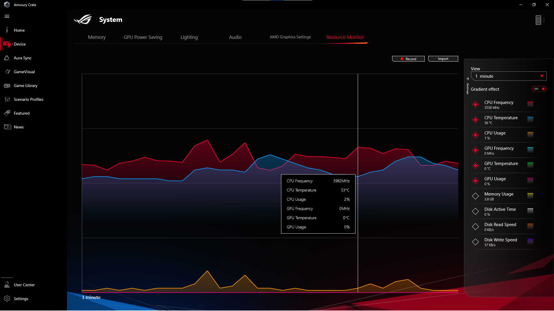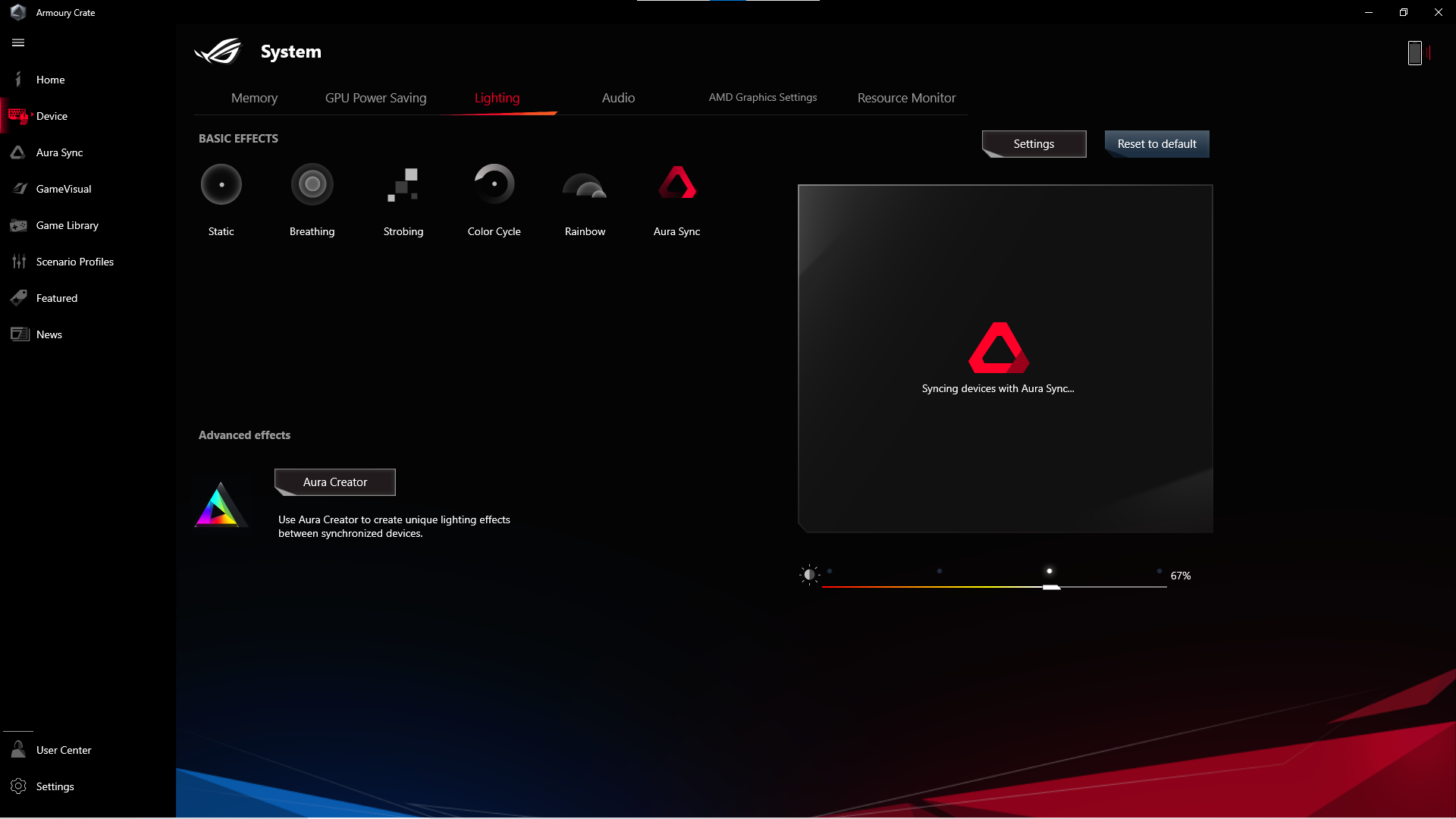 В фирменной утилите Armoury Crate есть управление подсветкой, которое позволяет выбрать один из готовых пресетов и изменить его параметры. Можно быстро перебирать схемы и менять яркость подсветки прямо с клавиатуры.