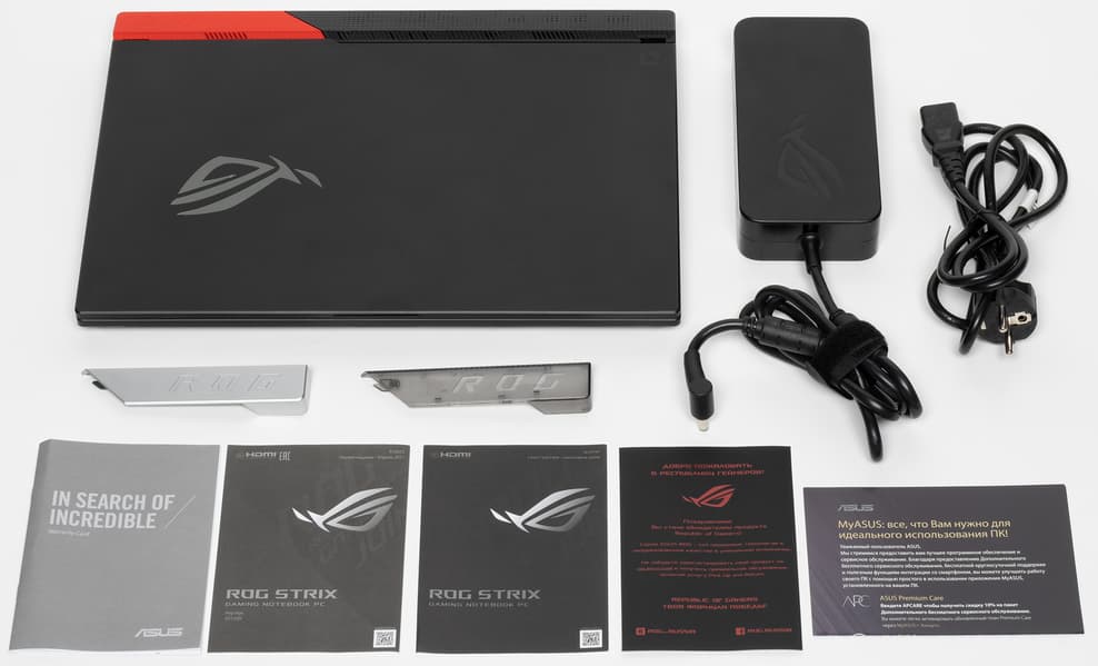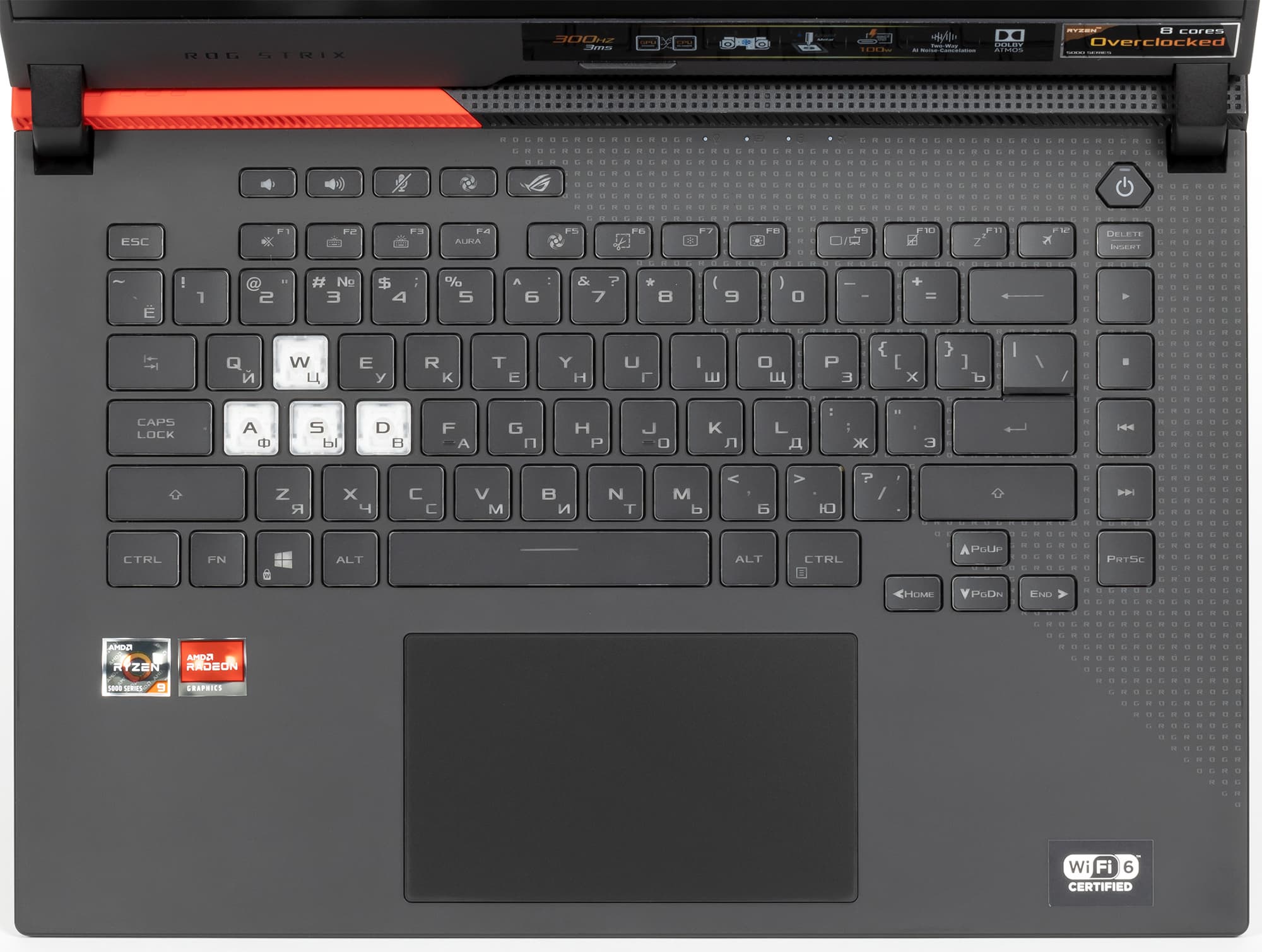 Заметим, что «те», то есть специалисты Asus, не стали менять облик ноутбуков ROG радикальным образом, а ограничились тюнингом: вставили красный уголок в корпус (он изначально был заменяемым) и использовали на лицевой панели две голографические наклейки с указанием на вышеупомянутый тандем.