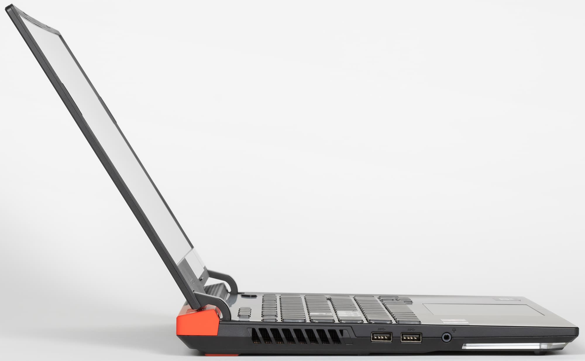Ноутбук обладает достаточно большим экраном (15,6 дюйма по диагонали), и с учетом этого обстоятельства машина просто не могла получиться компактной. Ее толщина составляет 28 мм без учета опор, поэтому и слово «тонкий» здесь упоминать неуместно. Металл, обеспечивающий прочность компонентов корпуса и эффективность системы охлаждения, обуславливает изрядный вес — 2,33 кг по нашим данным (2,4 кг по сведениям производителя).